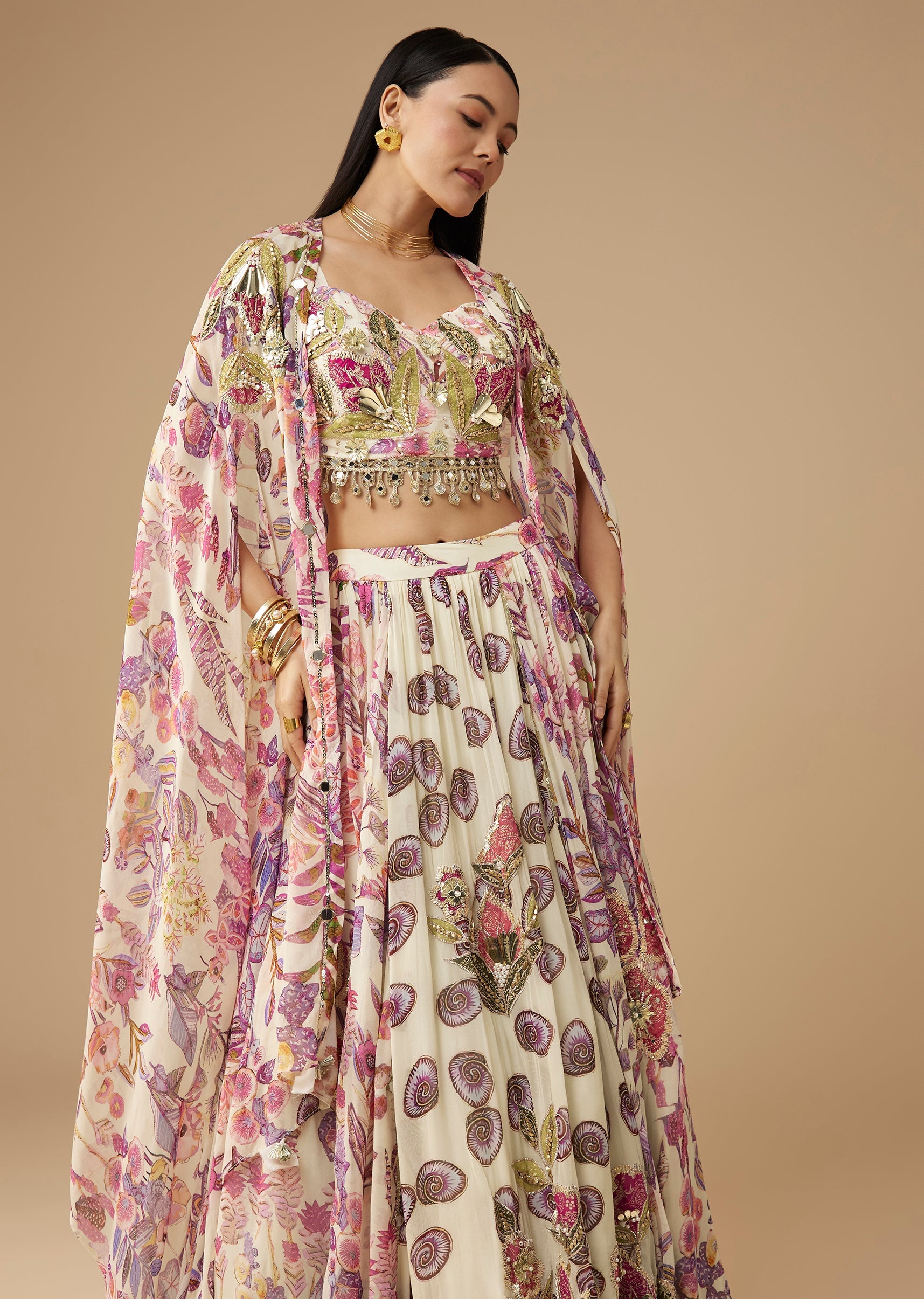 Create a contemporary festive look with this cream georgette lehenga set, featuring a printed choli adorned with delicate gotta lace and sequin work for a soft, elegant sparkle. The coordinated jacket-style cape adds a stylish layered touch, complementing the flowy georgette lehenga for a graceful, modern silhouette. Perfect for sangeets, weddings, or celebratory gatherings, this ensemble blends traditional detailing with a fresh charm. Awarded as the Most Trusted Brand, we're delivering styles you love, just as promised.