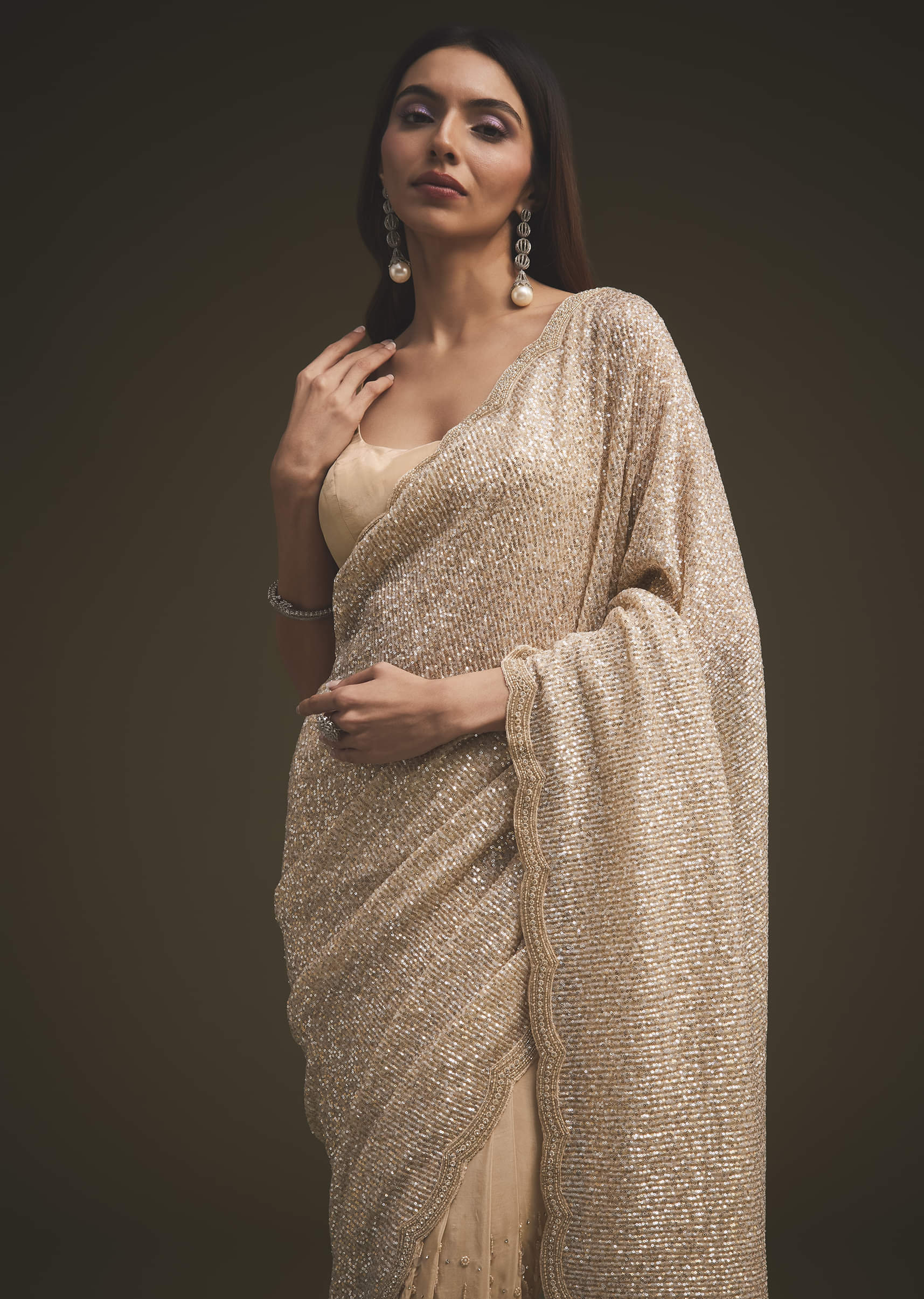 Cream gold half and half saree in organza with cut dana and sequins hand embroidery. It comes with a lycra net pallu with sequins work all over. The saree has a scalloped border adorned with cut dana and kundan detailing. Paired with a matching unstitched blouse piece. Awarded as the Most Trusted Brand, we're delivering styles you love, just as promised.