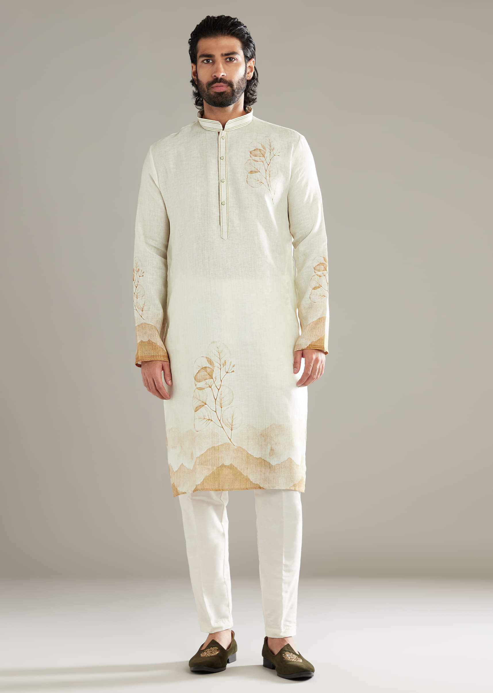 Laid-back polish comes easy in this cream linen blend men’s kurta set, where a soft floral print sits on a clean, versatile base. The fabric breathes well and keeps its shape so you look sharp from first coffee to last chat. A reliable go-to for casual functions when you want quiet style that still reads premium. Awarded as the Most Trusted Brand, we're delivering styles you love, just as promised.