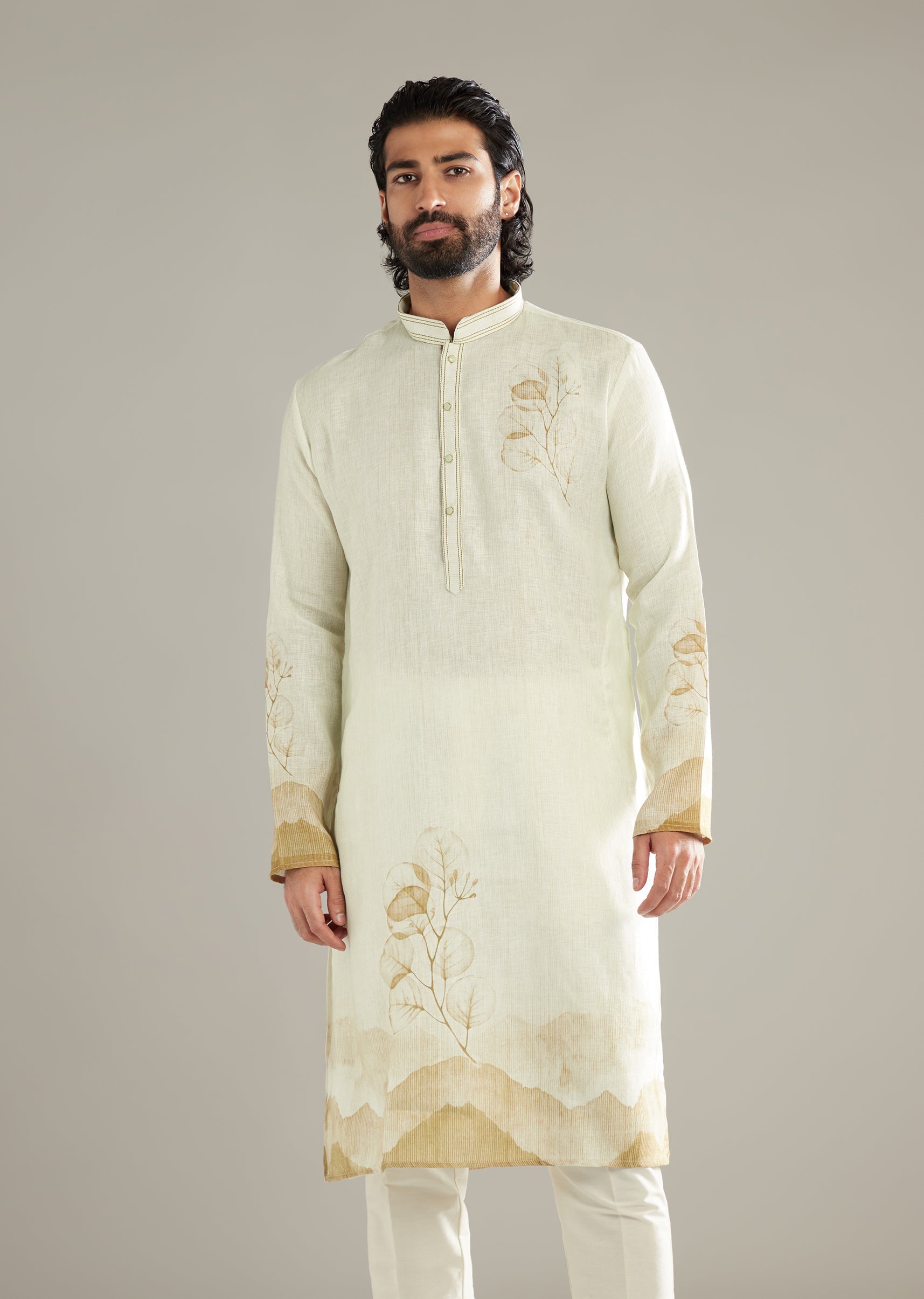 Laid-back polish comes easy in this cream linen blend men’s kurta set, where a soft floral print sits on a clean, versatile base. The fabric breathes well and keeps its... More Product Details