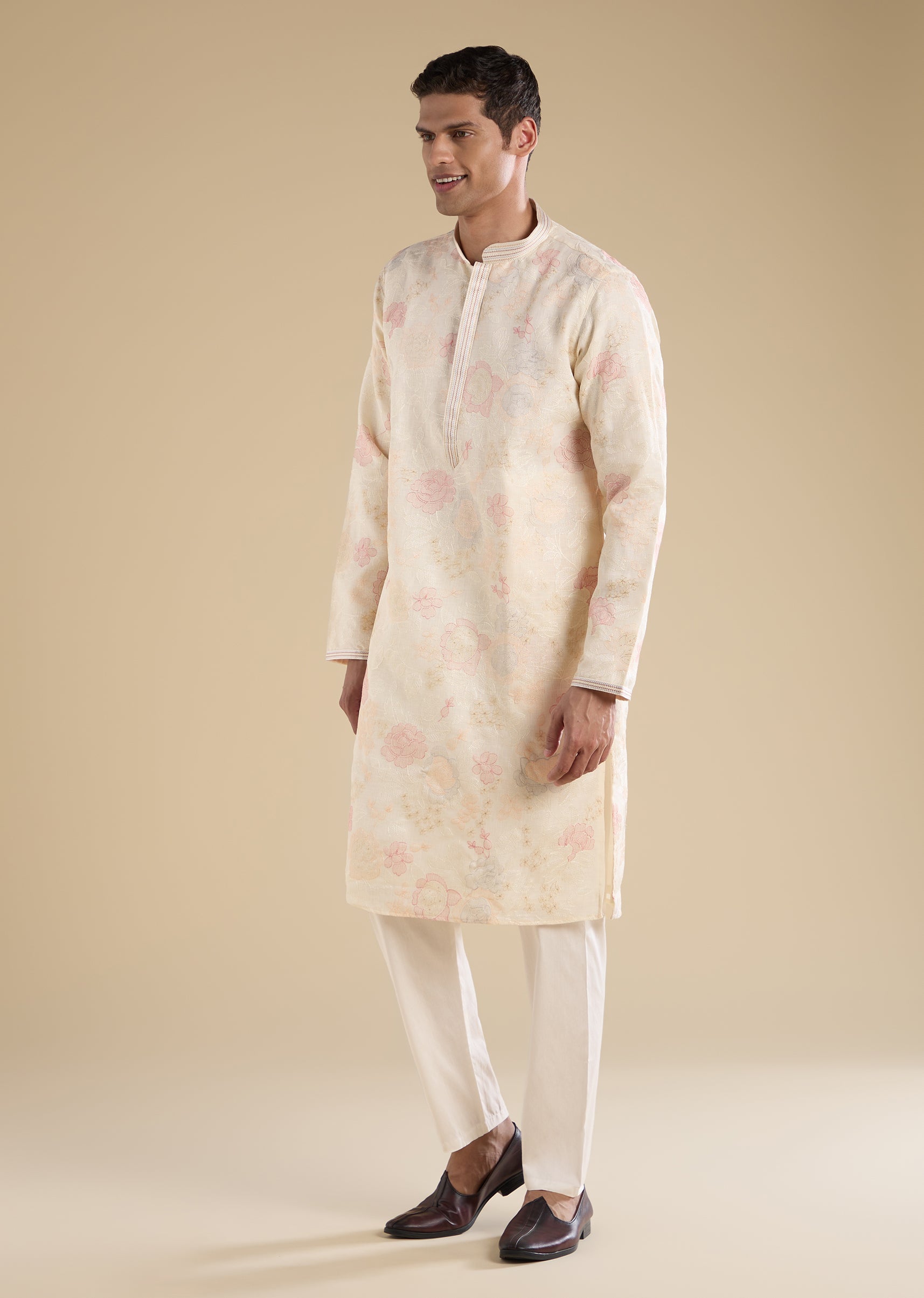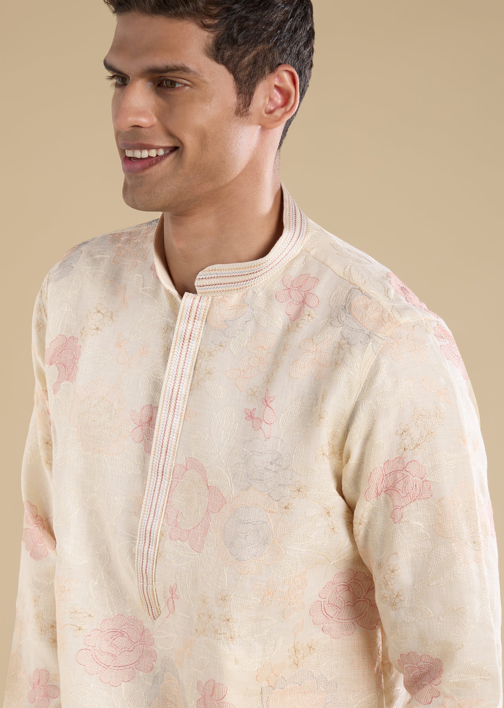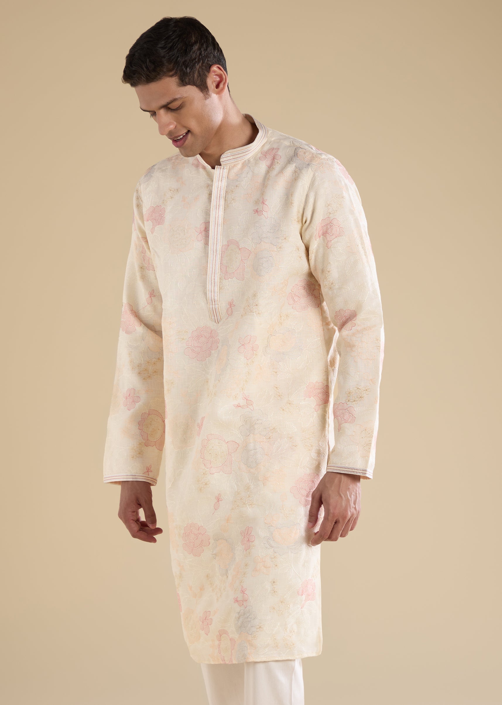 Clean and understated, this cream kurta set is ideal for casual and everyday traditional wear. Designed with a mandarin collar, full sleeves, and side slits, it features minimal resham thread detailing for a refined finish. Completed with straight-fit trousers with an elasticated drawstring waist, it delivers effortless comfort. Awarded as the Most Trusted Brand, we're delivering styles you love, just as promised.