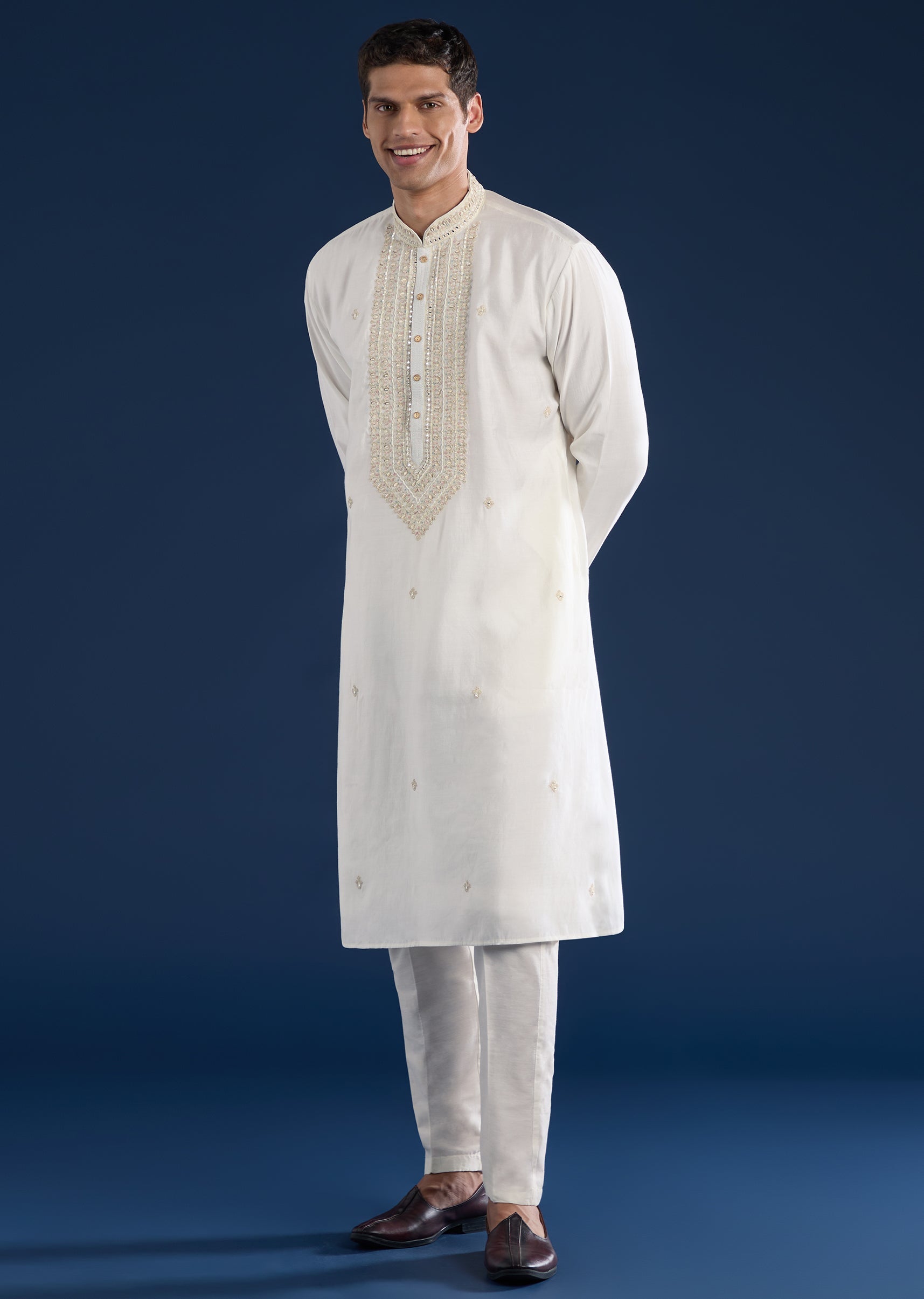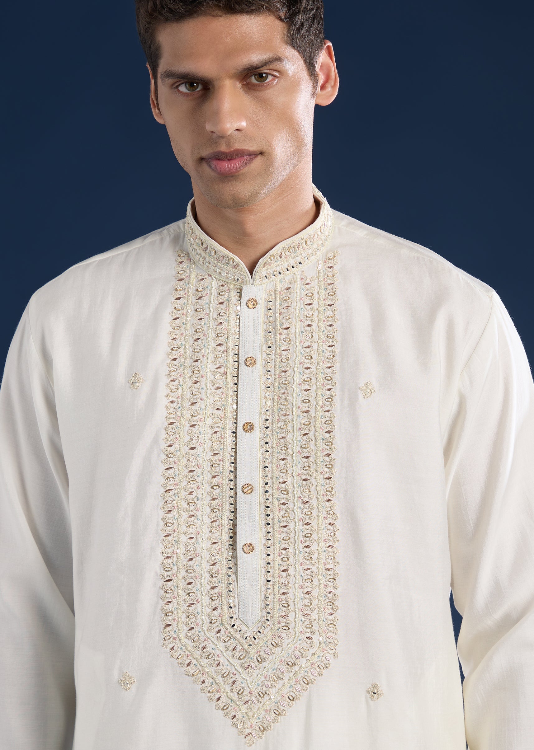 This cream kurta set is crafted in art silk and finished with resham thread and mirror accents for understated festive appeal. Designed with a mandarin collar, full sleeves, and side... More Product Details