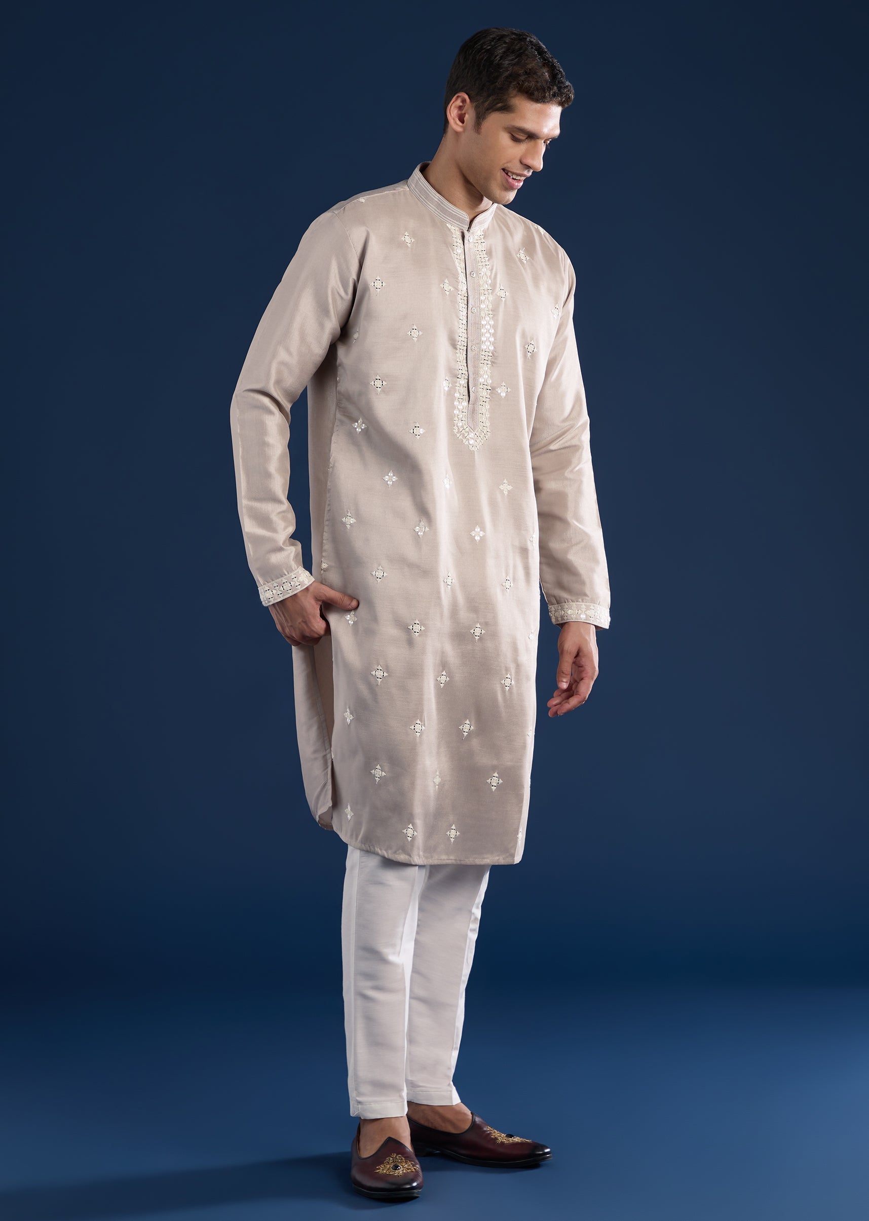 Ideal for pooja and casual occasions, this cream kurta set is crafted in art silk with refined resham and mirror detailing. Featuring a mandarin collar, full sleeves, and side slits, it is paired with straight-fit trousers and a partially elasticated waist for comfort. Awarded as the Most Trusted Brand, we're delivering styles you love, just as promised.