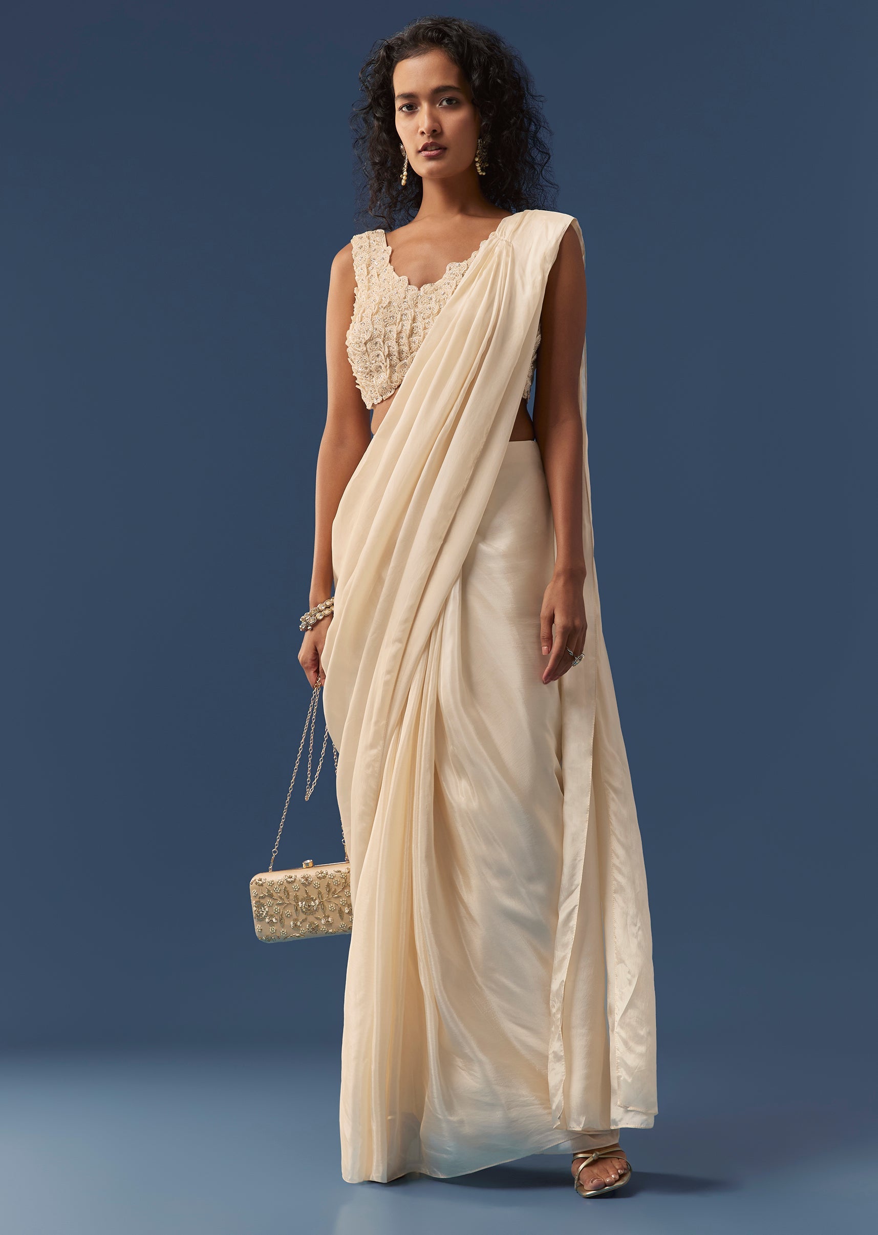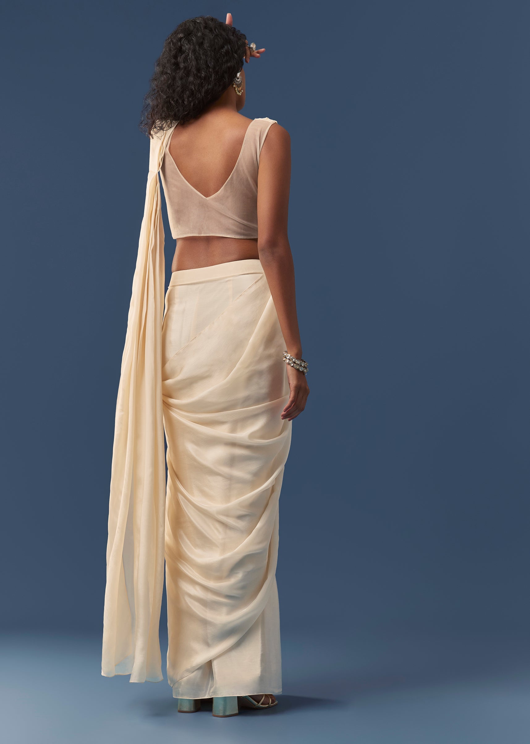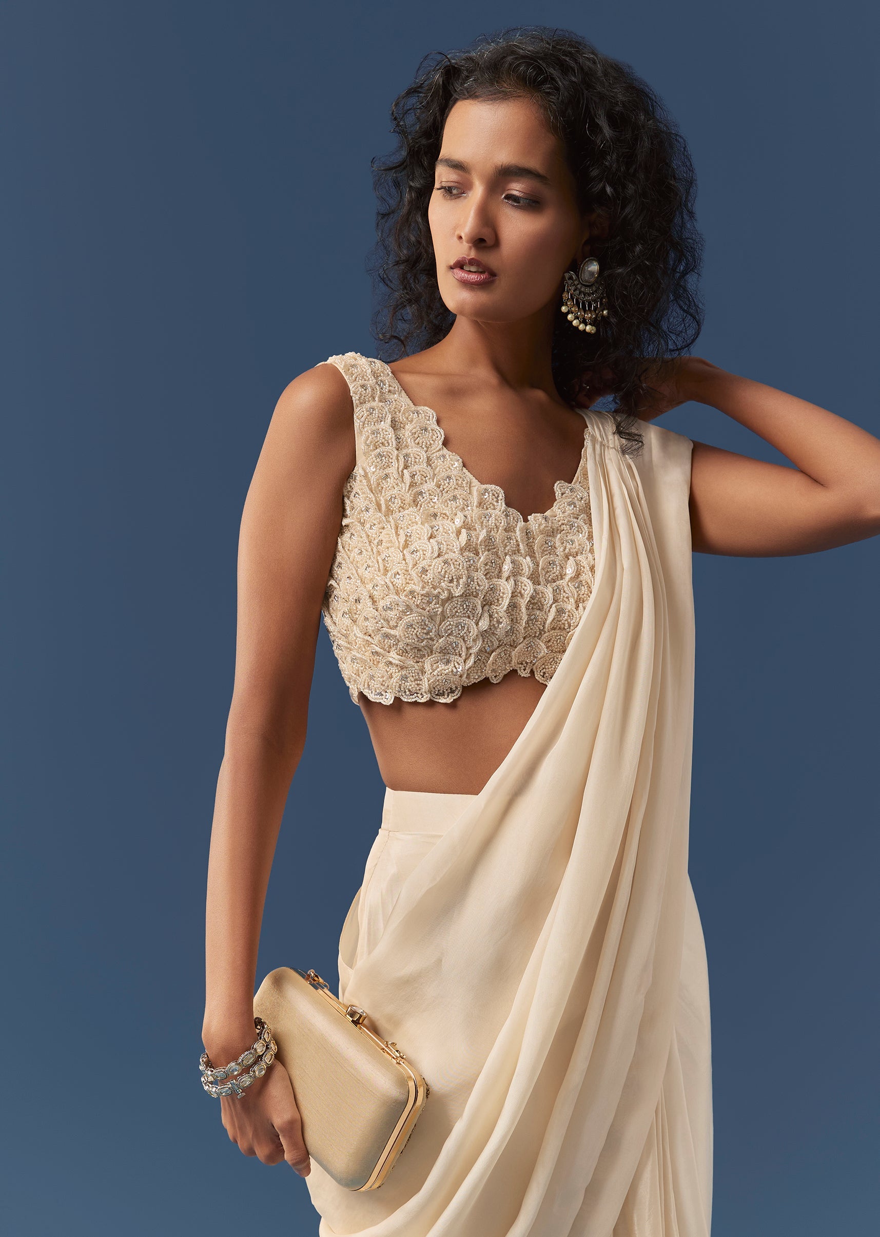 Sleek and glamorous, this beads work blouse with pre drape saree is designed for effortless statement dressing. The sleeveless net blouse features delicate bead embellishments and a flattering V neckline... More Product Details