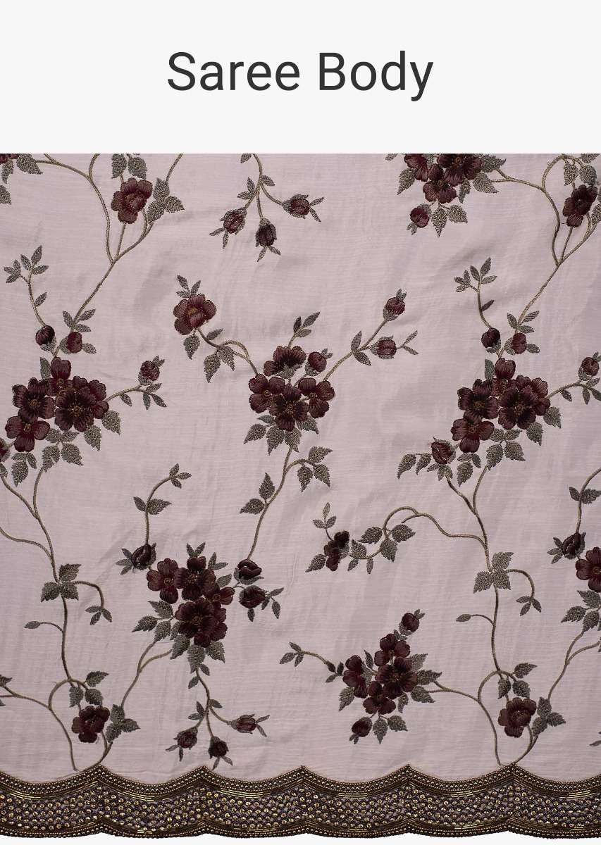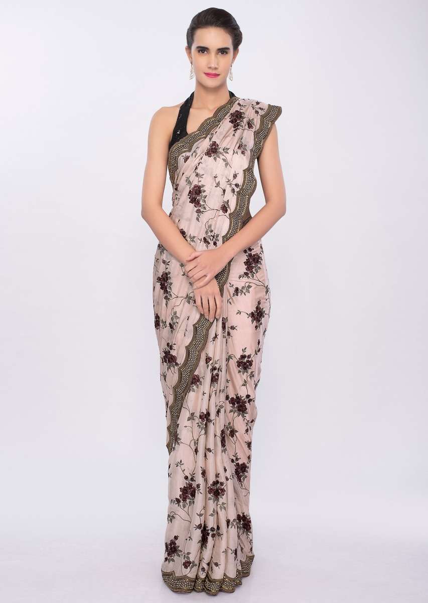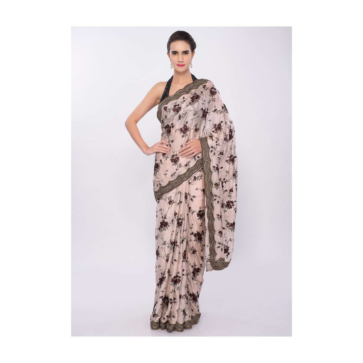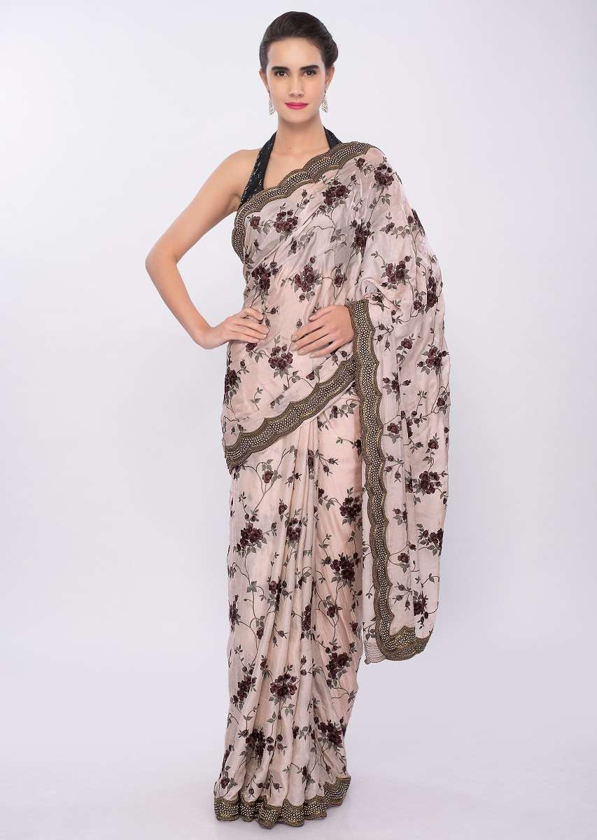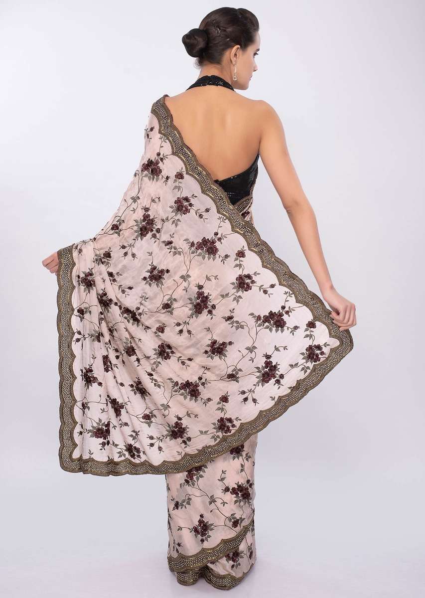 Cream puff satin chiffon saree in floral jaal embroidery and scallop embroidered border only on Kalki