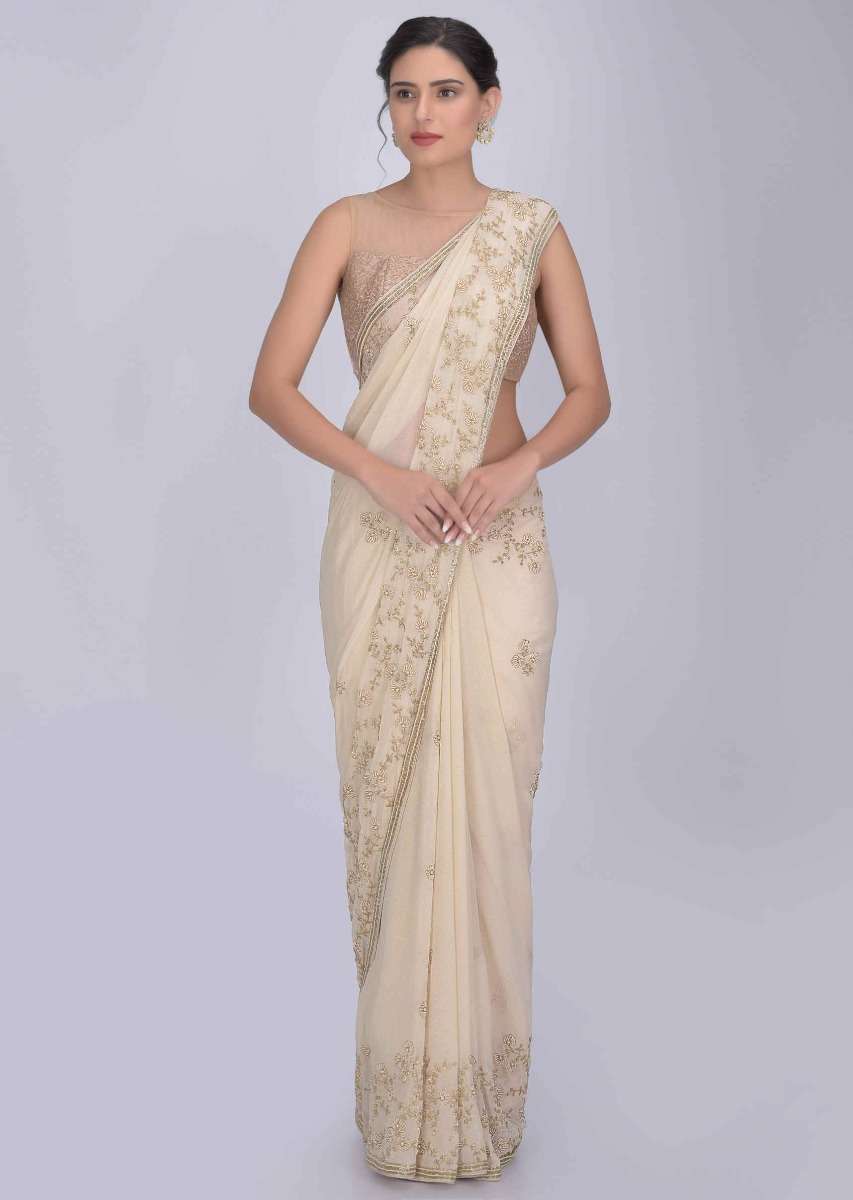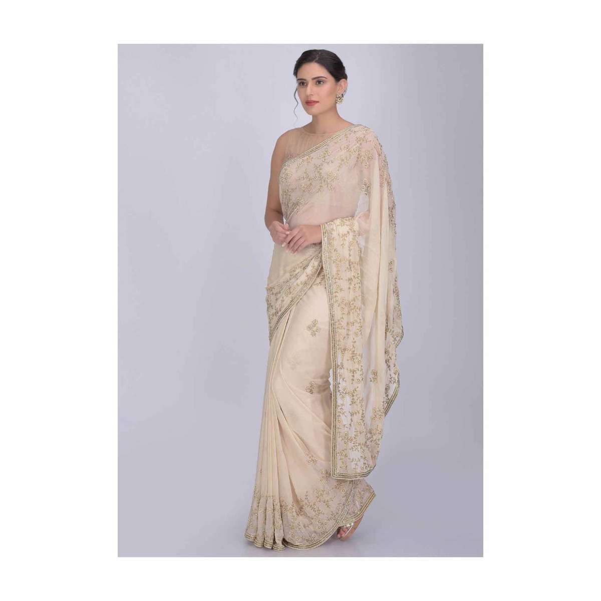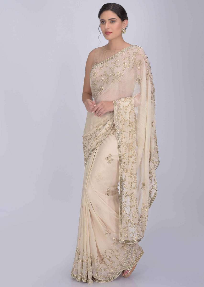 Cream Saree In Shimmer Georgette With Matching Blouse Piece Online - Kalki Fashion