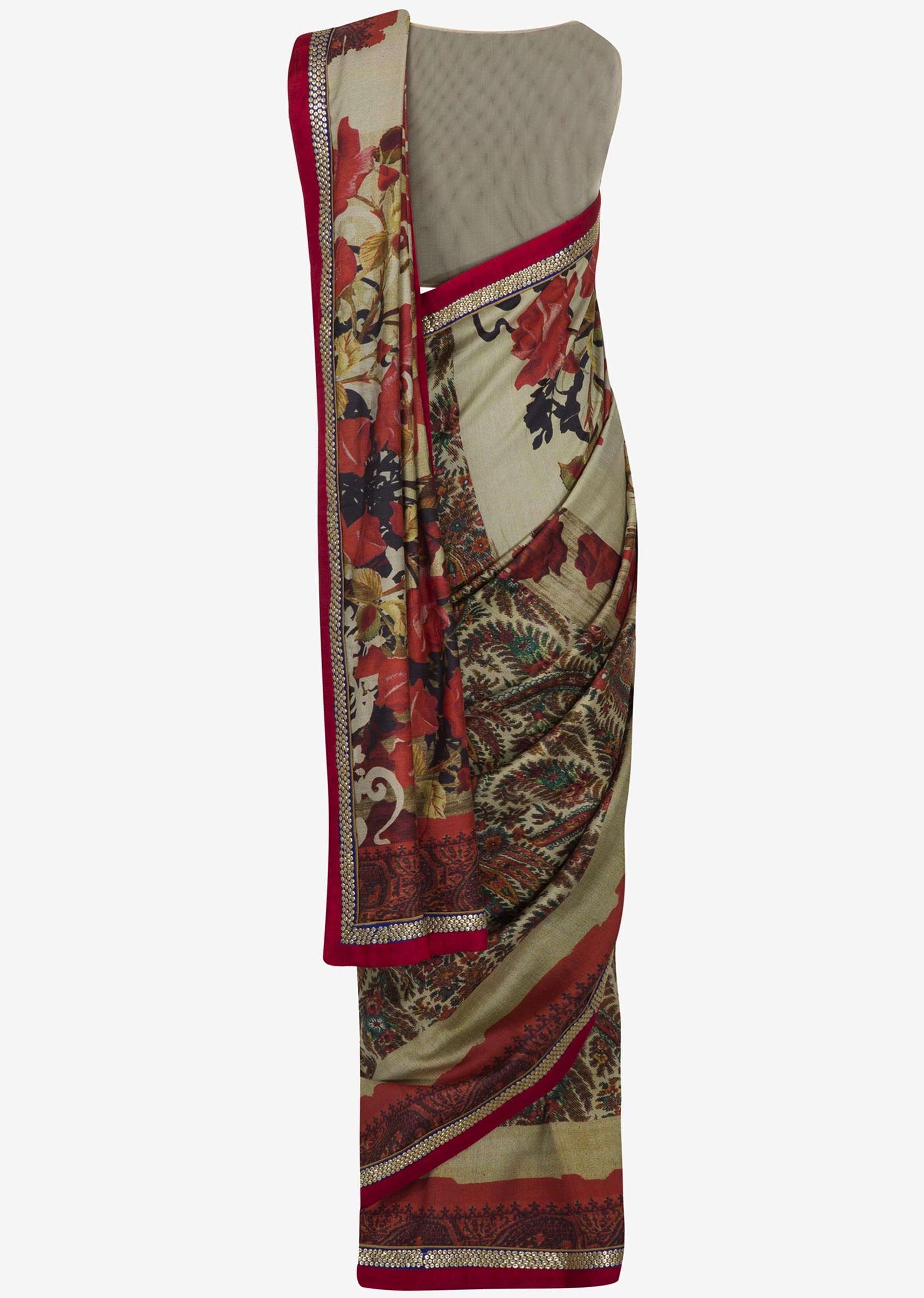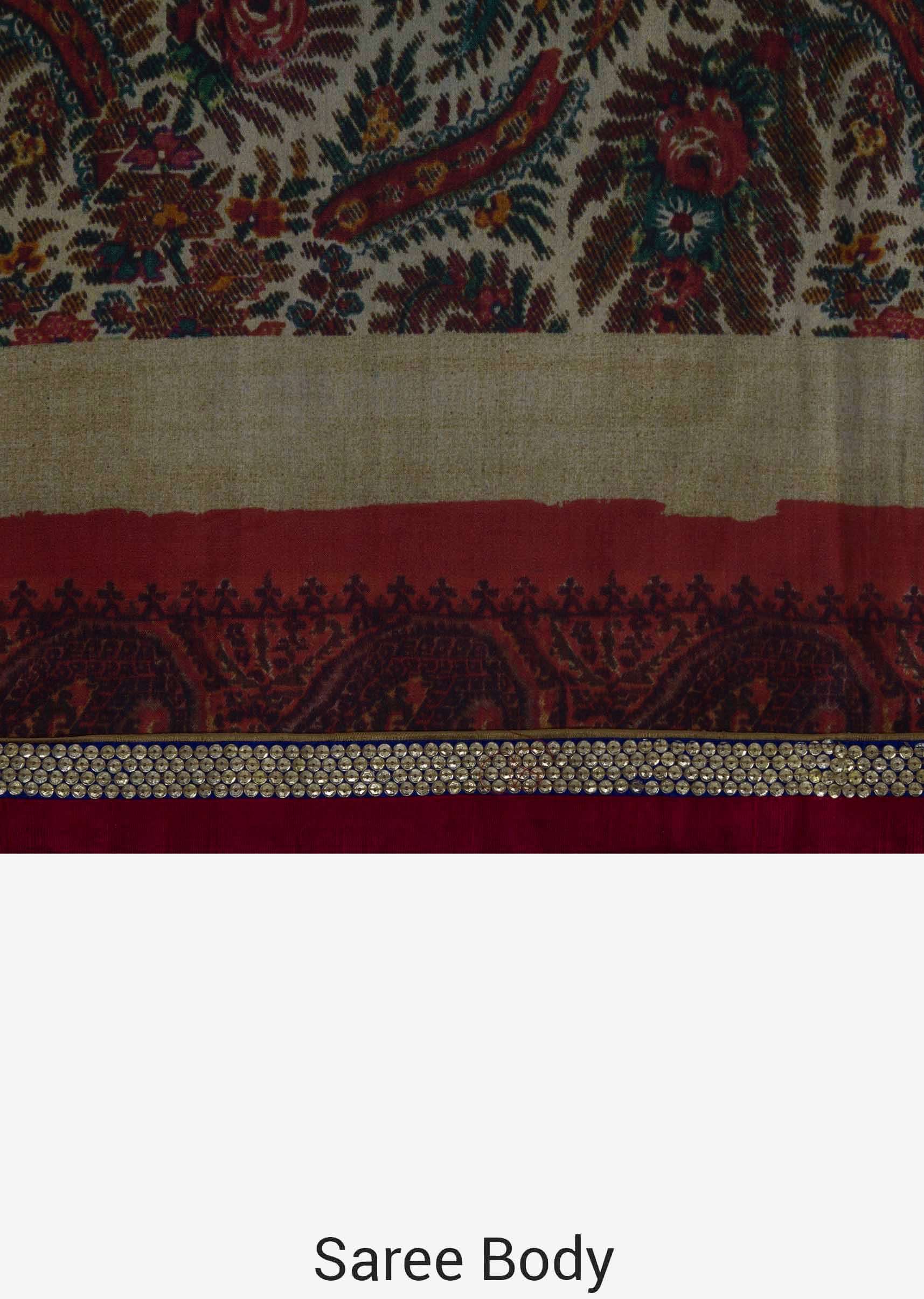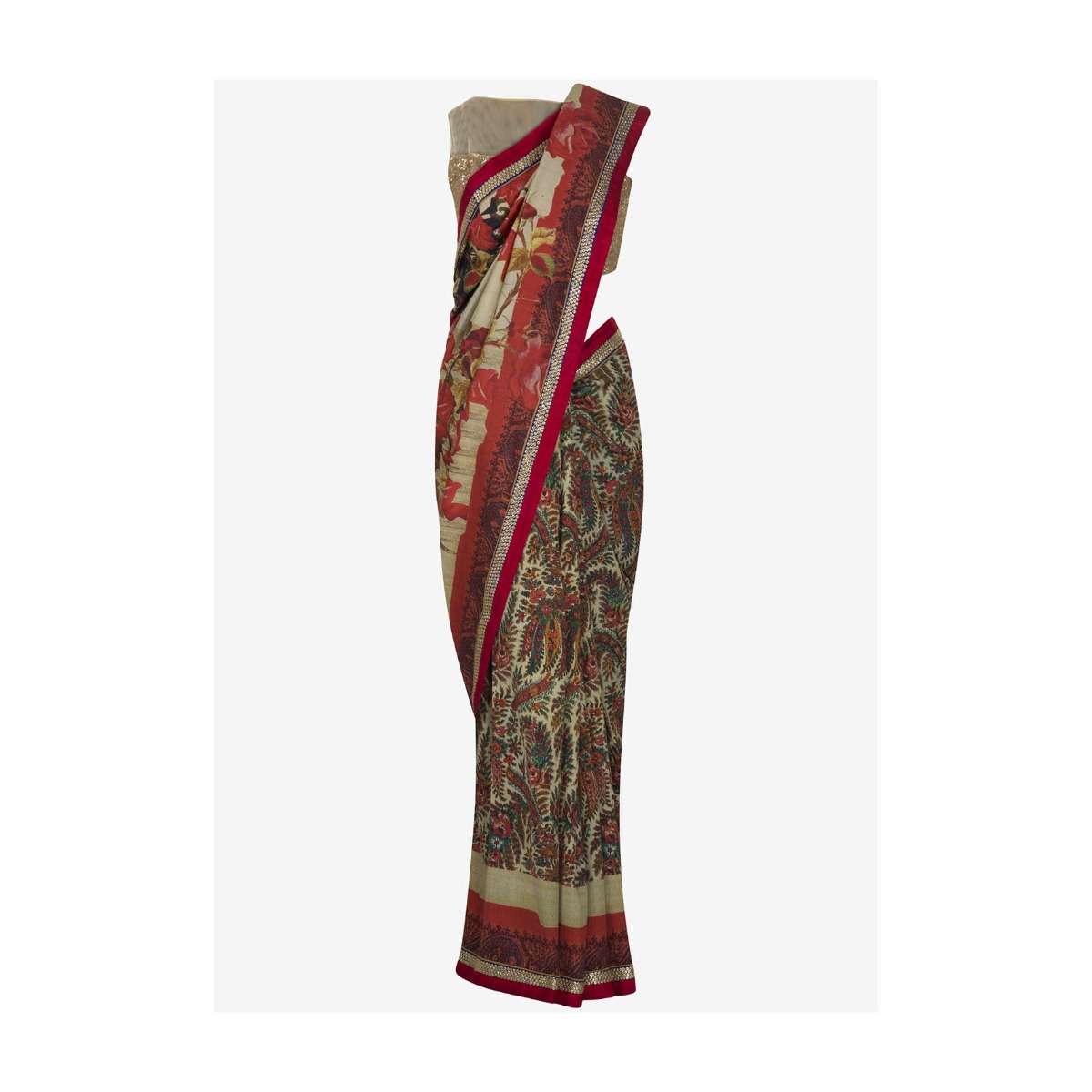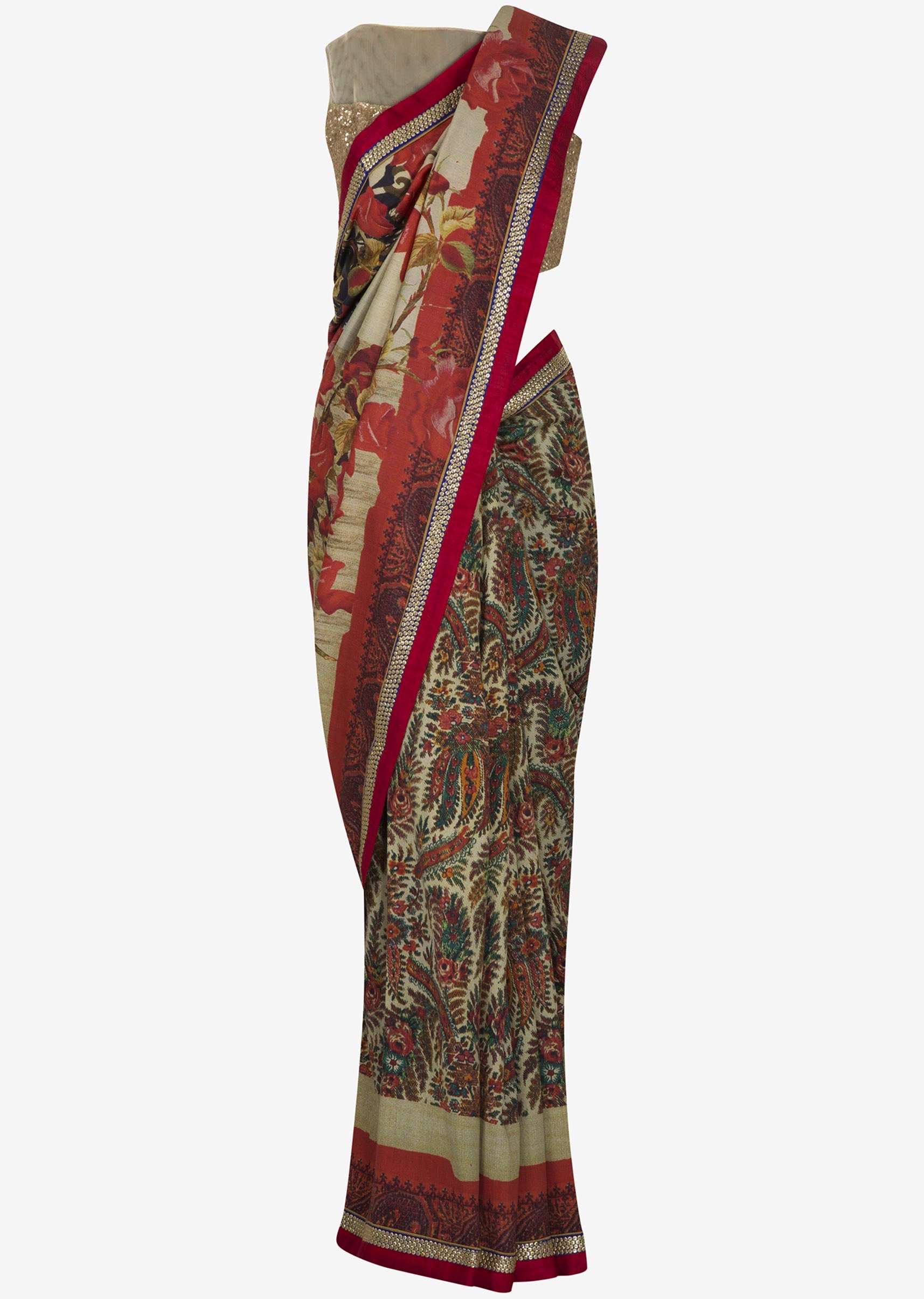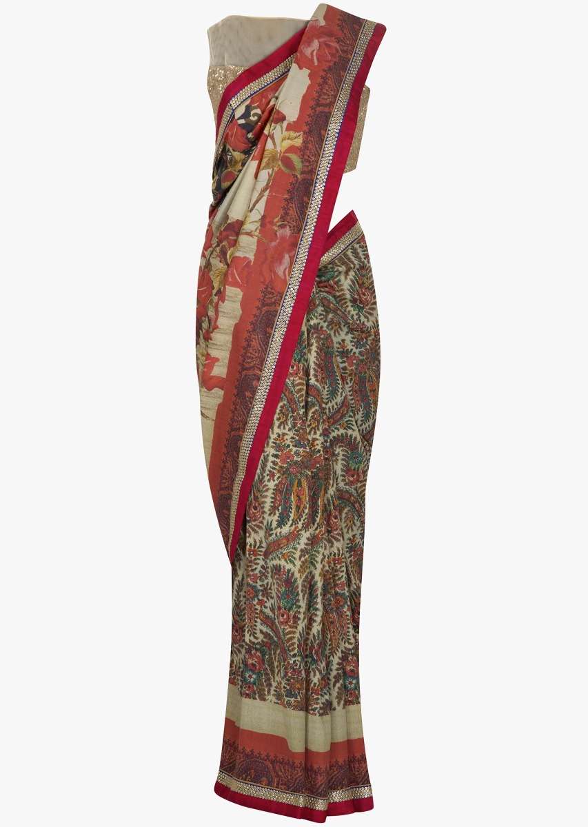Cream Saree With Print And Sequins Embroidery Online - Kalki Fashion