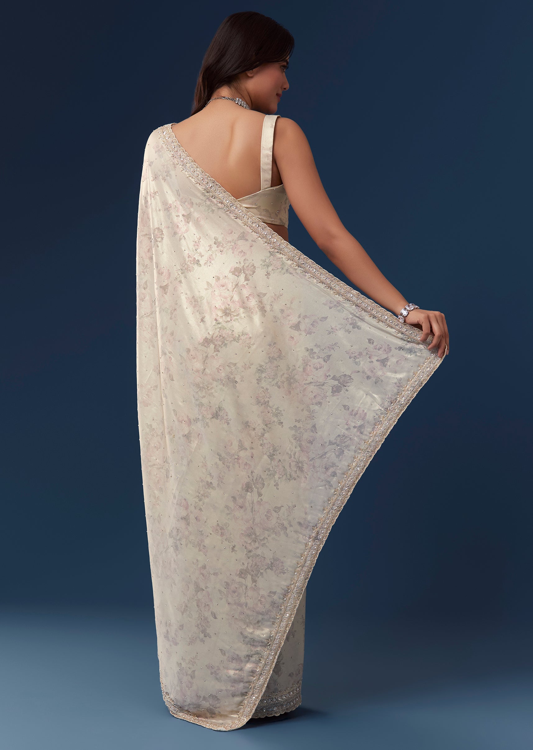 Cream Satin Saree With Purple Floral Print And Embroidered Border