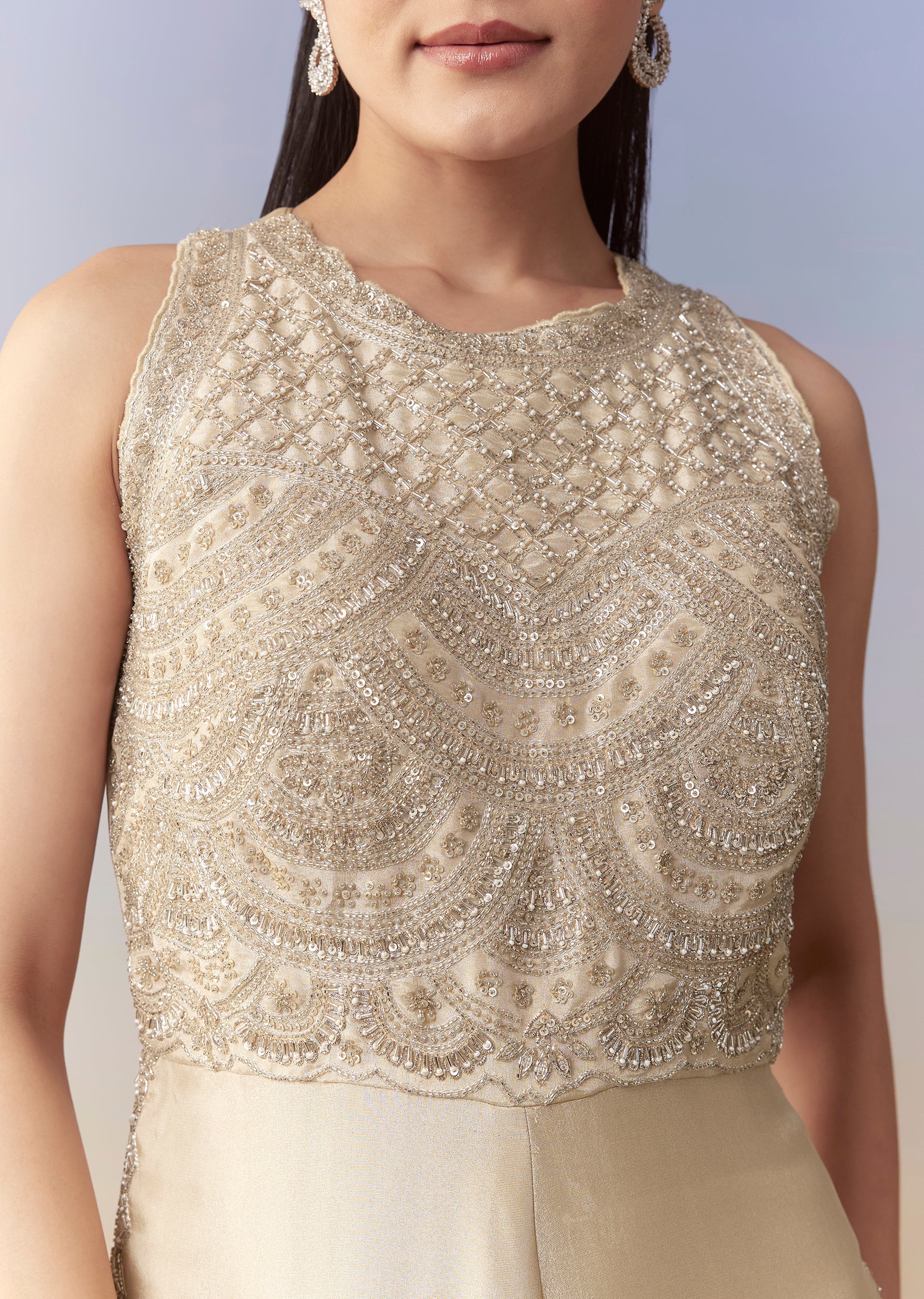 Add a touch of refined glamour with this cream tissue jumpsuit, embellished with sequins and cutdana work that brings subtle festive sparkle. The lightweight tissue fabric offers an elegant sheen... More Product Details