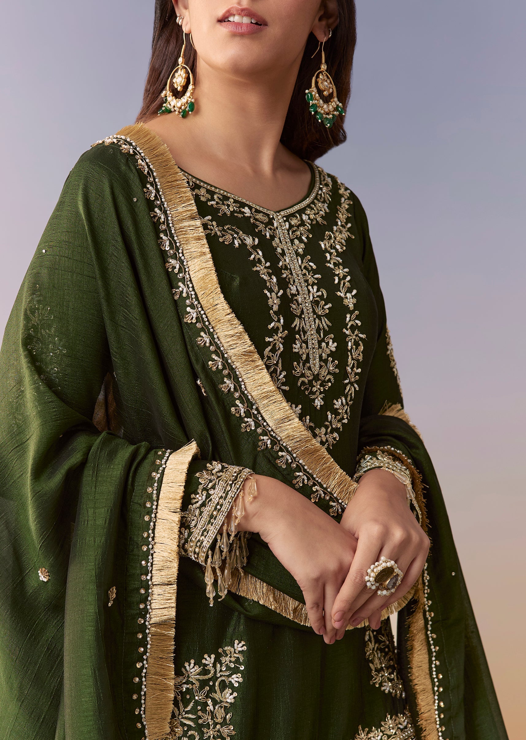 Crafted in pure silk, this dark green straight-fit kurta is adorned with intricate zardosi embroidery and a flattering V-neckline. Paired with a flared sharara featuring a mid-waist, partially elasticated fit... More Product Details