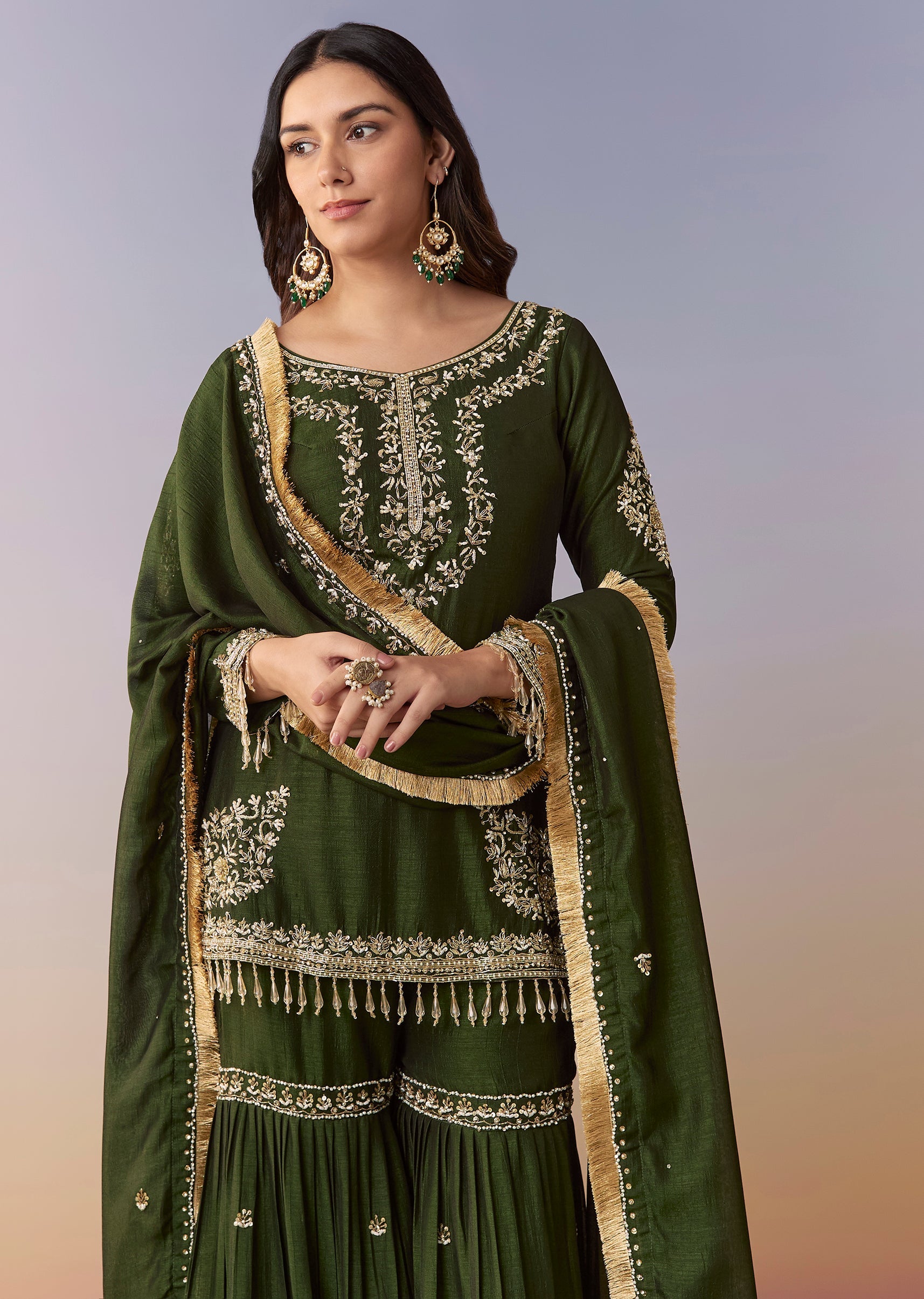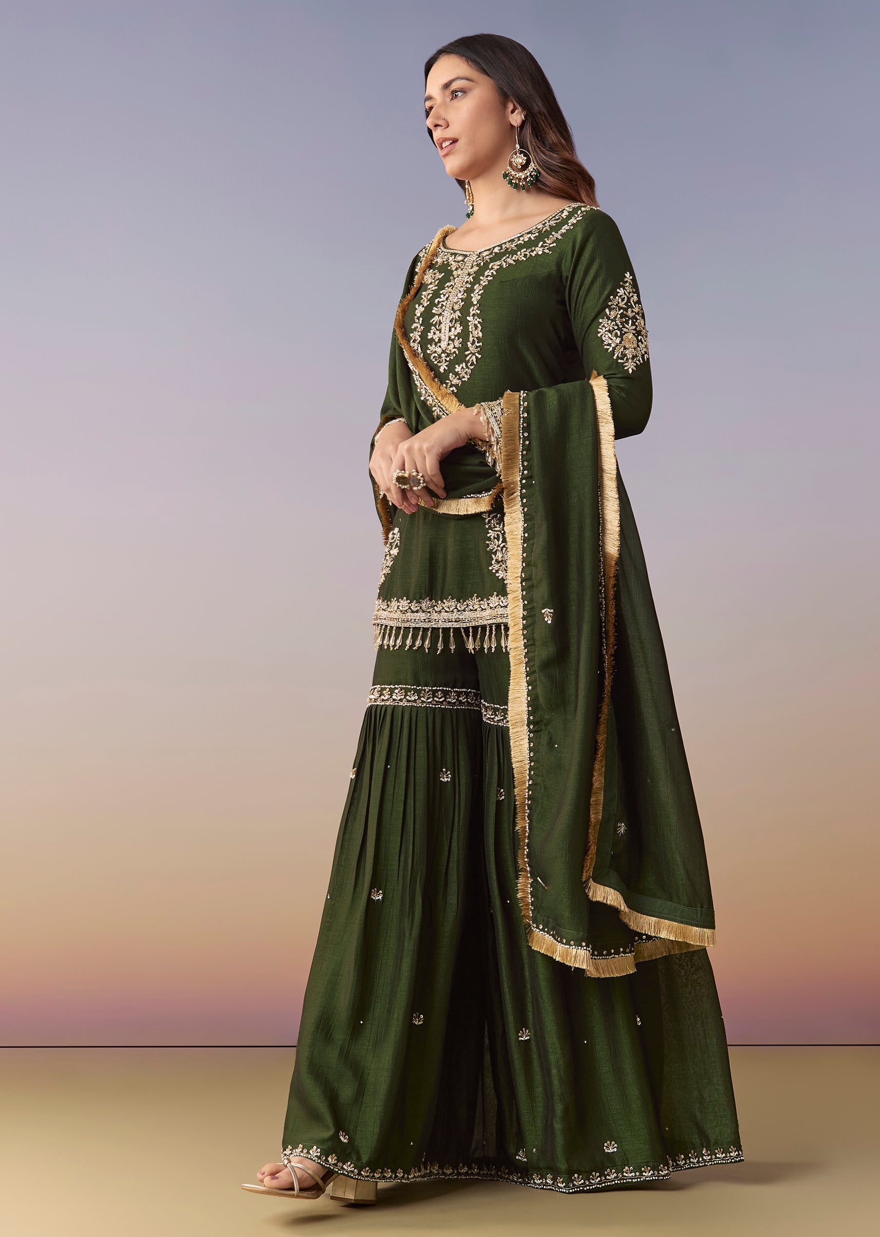 Dark Green Zardosi Sharara Suit Set With Dupatta