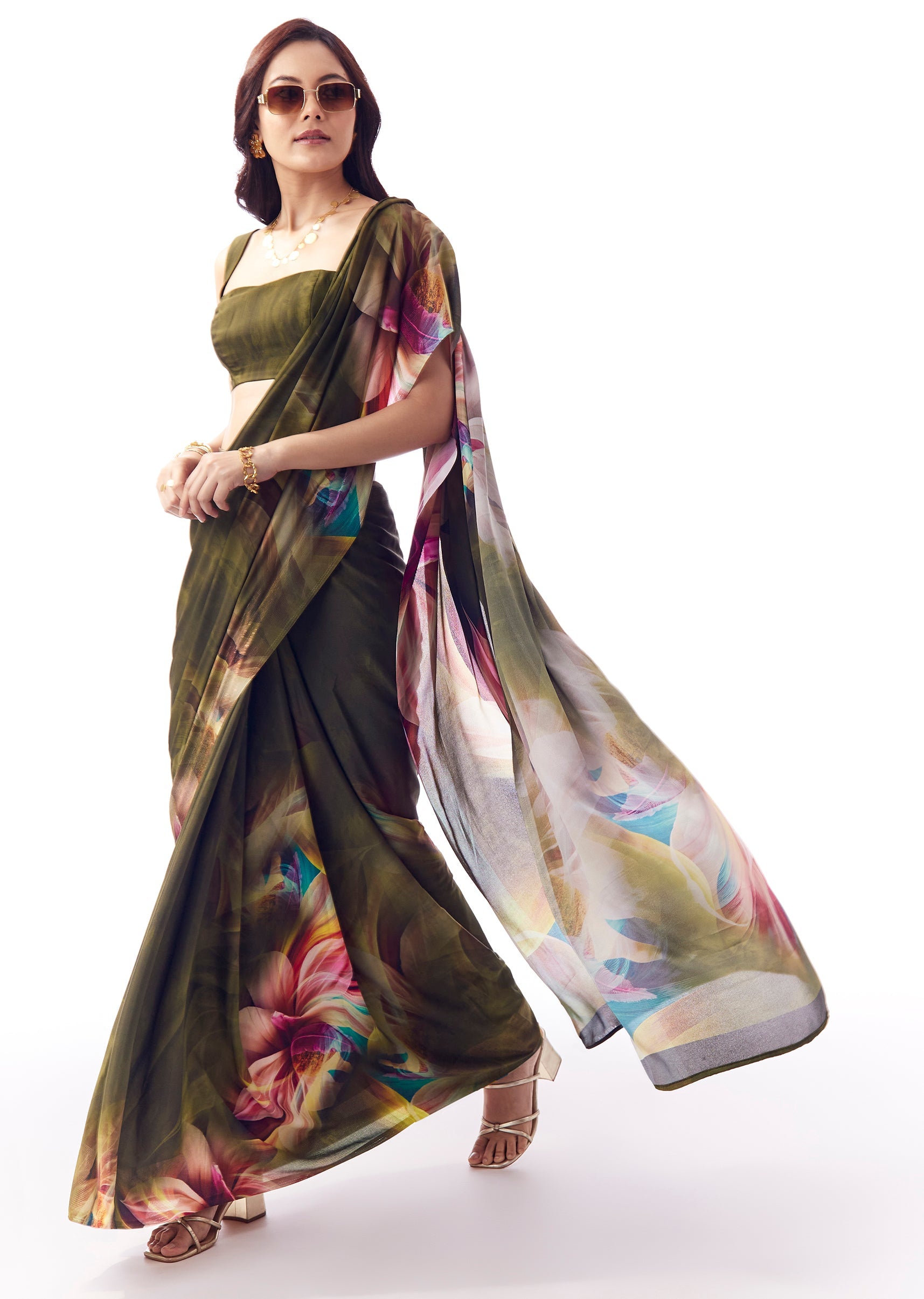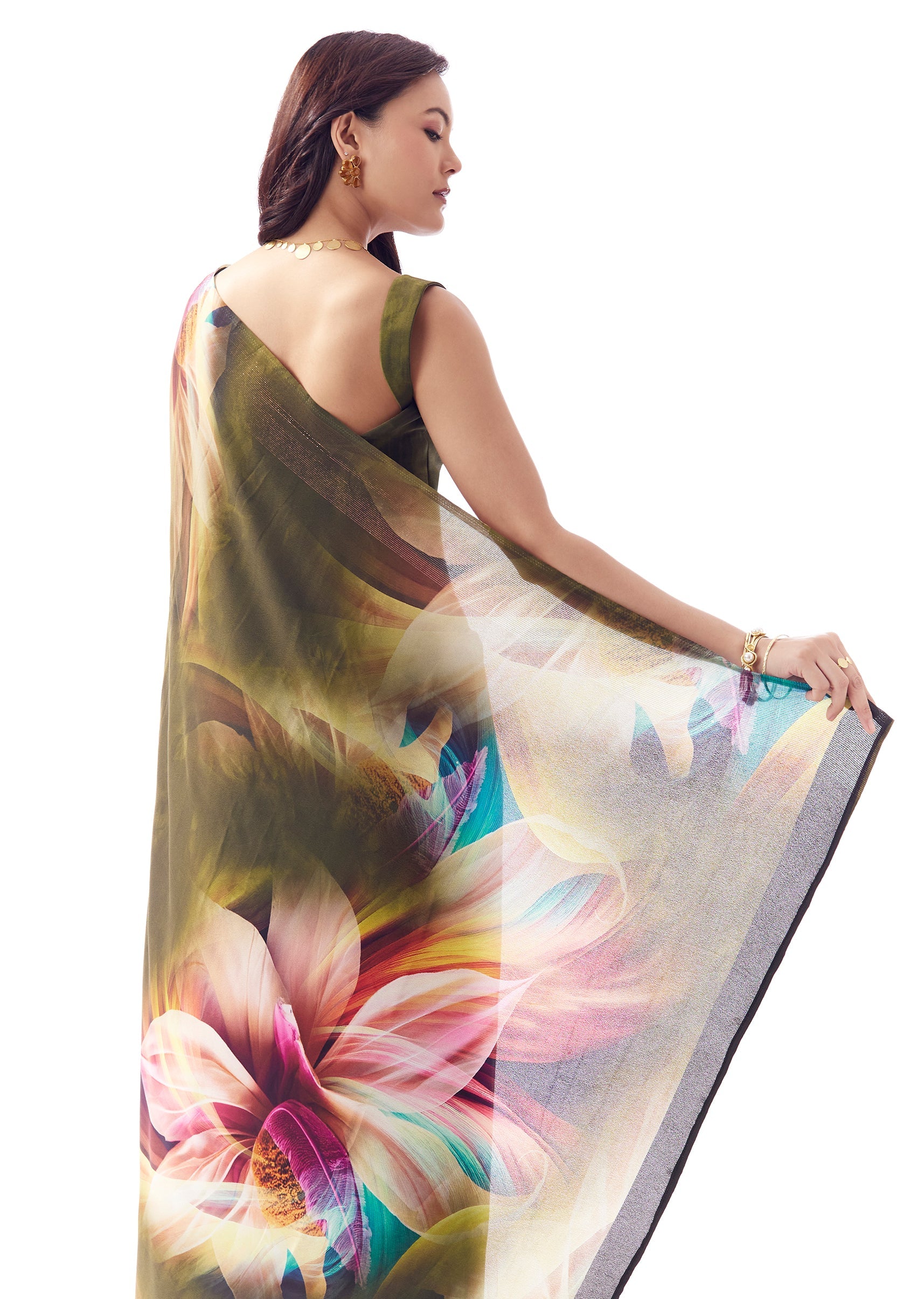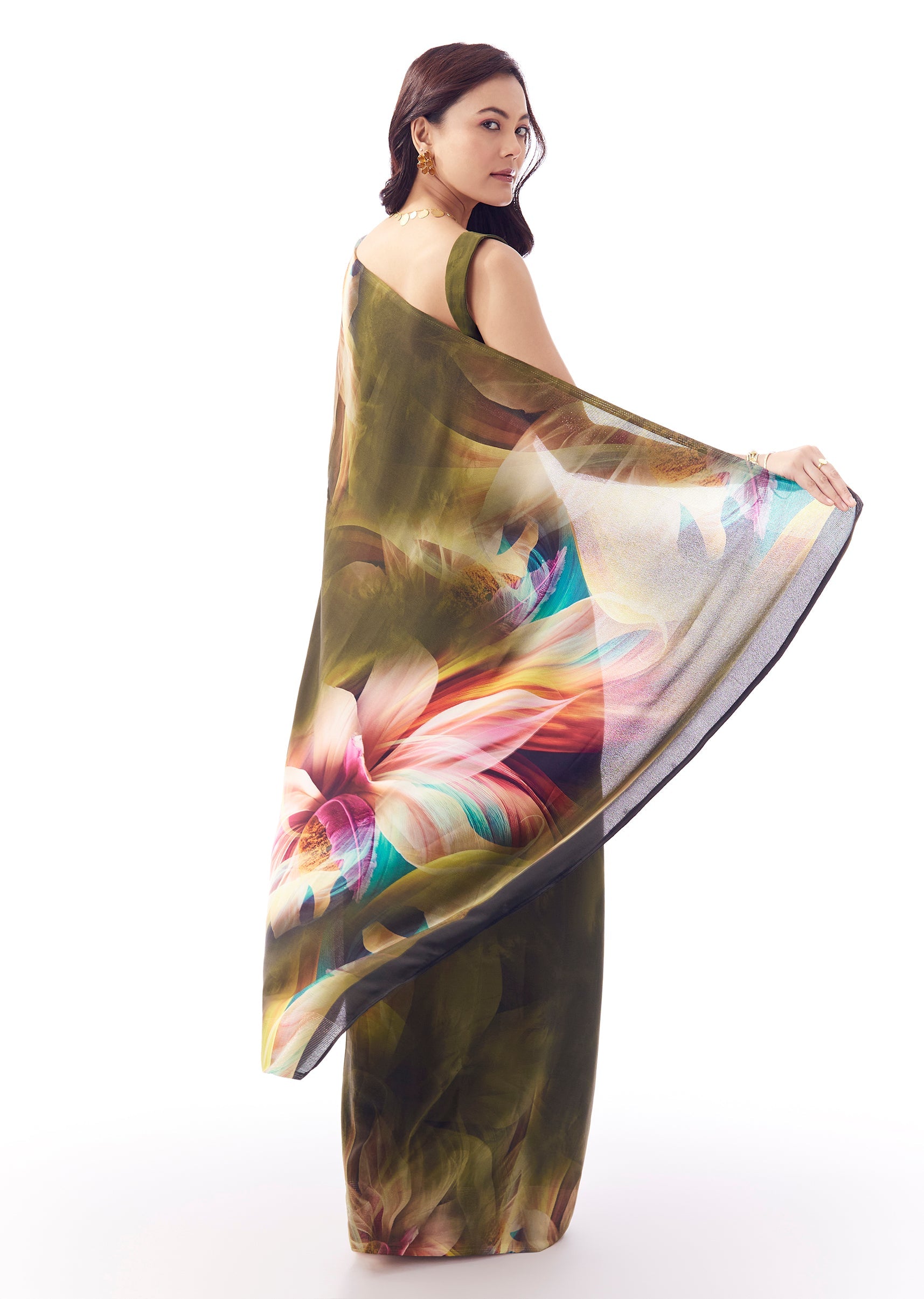 Dark Olive Green Georgette Saree With Multicolour Floral Print