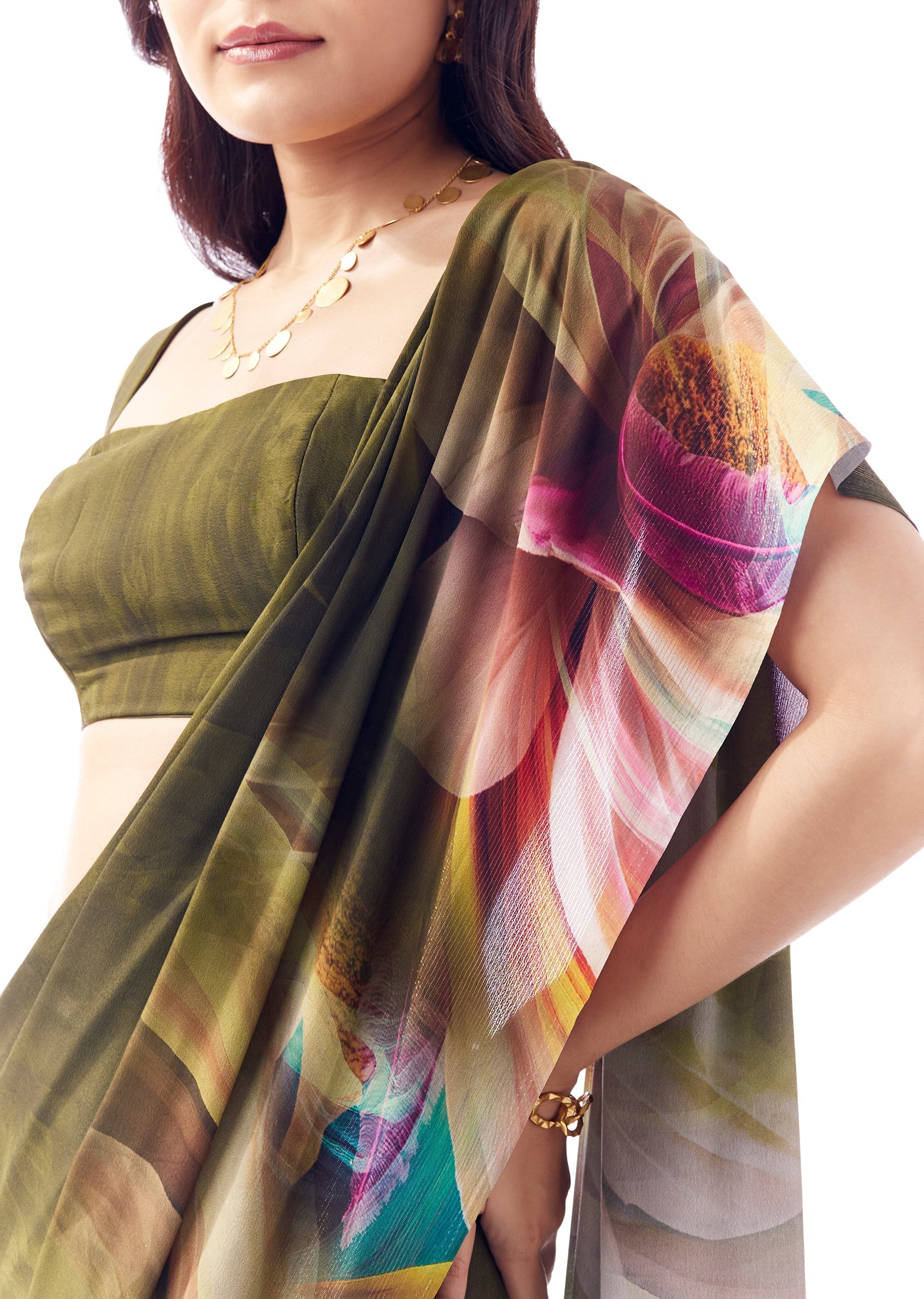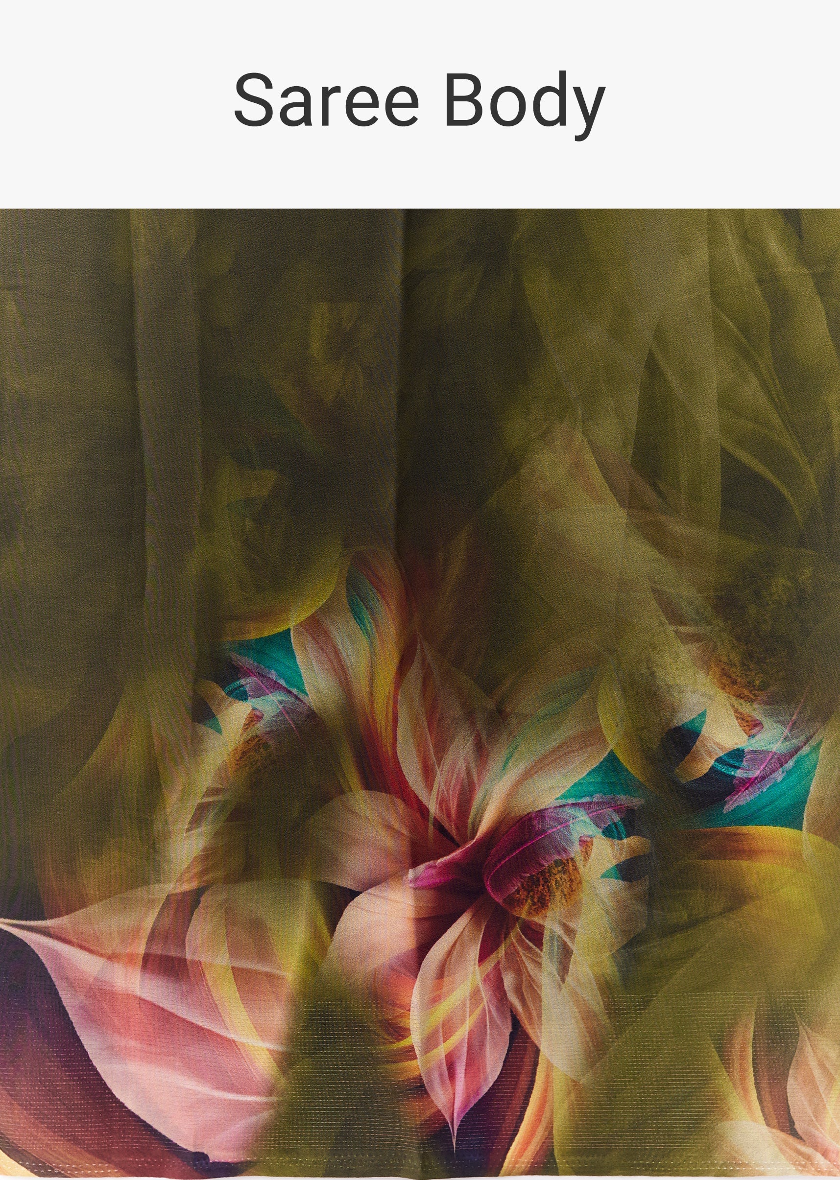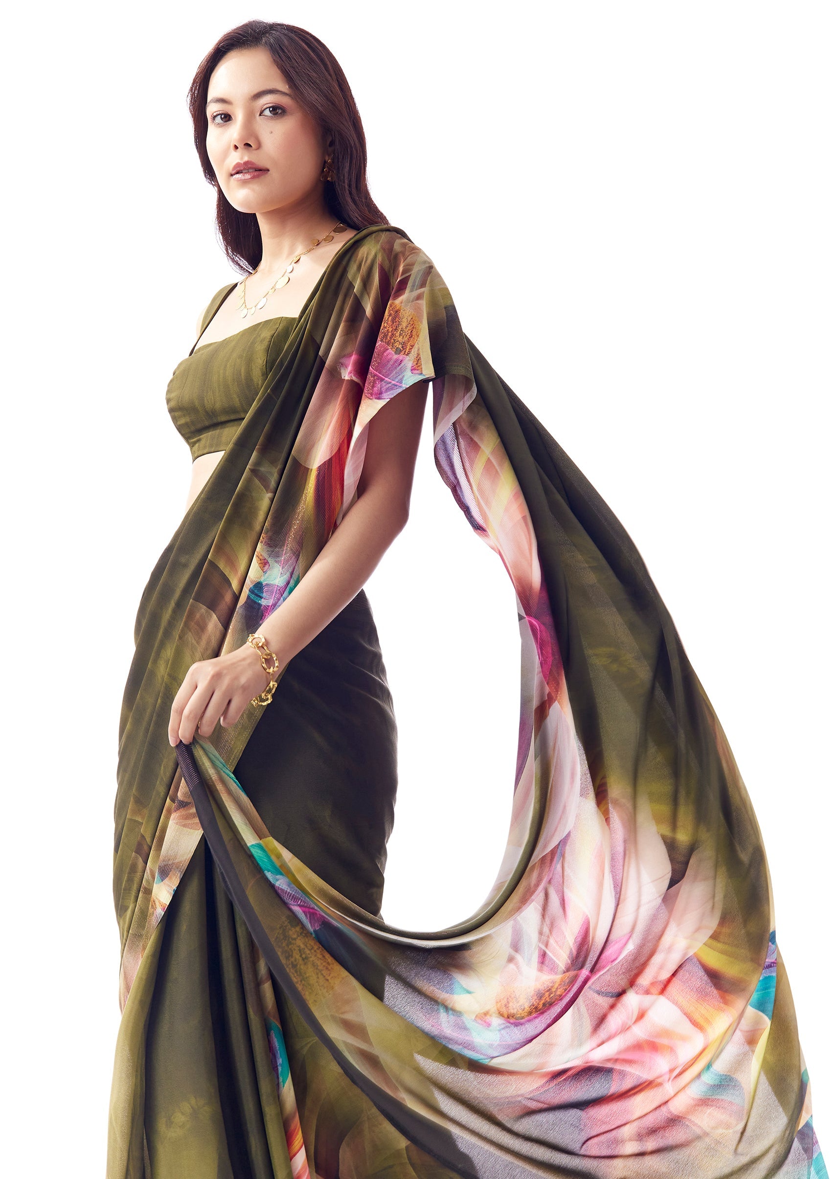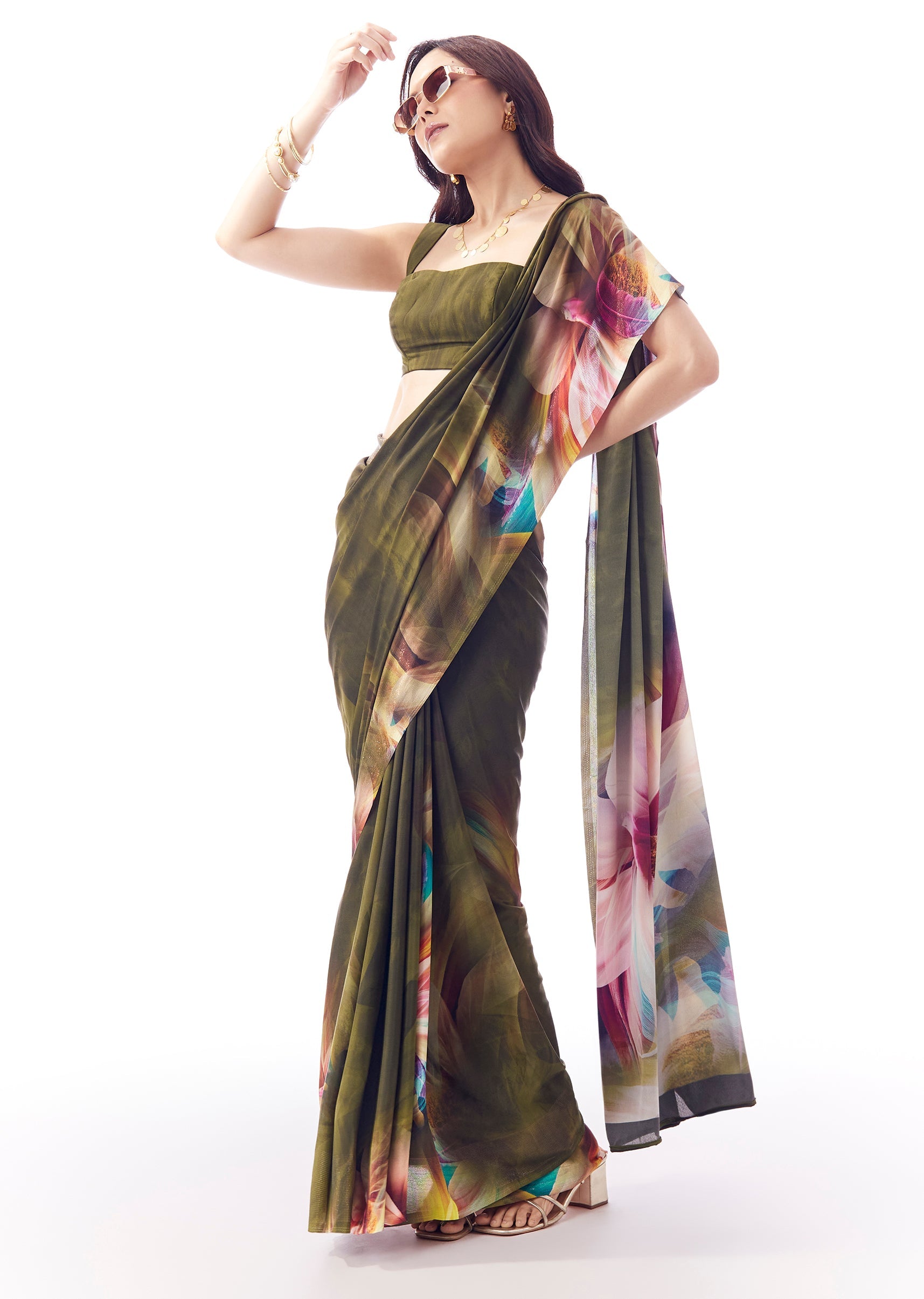Dark Olive Green Georgette Saree With Multicolour Floral Print
