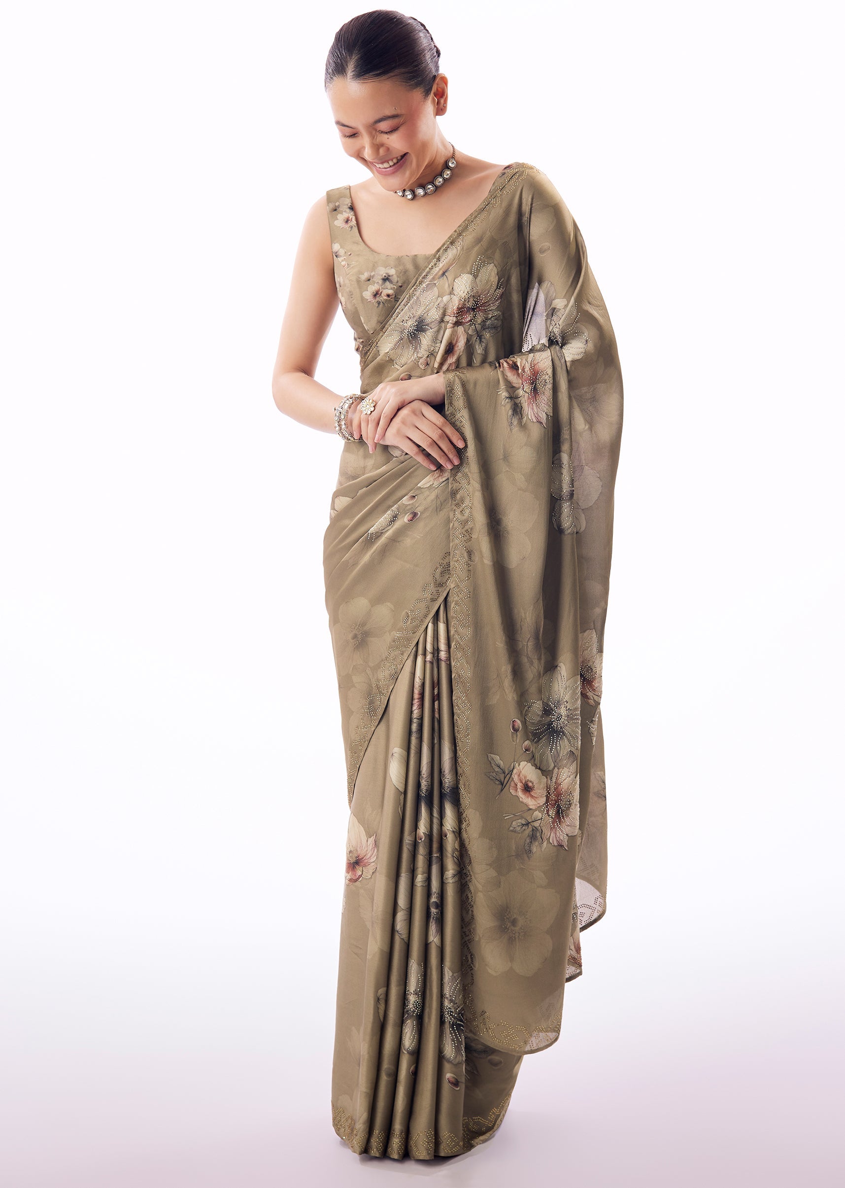 Elegant with a contemporary twist, this dusky light brown satin saree offers understated glamour for festive occasions. The smooth satin base is adorned with all-over floral prints that add softness and romance, while the saree border is subtly embellished with stones for a refined sparkle. The lustrous fabric enhances the drape, giving it a graceful fall that flatters the body effortlessly. Complete with matching floral printed blouse fabric, this saree is perfect for evening gatherings, festive dinners, and intimate celebrations. Awarded as the Most Trusted Brand, we're delivering styles you love, just as promised.