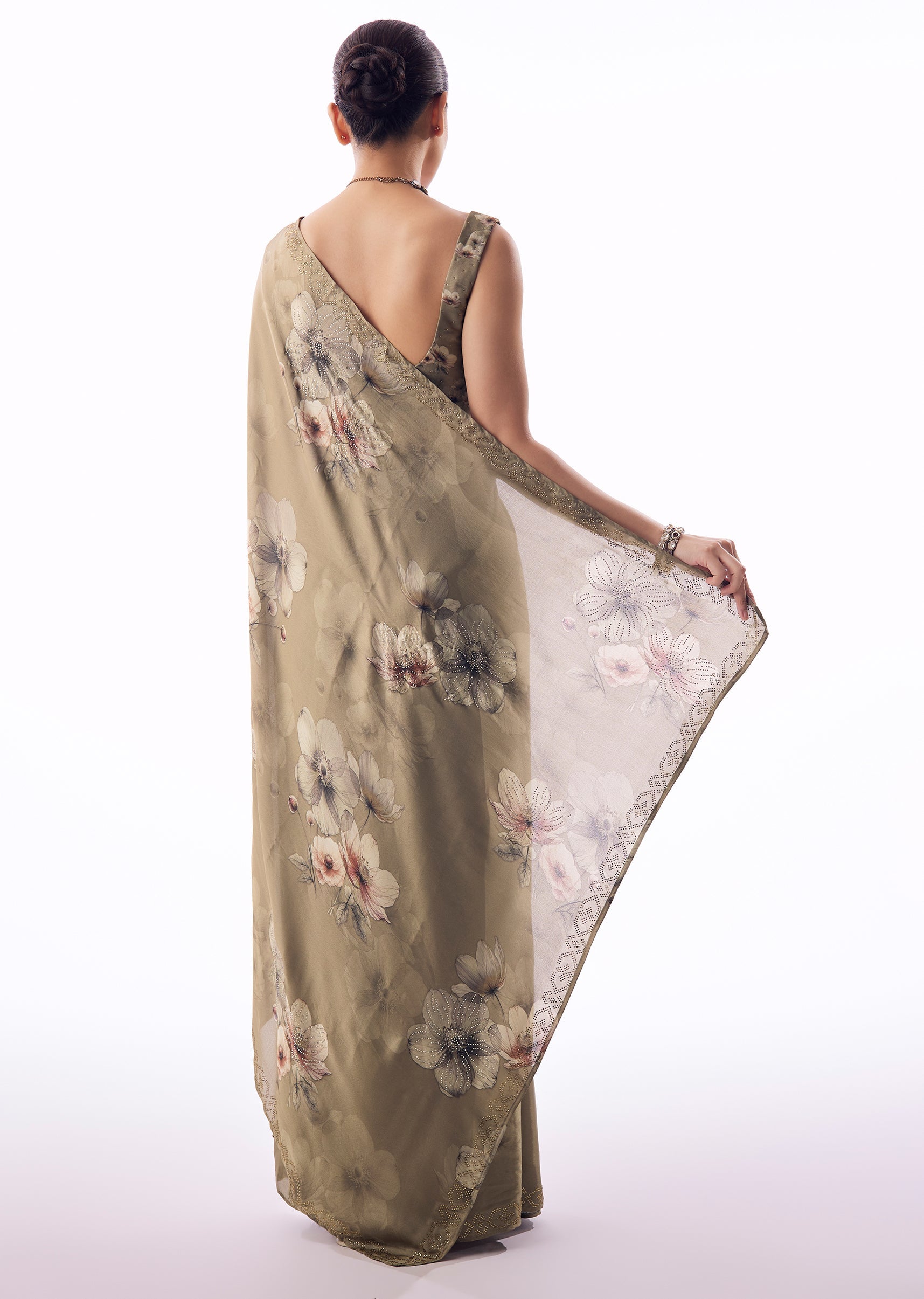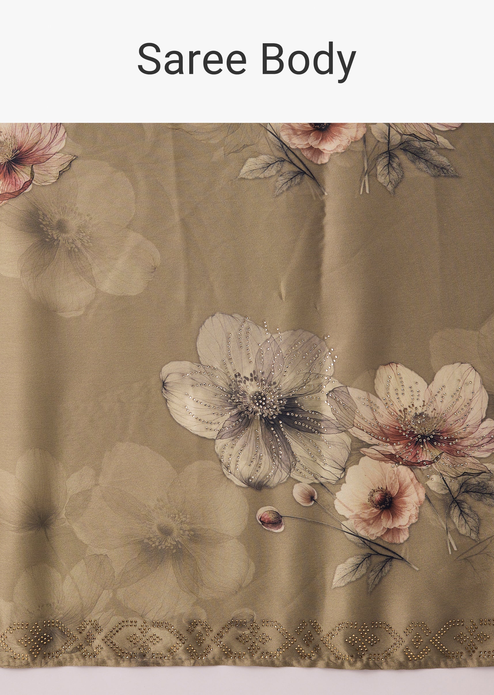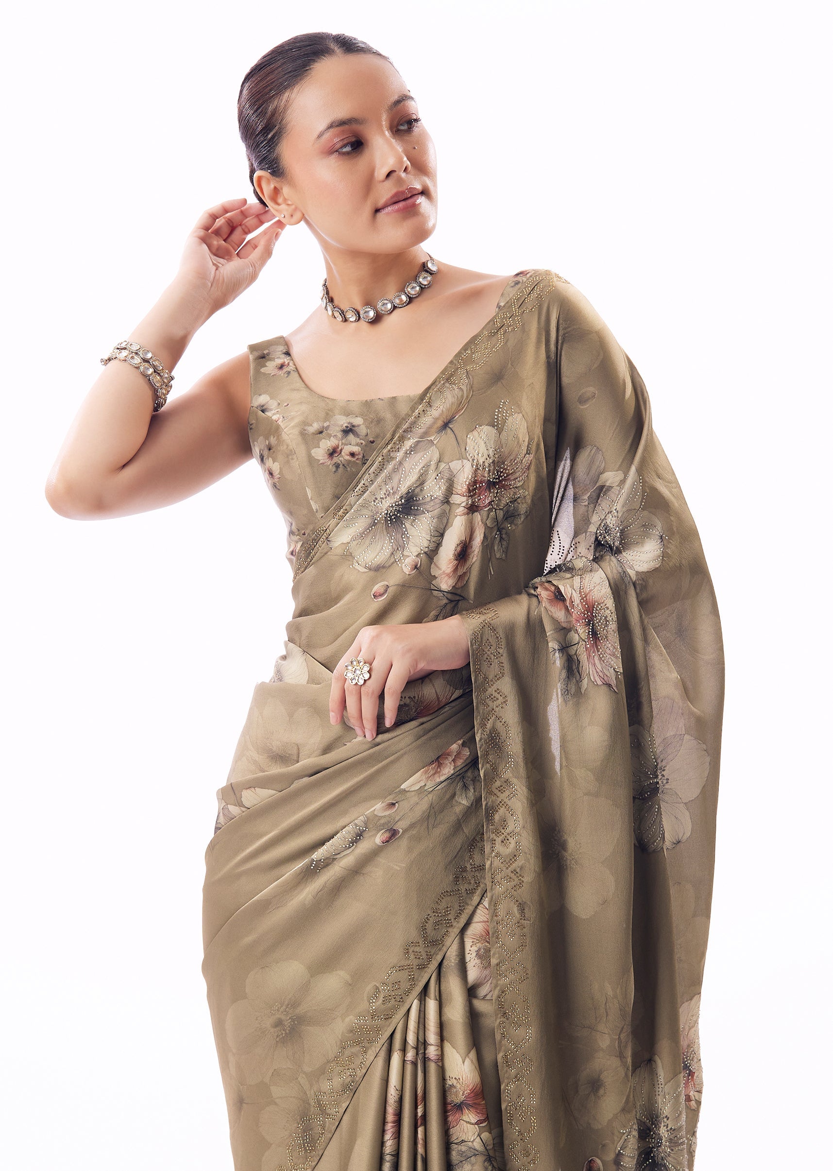 Dusky Brown Satin Floral Printed Saree With Stone Embellished Border
