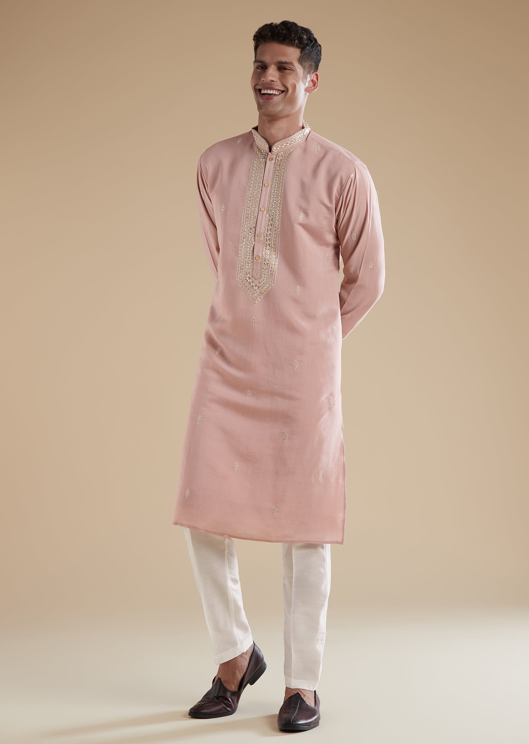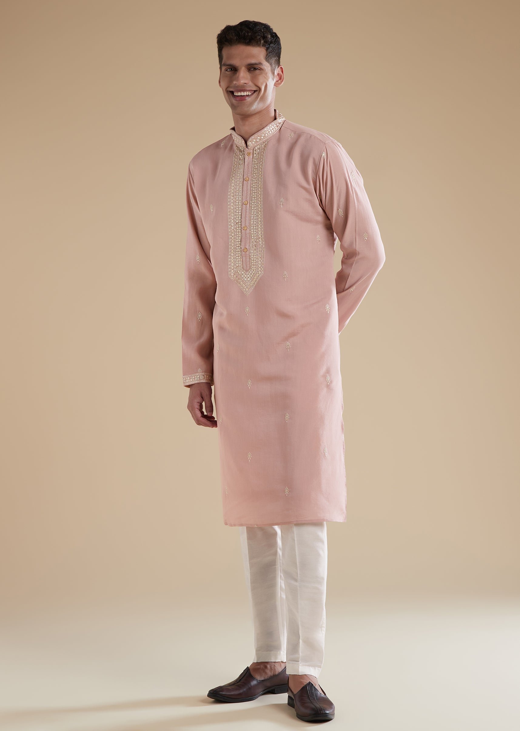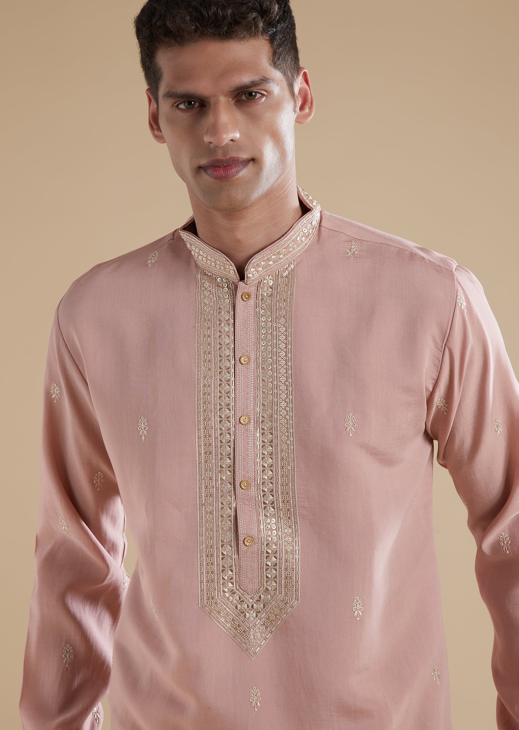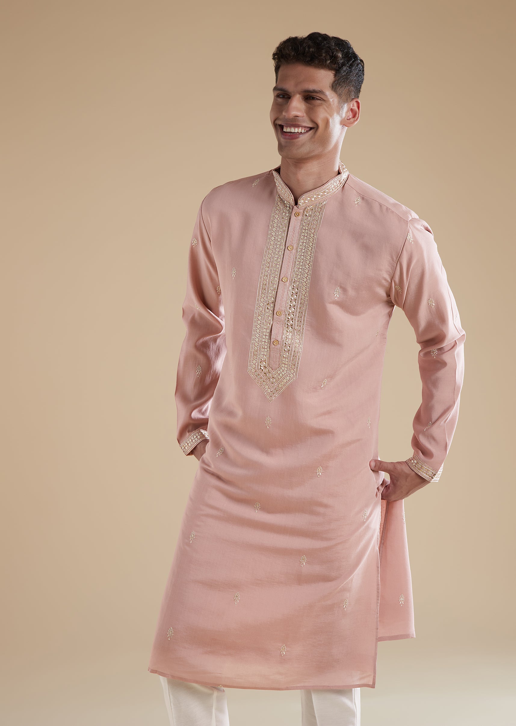 This dusty pink mens kurta set is crafted in luxurious silk with art silk as the secondary fabric, giving it a soft sheen and a refined pastel appeal. The kurta features full sleeves and a classic mandarin collar that enhances its elegant and contemporary look. Coordinating pants complete the ensemble, creating a polished outfit perfect for festive gatherings, daytime ceremonies, and pastel themed celebrations.