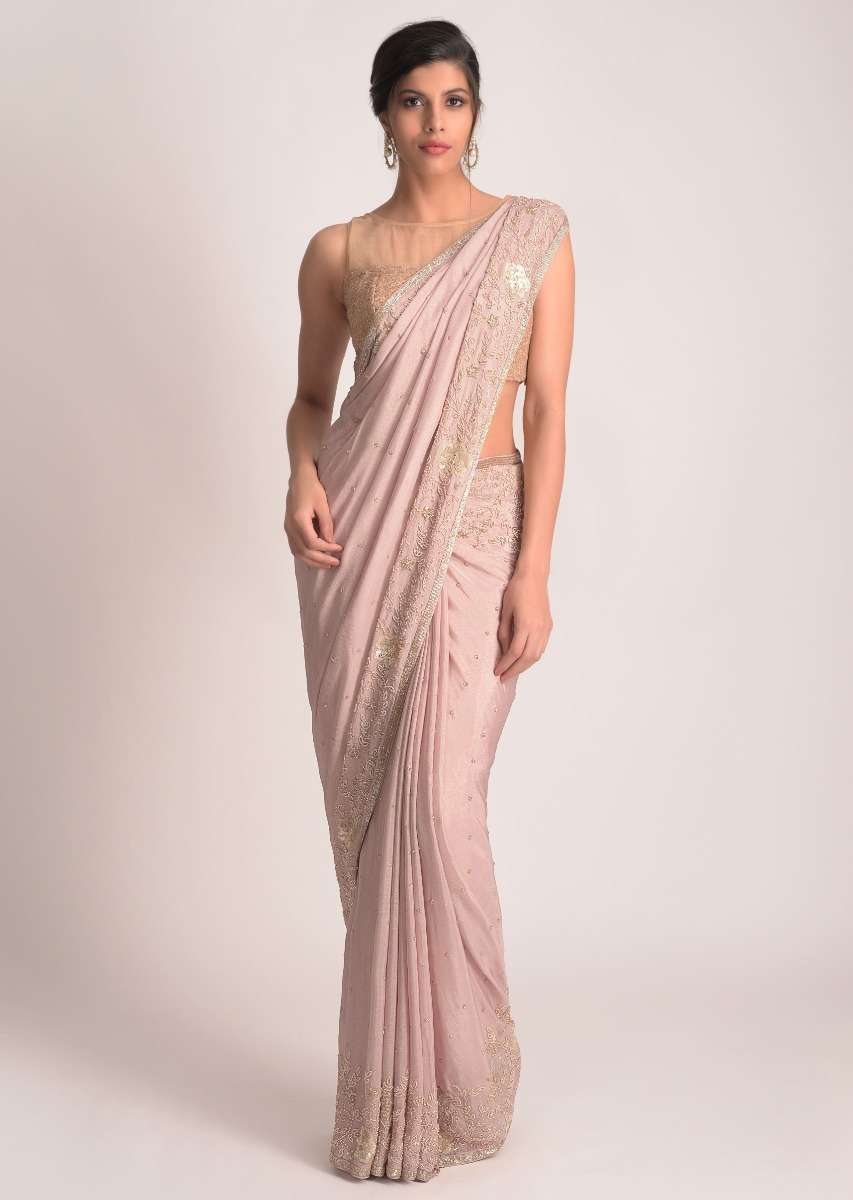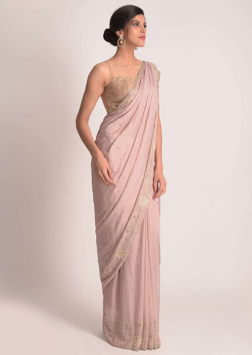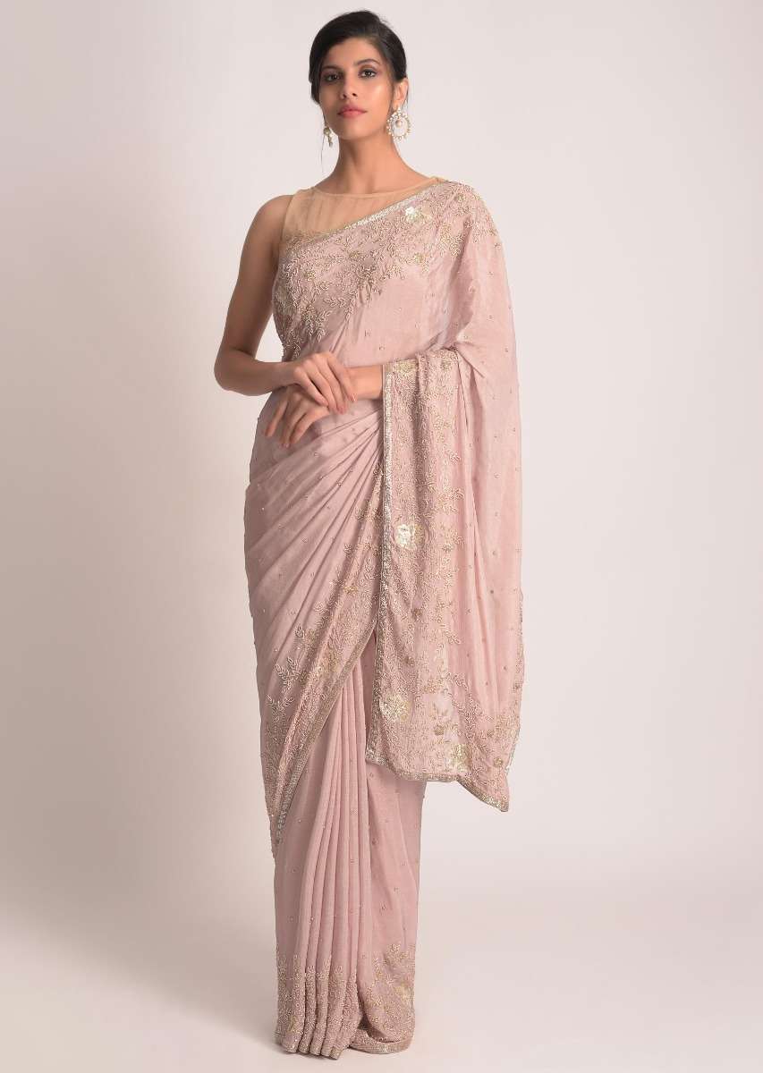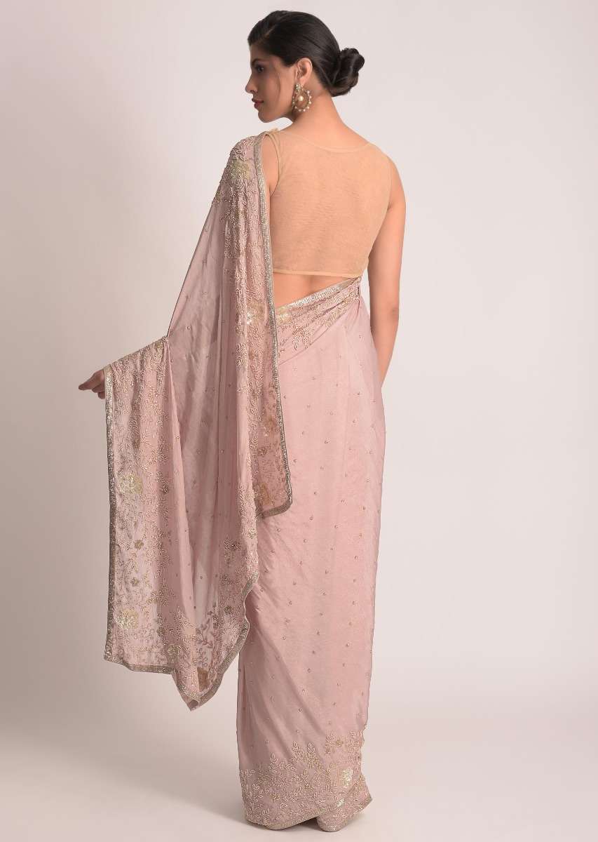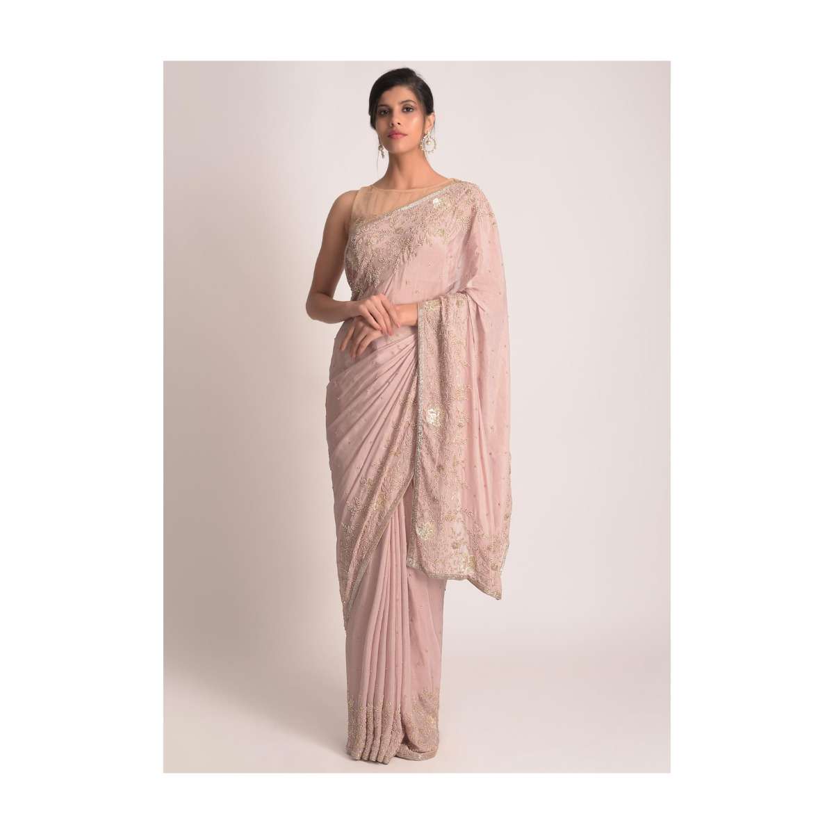 Dusty Rose Pink Saree In Shimmer Georgette With Floral Embroidery Online - Kalki Fashion