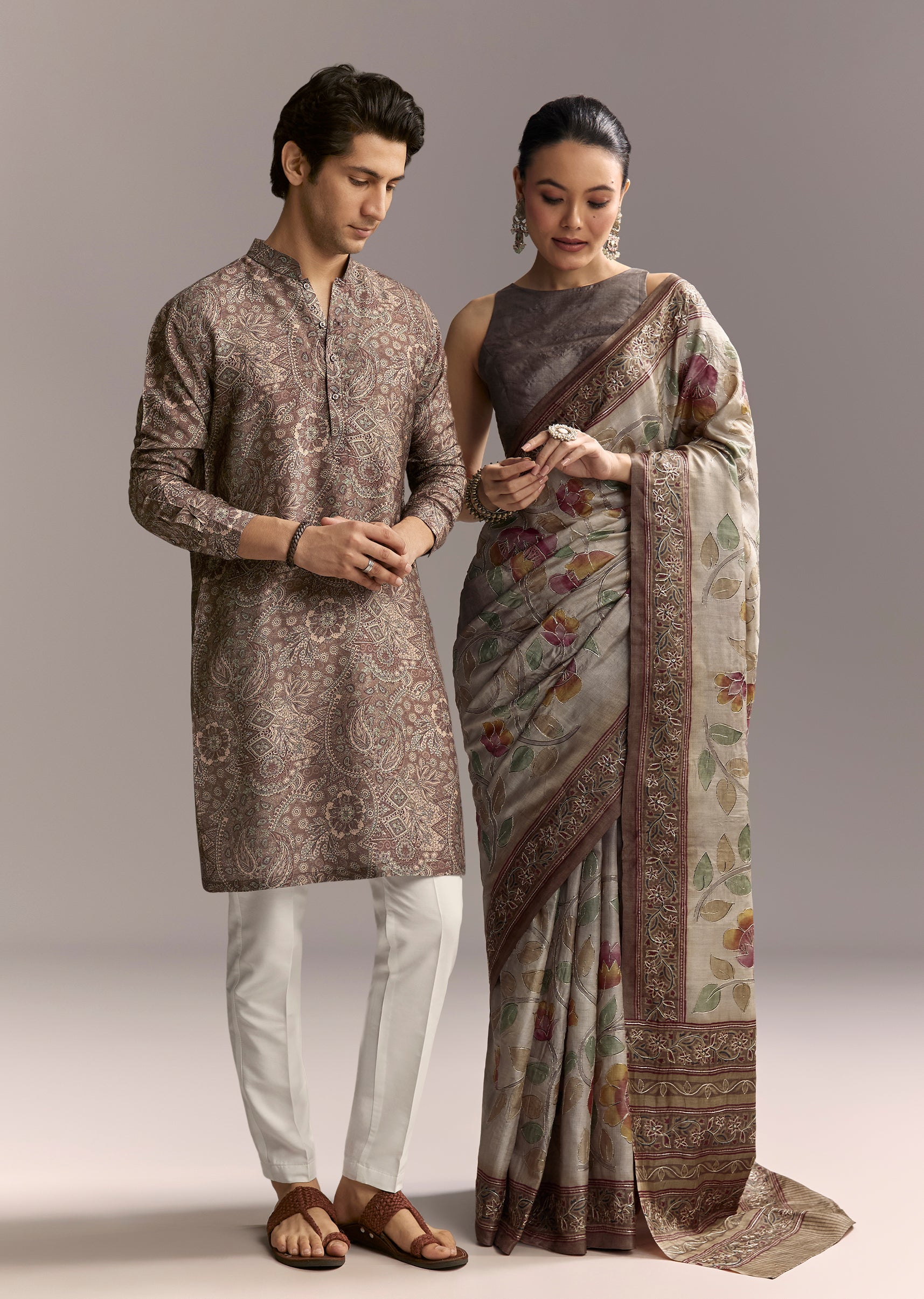 Earthy Grey Artistic Couple Set – Grey Hand-Painted Cotton Saree For Her And Taupe Brown Printed Silk Kurta For Him