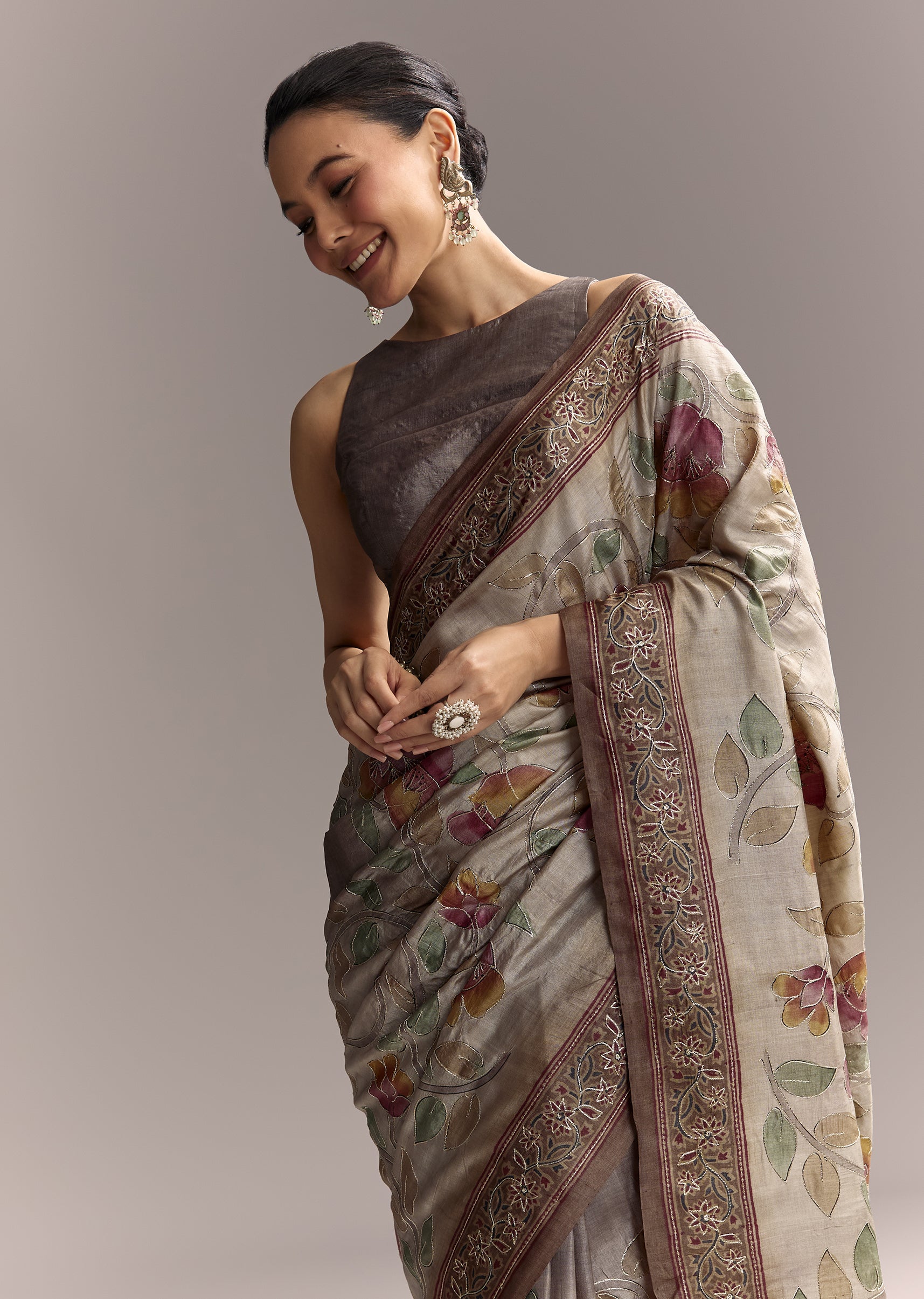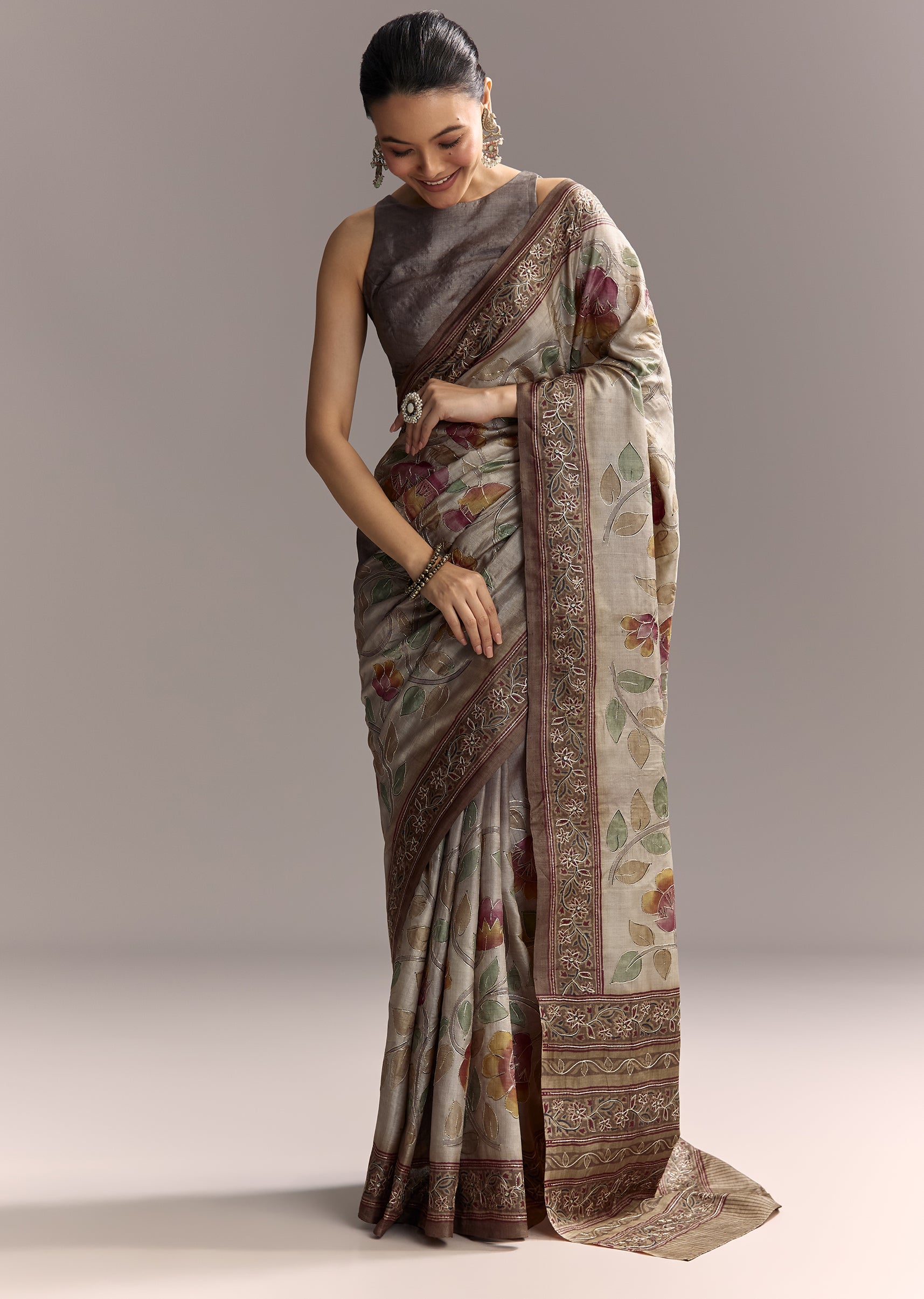 Minimal yet expressive, this grey cotton saree with hand-painted motifs offers artisanal charm for intimate celebrations.
