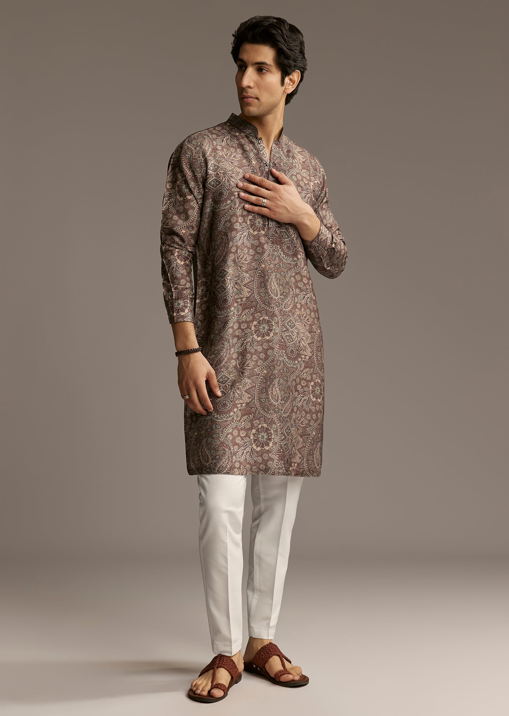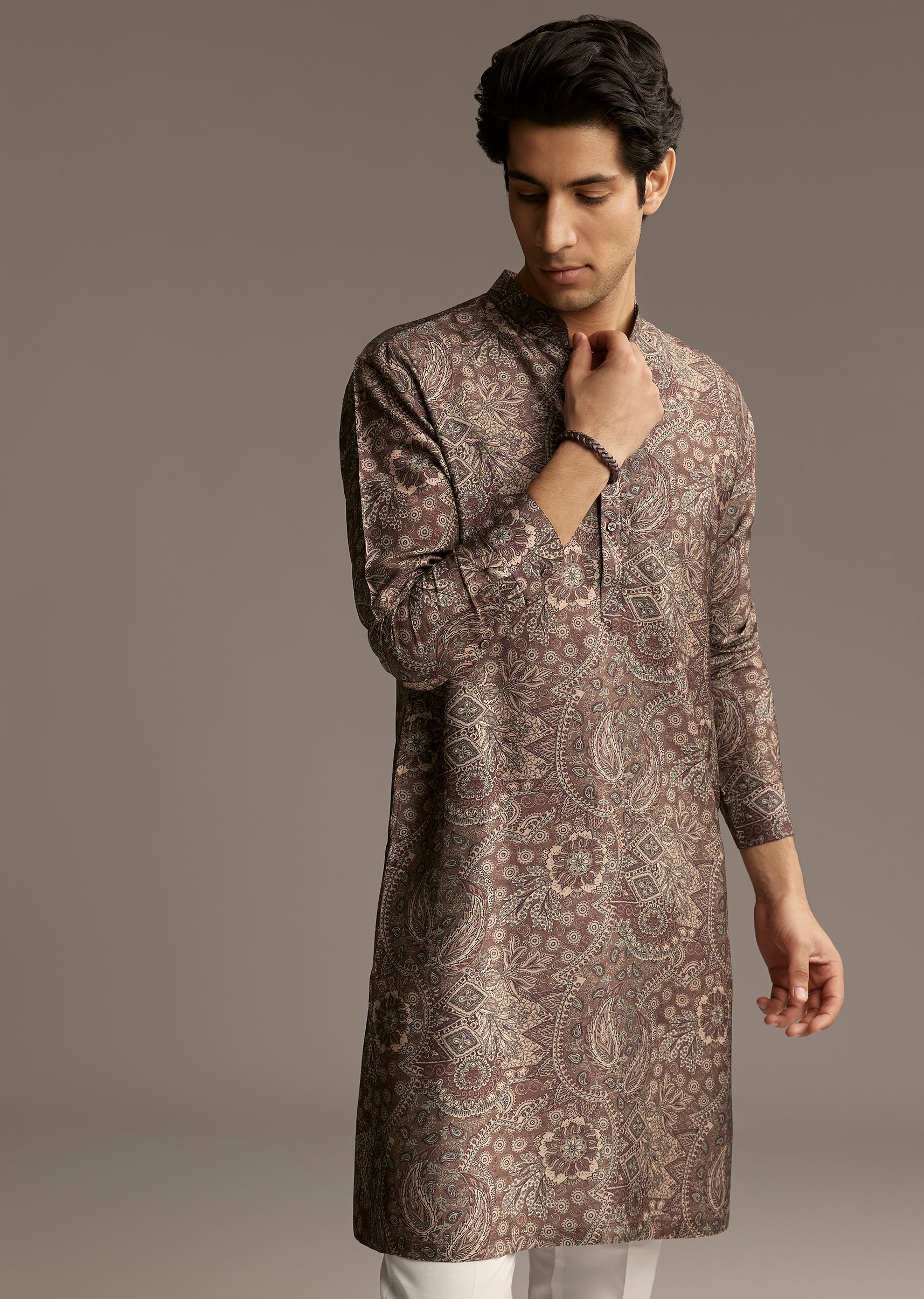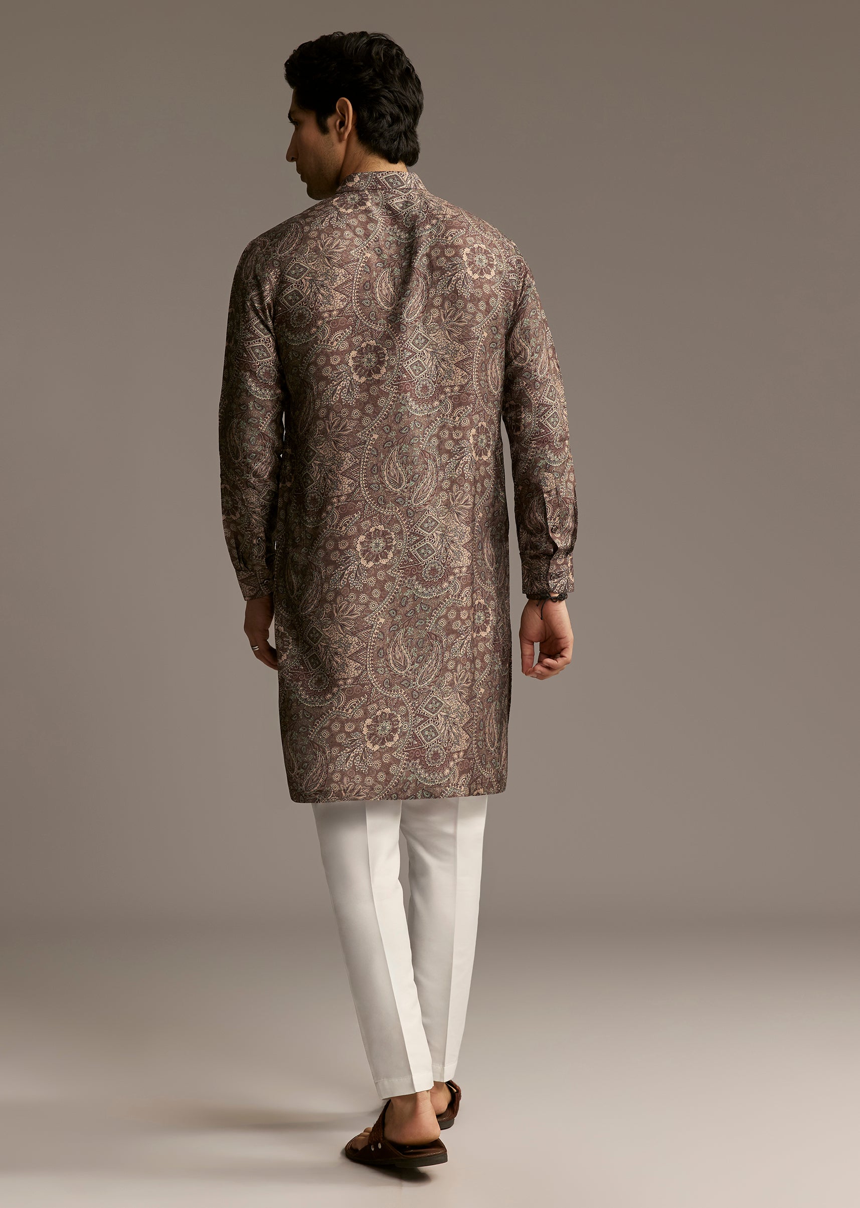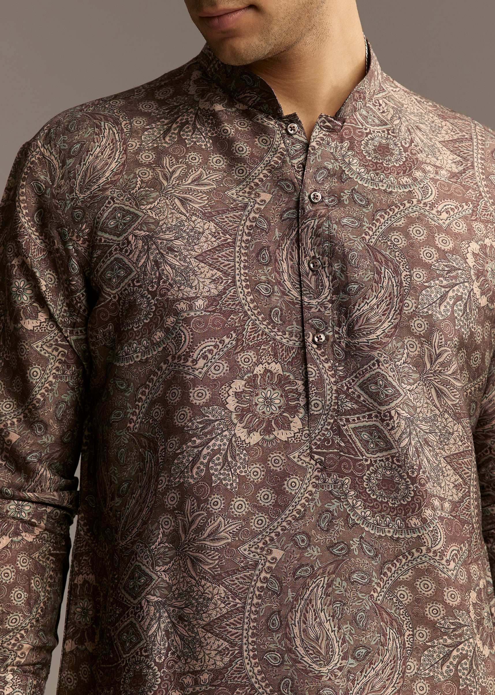 Elegant and detailed, this taupe brown silk kurta with paisley and floral motifs adds depth and sophistication to the coordinated look.