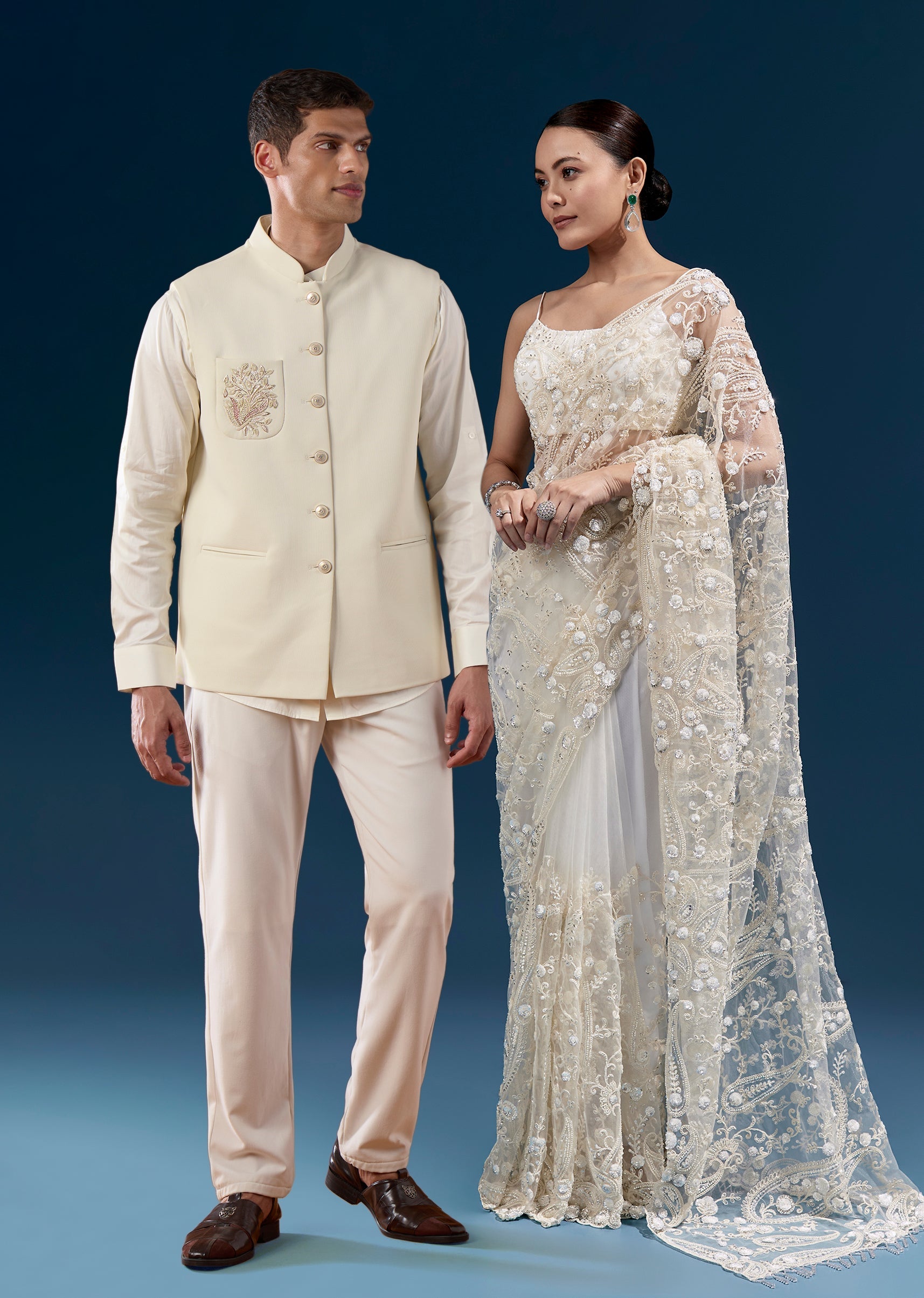 Elegant Wedding Couple Set – White Floral Heavy Embroidered Net Saree For Her And Off-White Embroidered Silk Kurta Jacket Set For Him