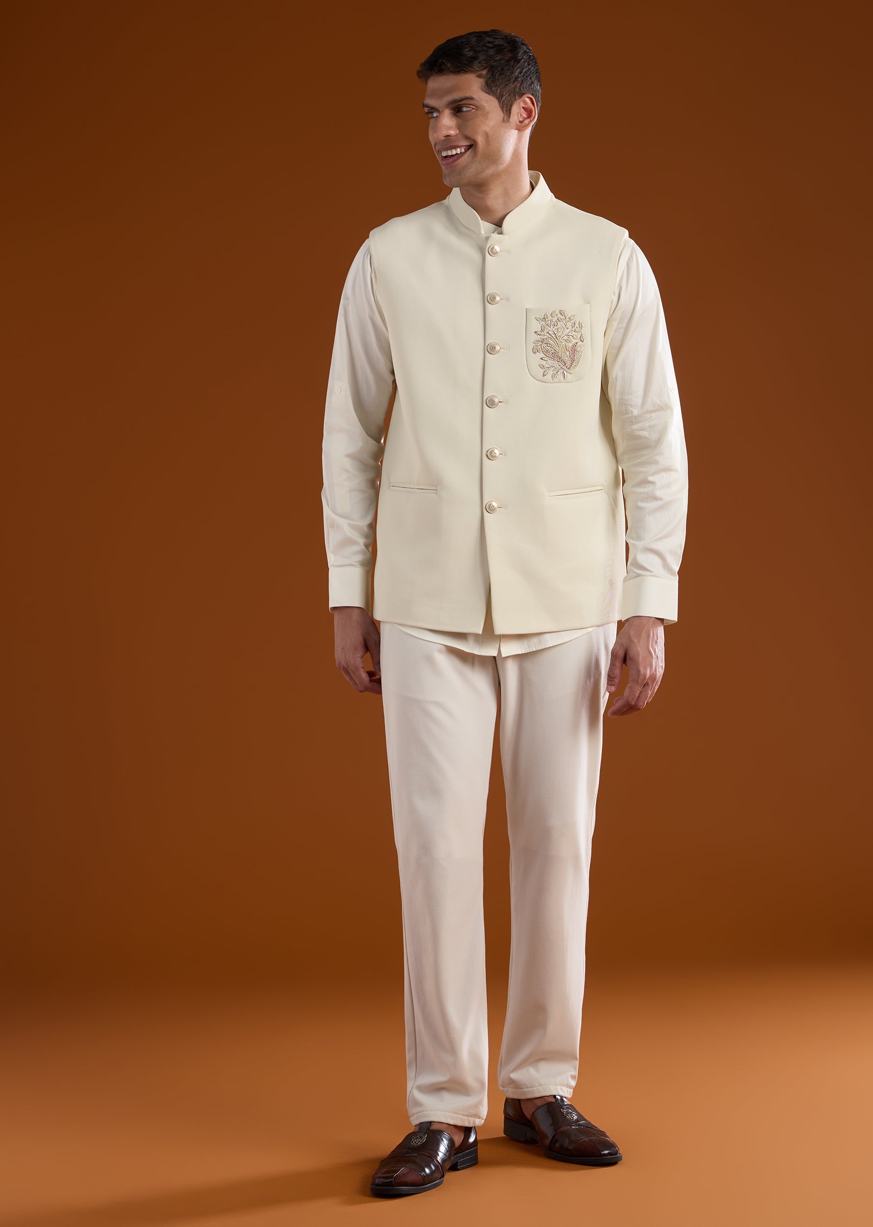 Sophisticated and polished, this off-white embroidered silk kurta jacket set offers structured elegance. Ideal for receptions and coordinated couple styling at grand wedding events.