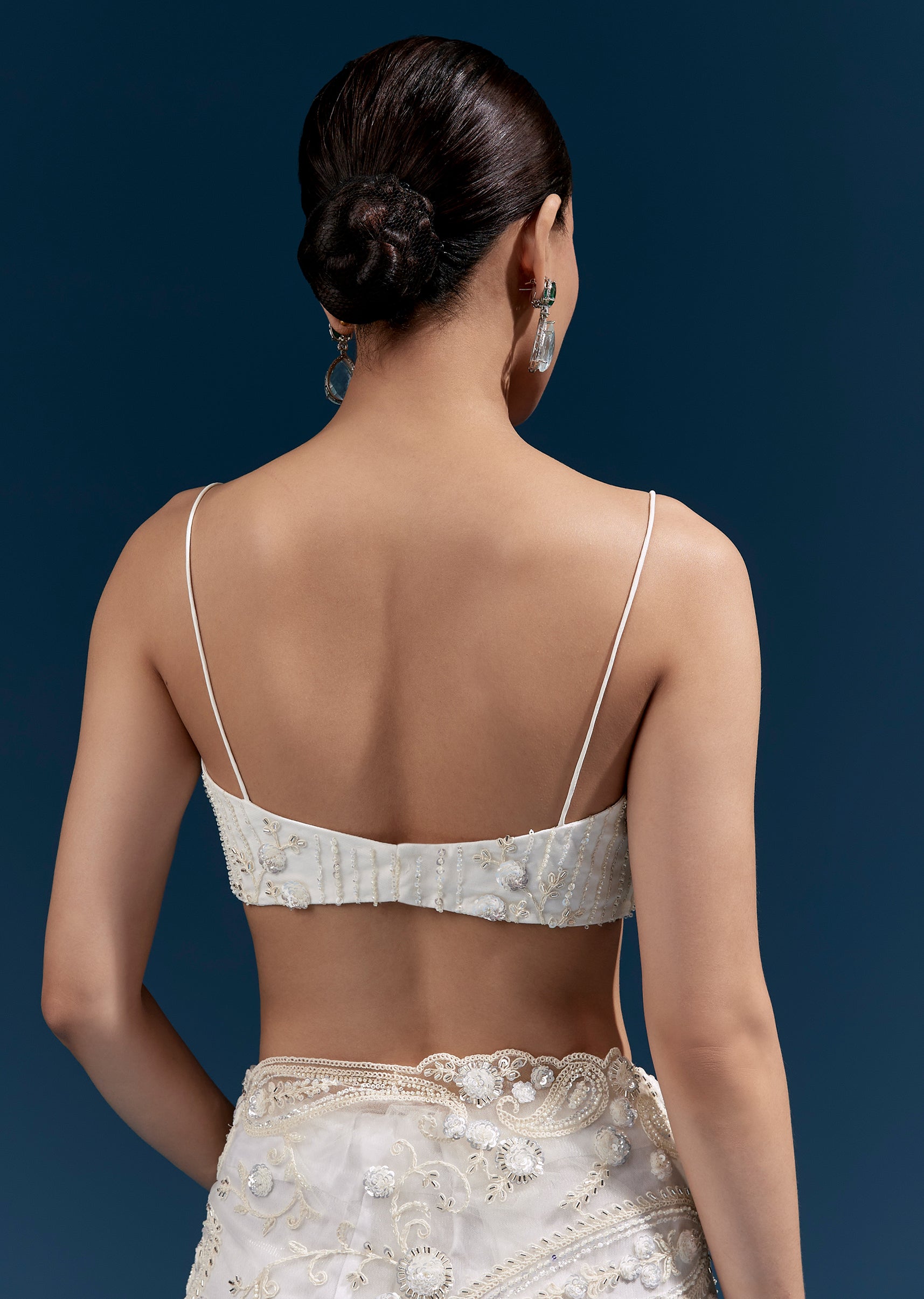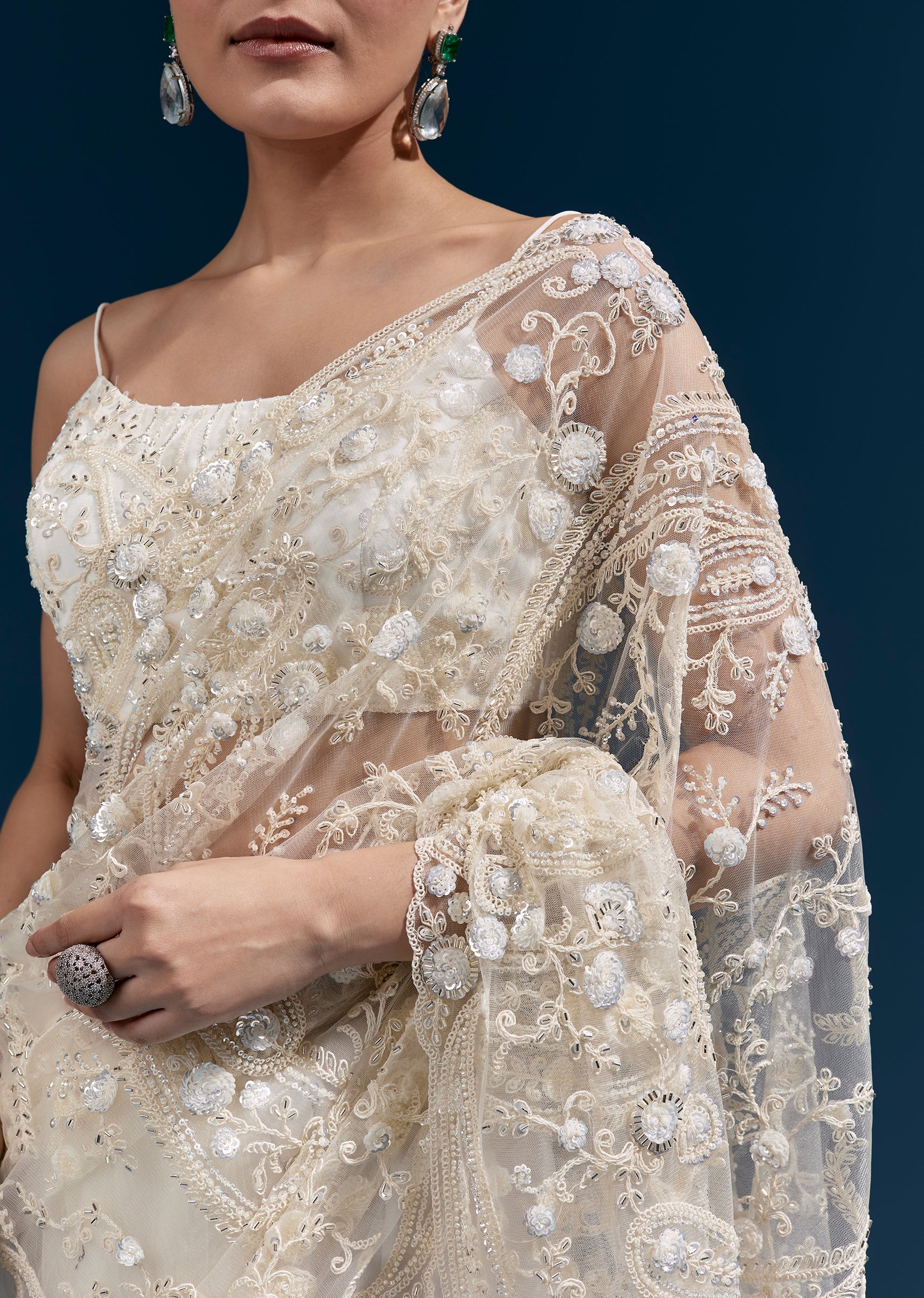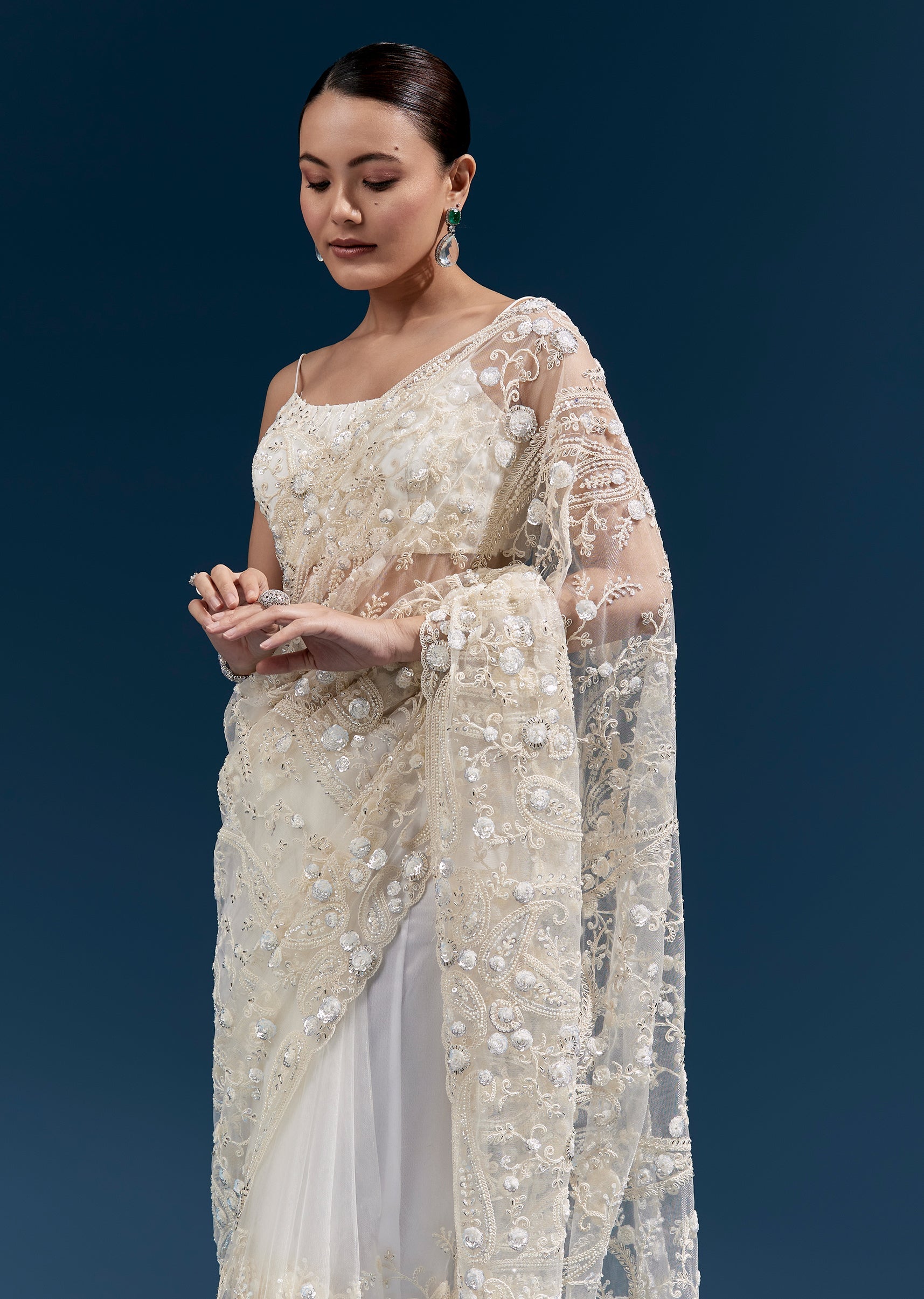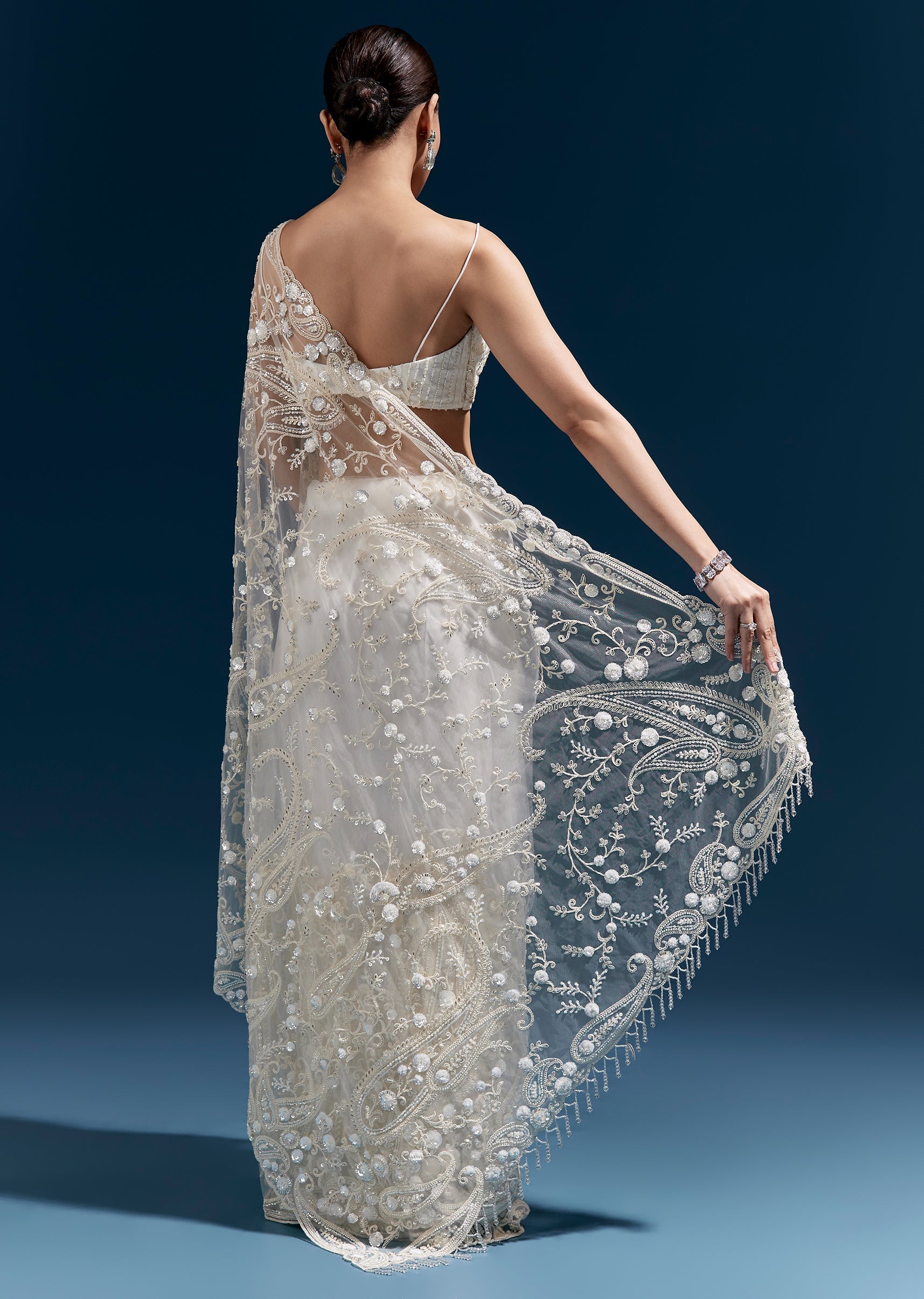 Graceful and ethereal, this white floral heavy embroidered net saree features intricate detailing and a tasselled pallu that adds refined movement. A perfect choice for receptions, engagement evenings, and formal wedding celebrations.