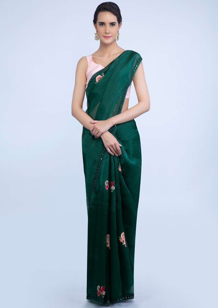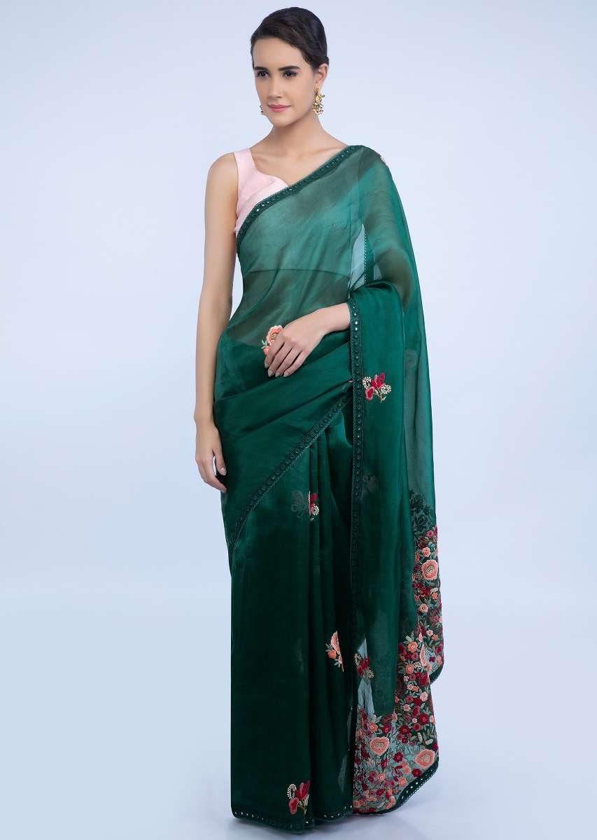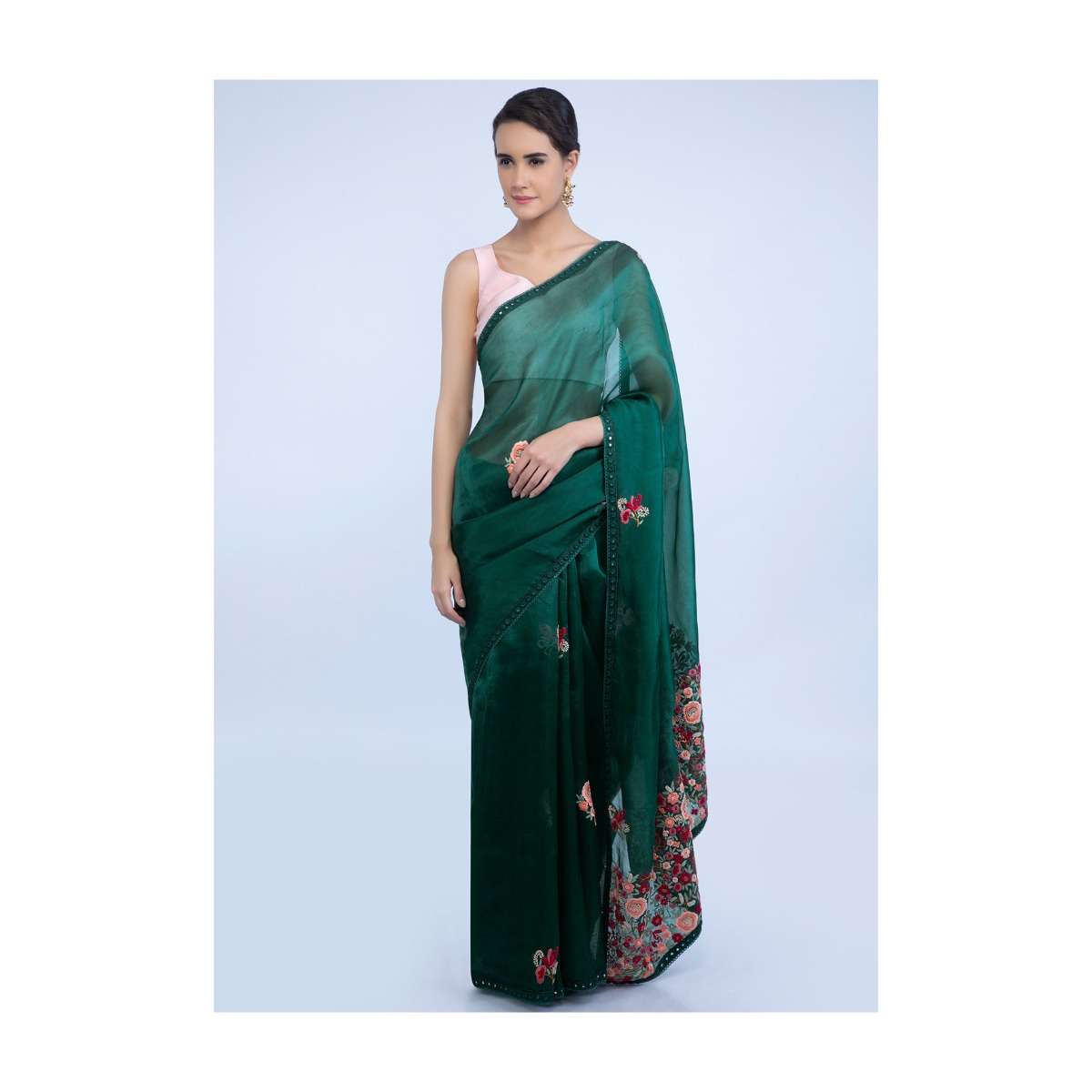 Emerald green organza saree with floral embroidered butti only on Kalki