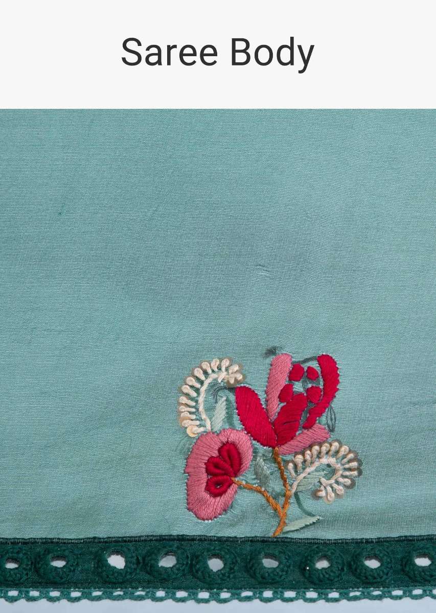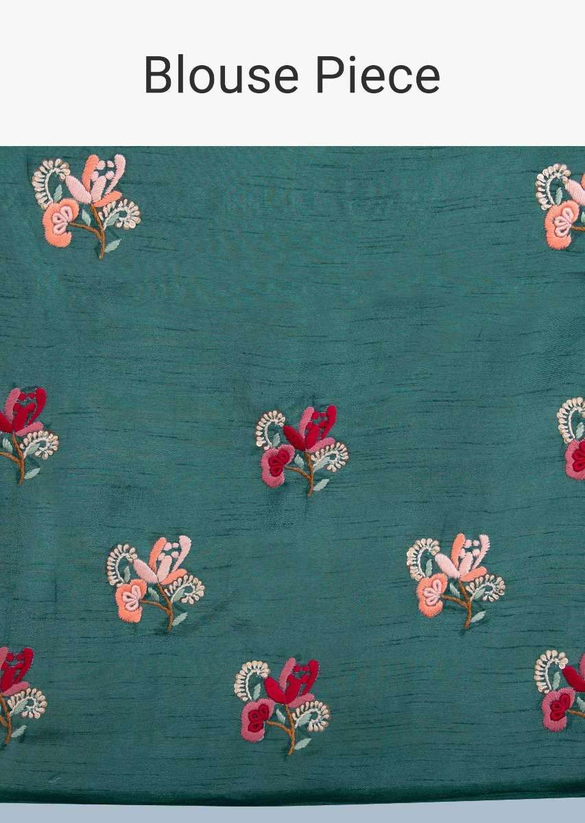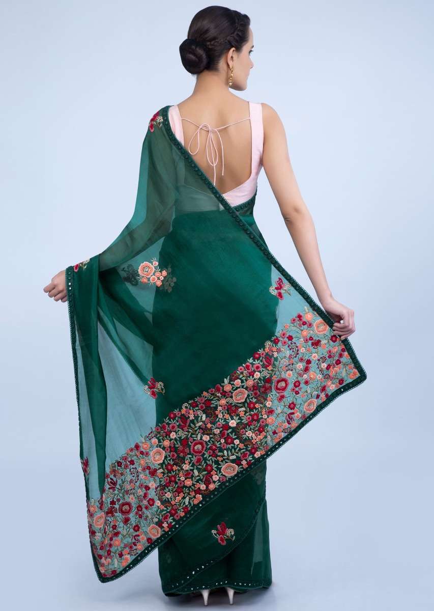 Emerald green organza saree with floral embroidered butti only on Kalki