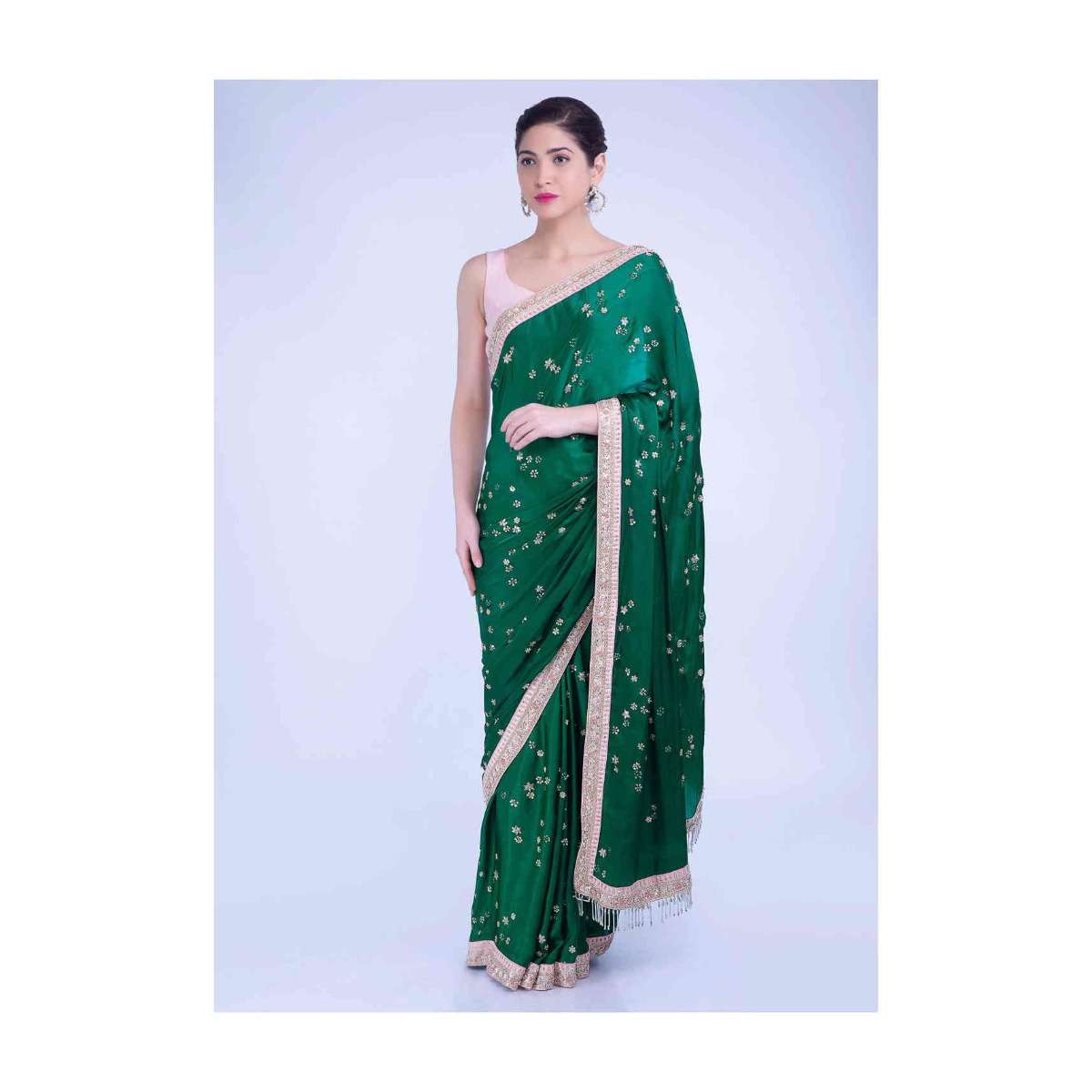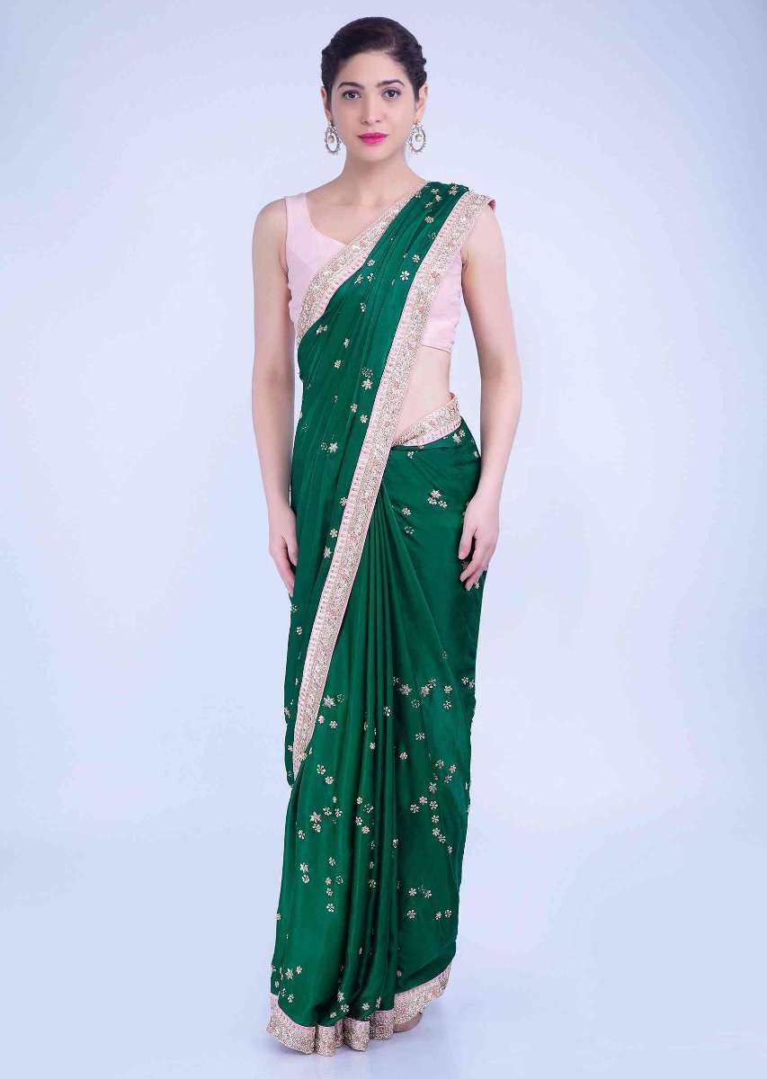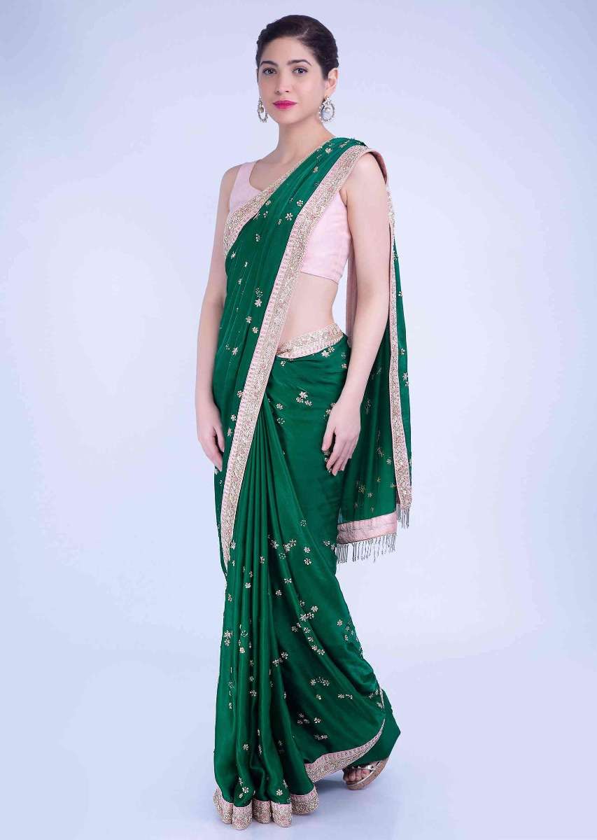 Emerald Green Saree In Satin Georgette With Blush Pink Raw Silk Blouse Piece Online - Kalki Fashion