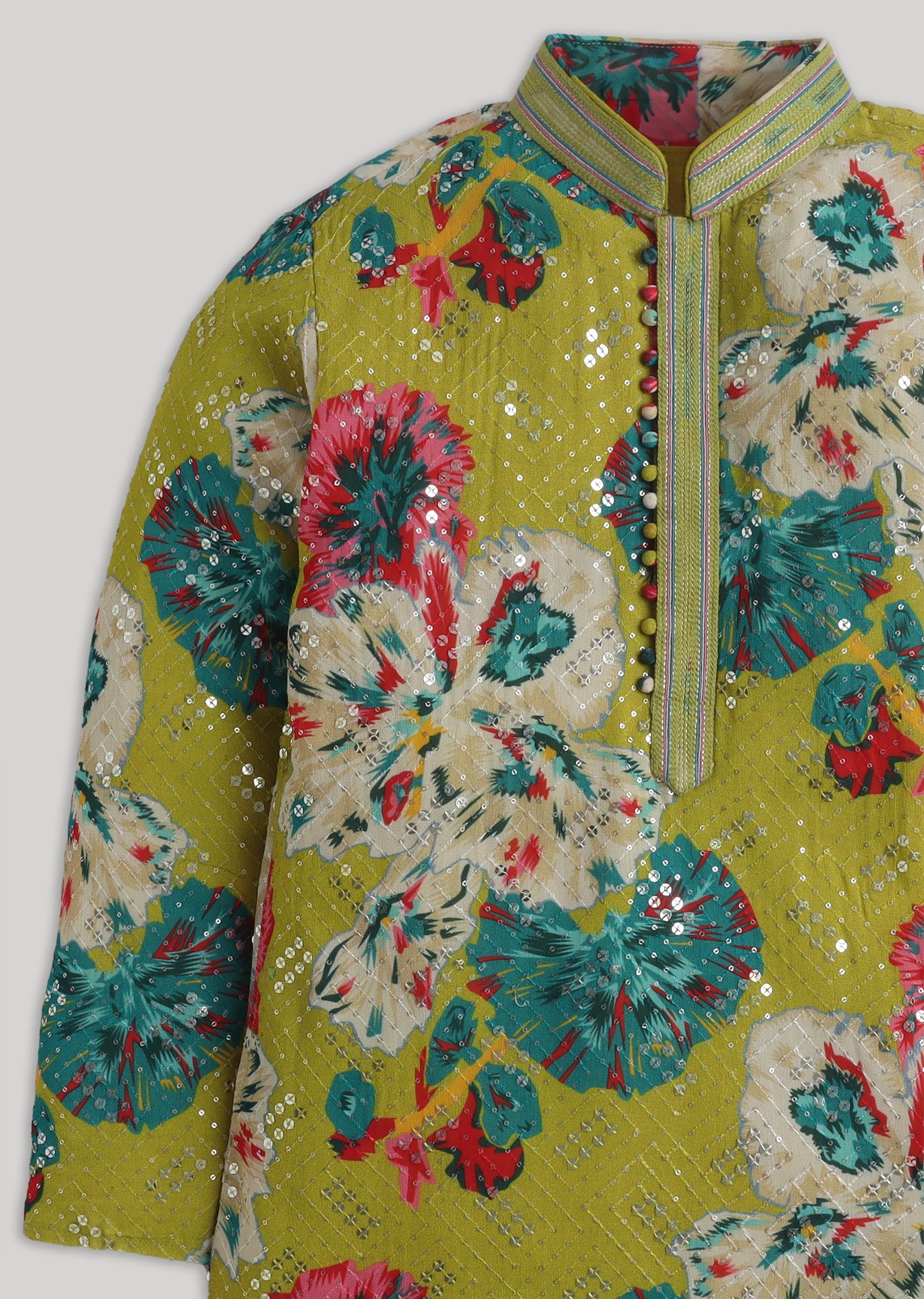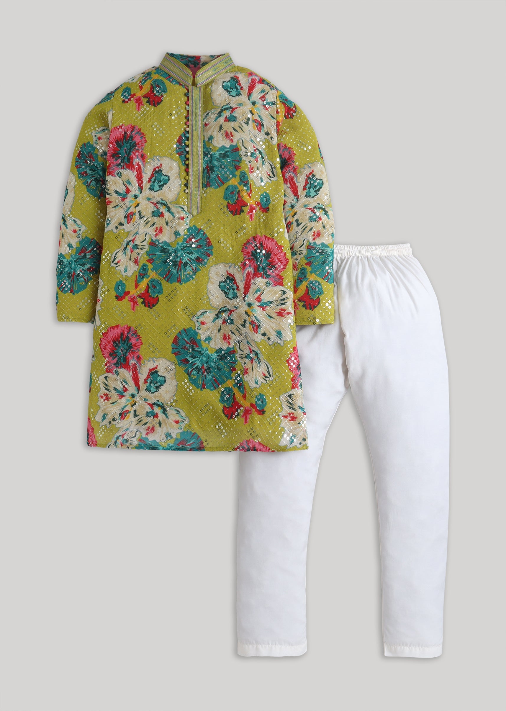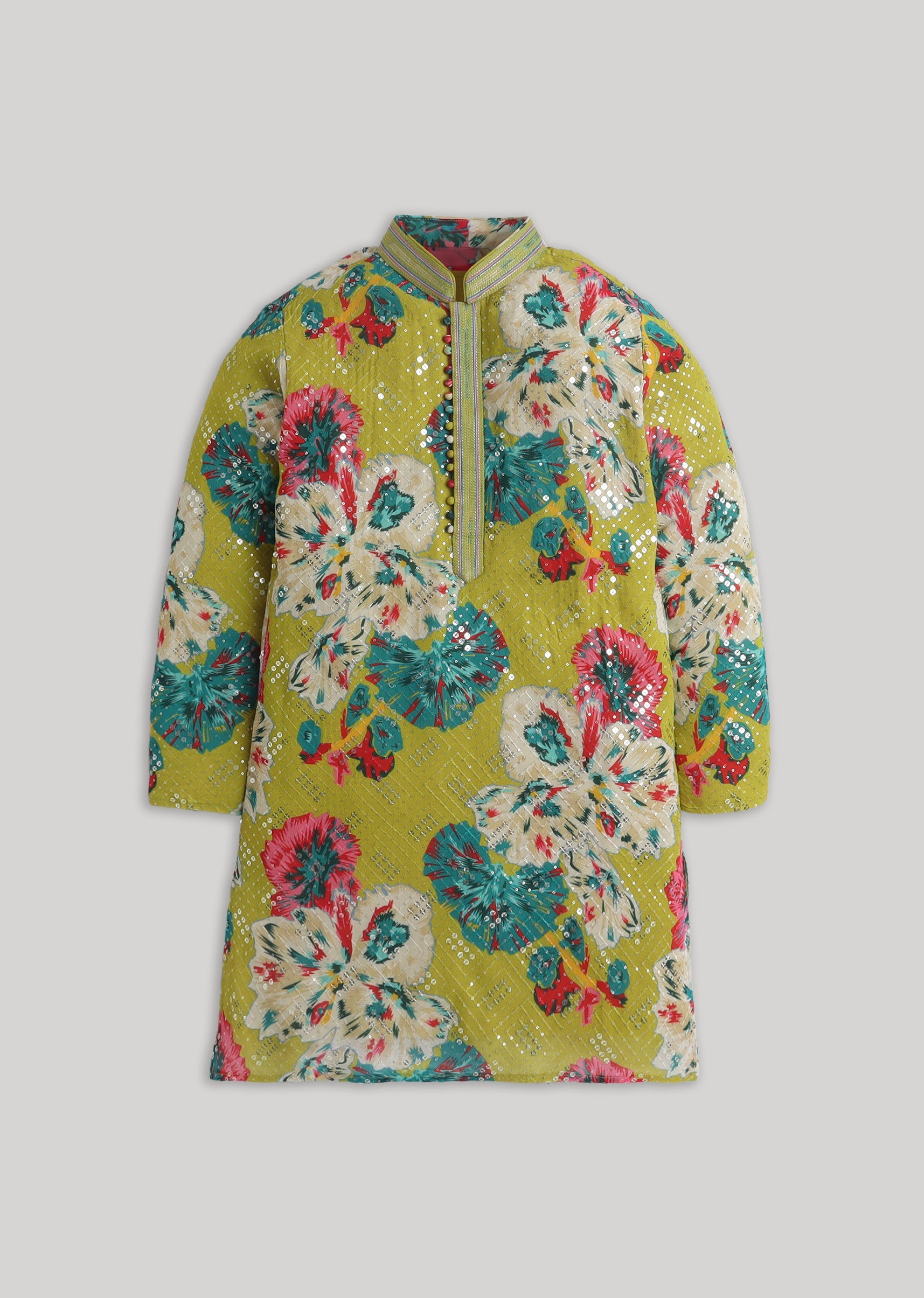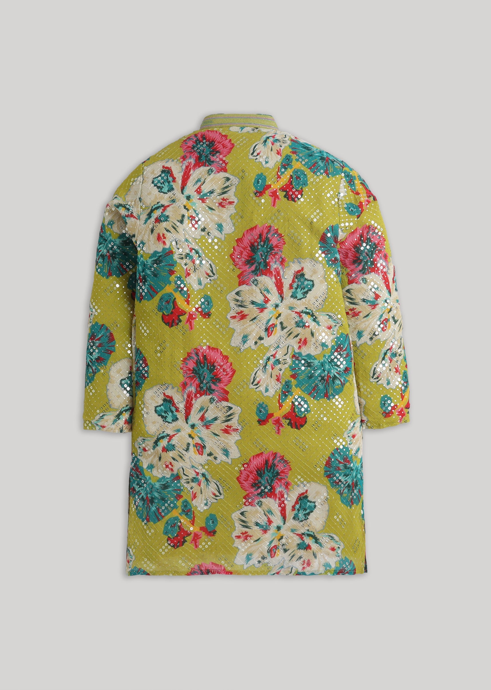 Bring festive flair to his wardrobe with this georgette kurta set featuring sequin accents and a vibrant floral mood. Designed with a mandarin collar, full sleeves, and front-button placket, its... More Product Details