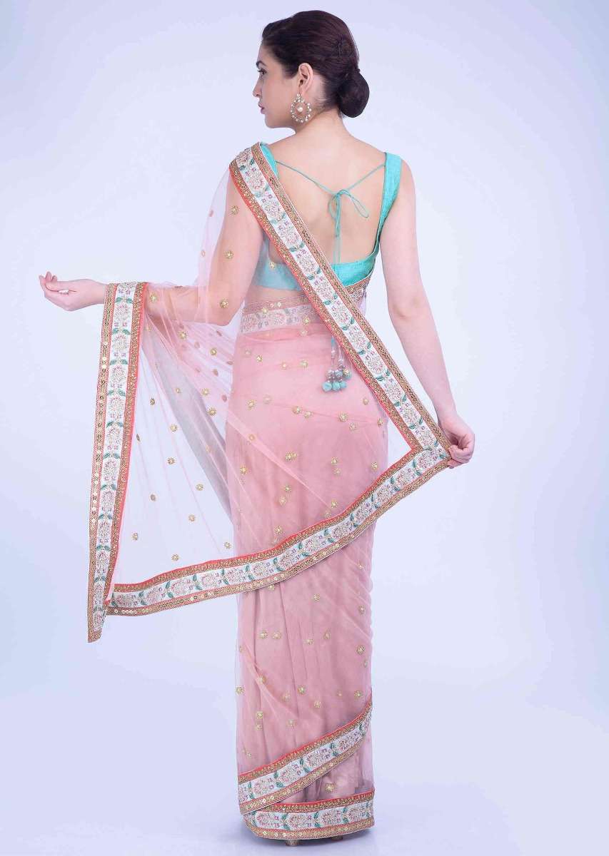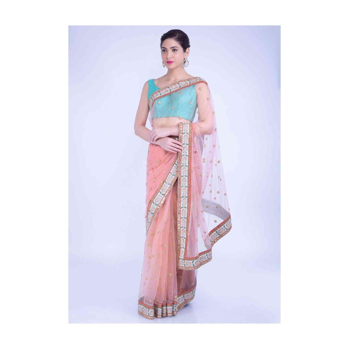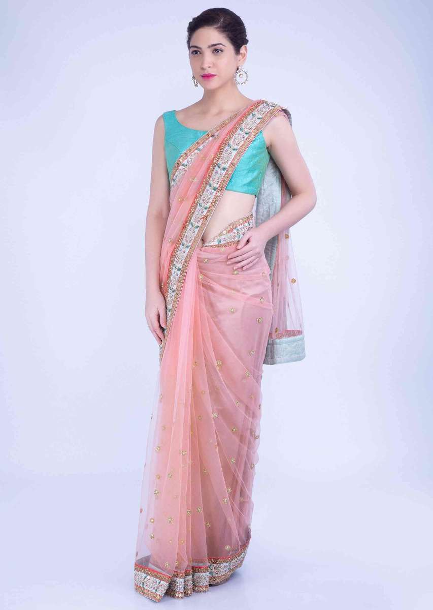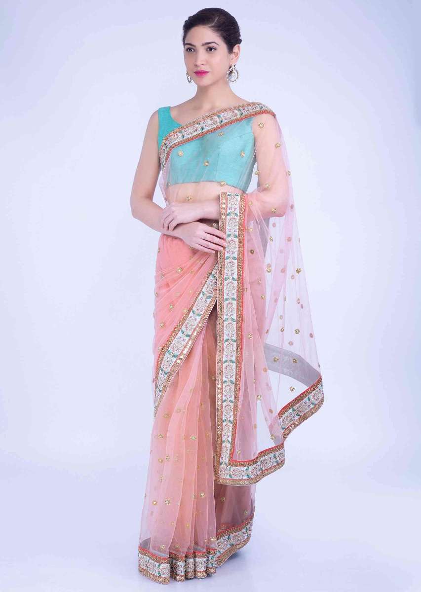 Flamingo Pink Saree In Net With Mint Green Raw Silk Blouse Piece Online - Kalki Fashion