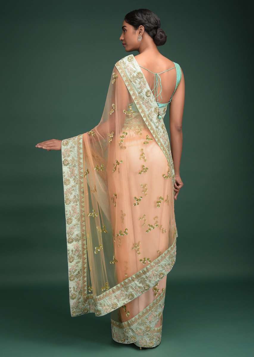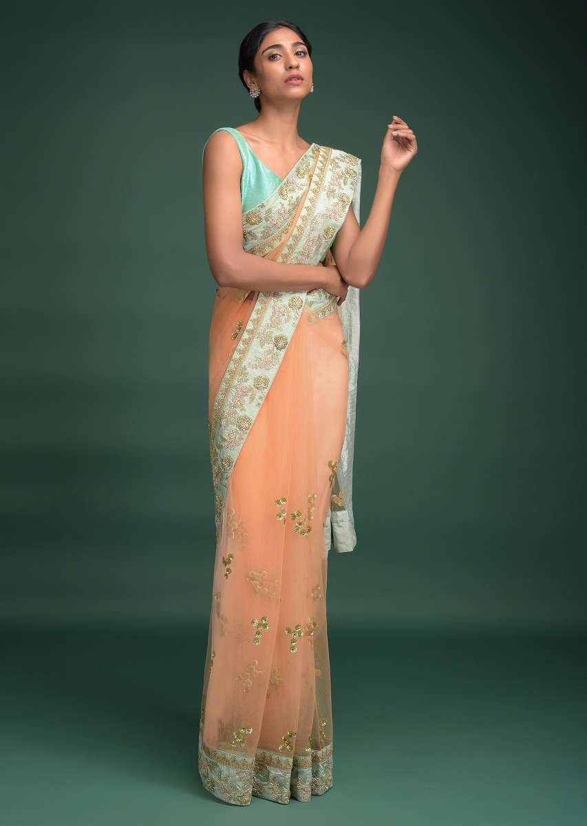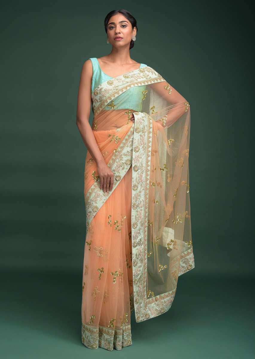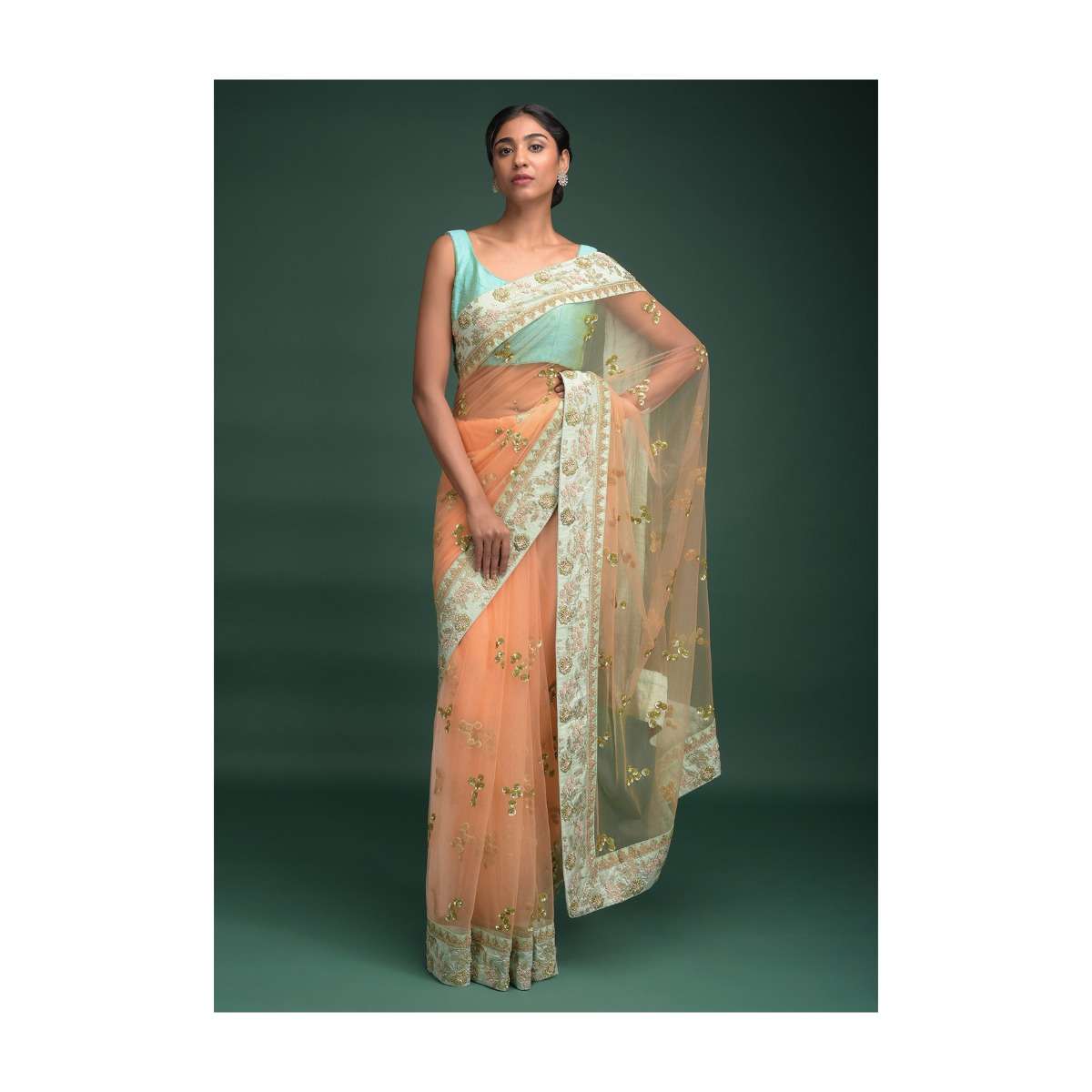 Ginger Peach Saree In Net With Sequins And Kundan Embellished Floral Buttis Online - Kalki Fashion