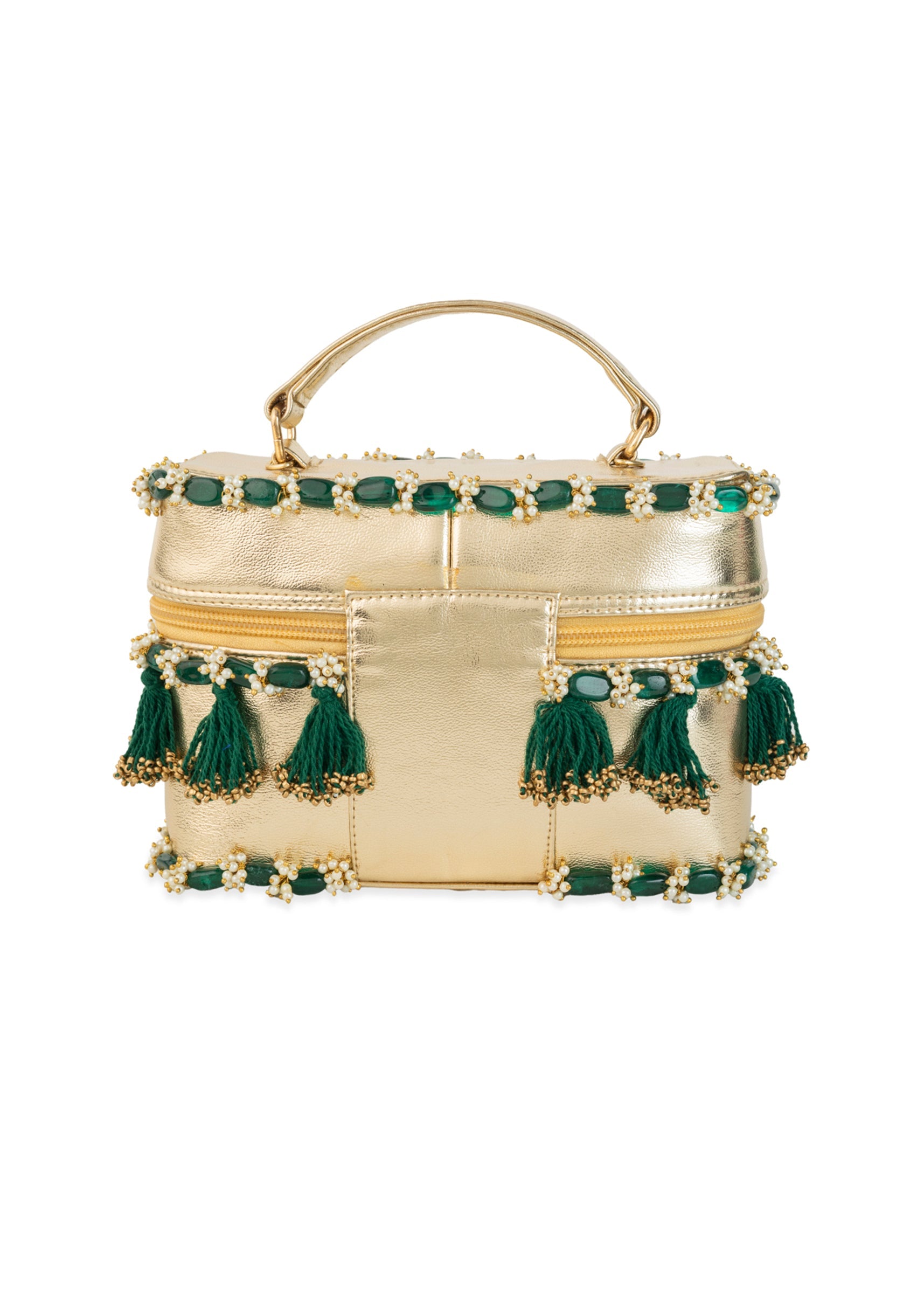 Gold and Green Tassel Drop Bead Embroidered Potli Bucket Bag