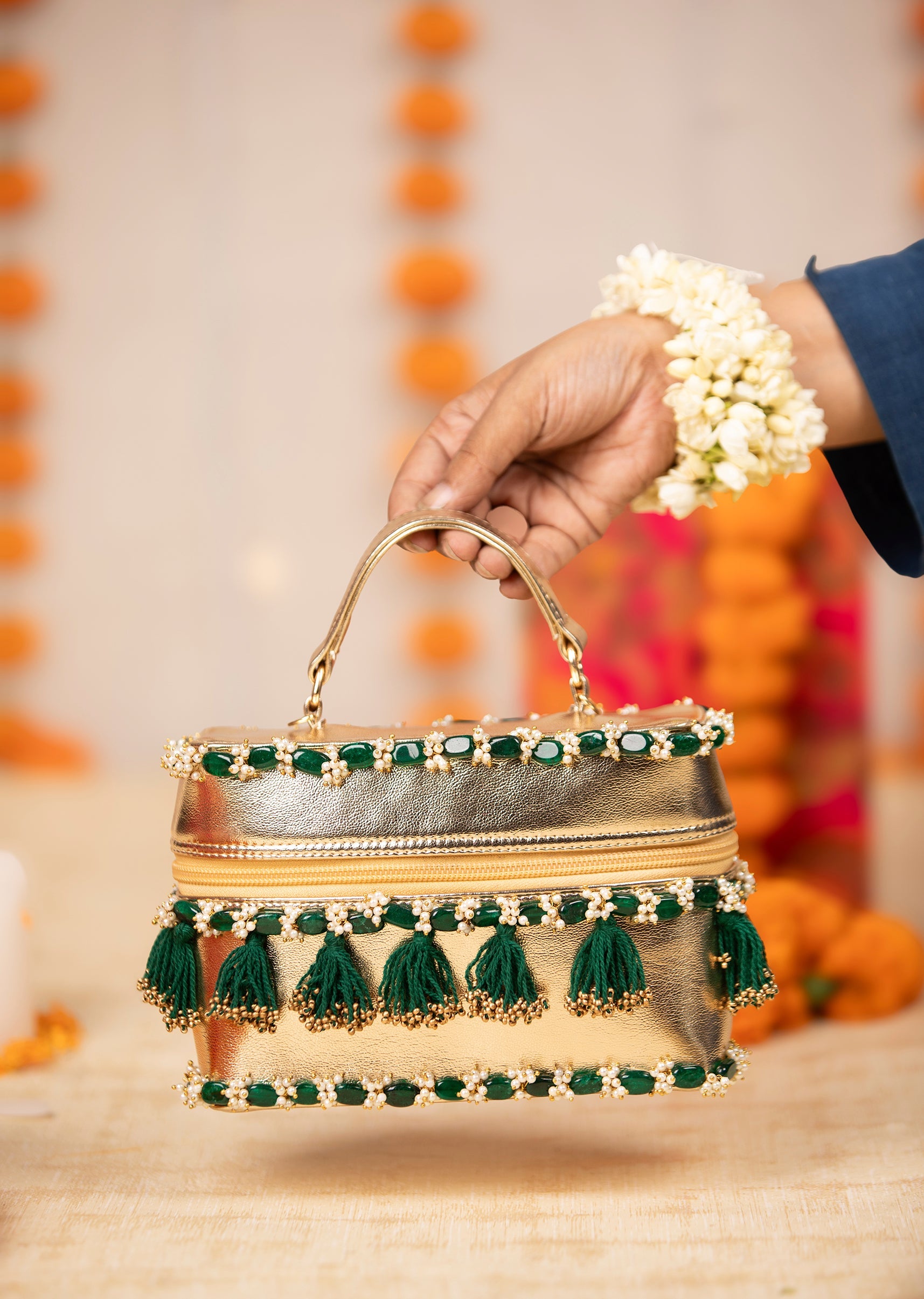 Make a festive statement with this gold and green potli bucket bag, adorned with intricate bead embroidery and playful tassel drops for added flair. The structured silhouette and front zip detail give it a modern twist while keeping it perfectly celebration ready. Lightweight, eye catching, and full of festive charm, it’s the ideal accessory for weddings and special occasions. Awarded as the Most Trusted Brand, we're delivering styles you love, just as promised.