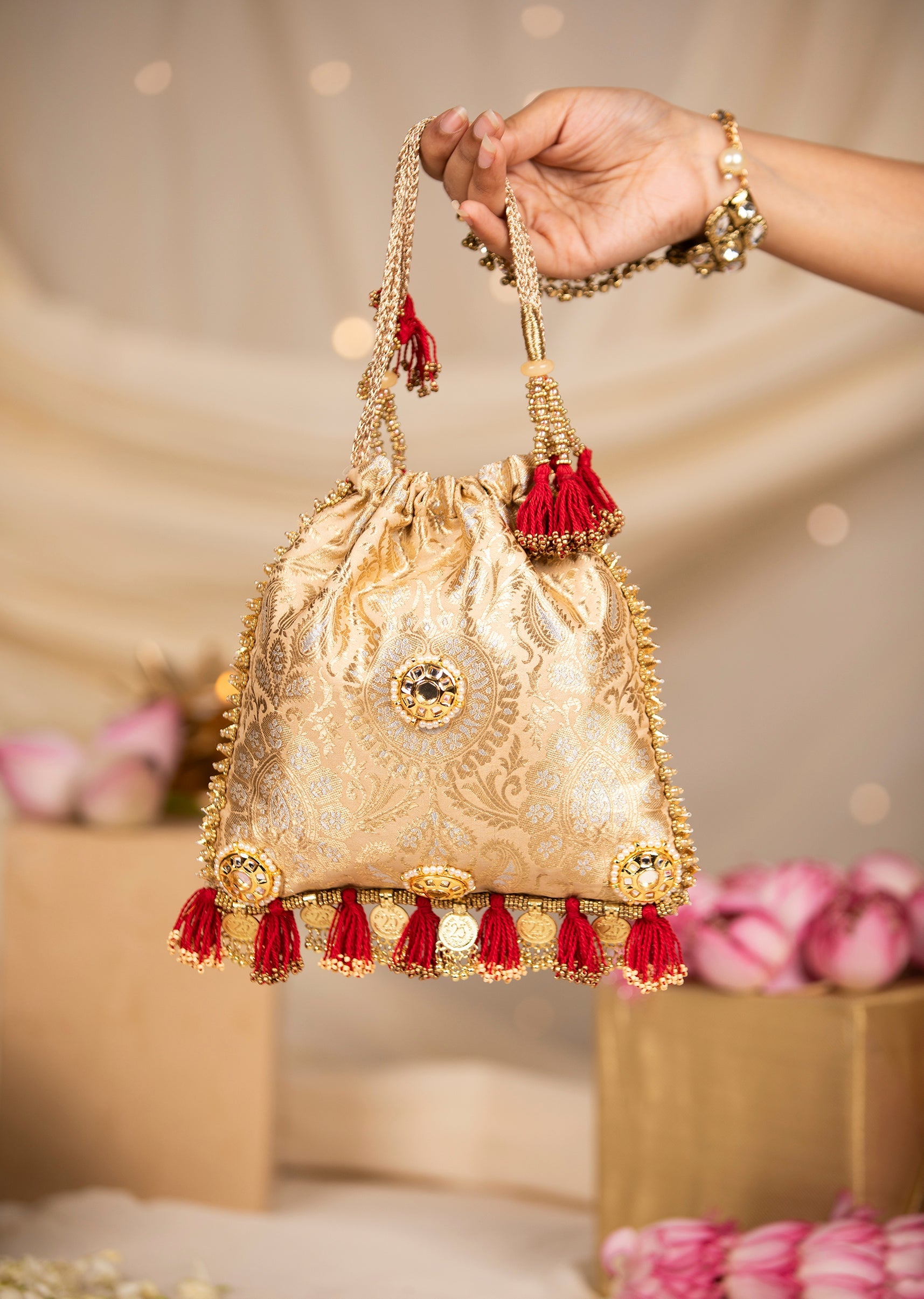 Gold and Red Floral Motif Kundan Embellished Potli Bag