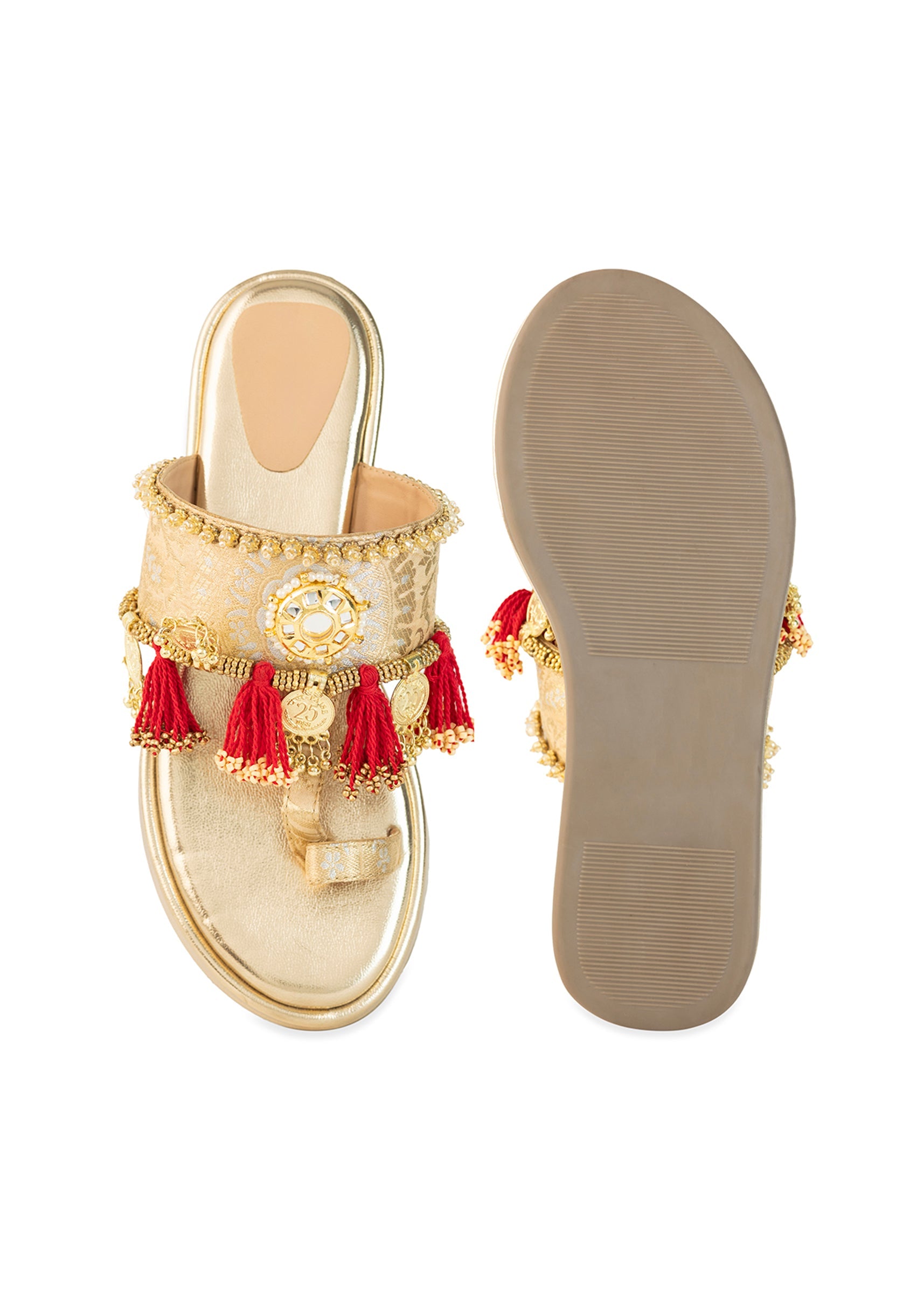 Bring playful festive energy to your look with gold wedges featuring intricate embroidery adorned with mirror highlights, antique coins, and vibrant scarlet tassels that dance with every step. Crafted on... More Product Details