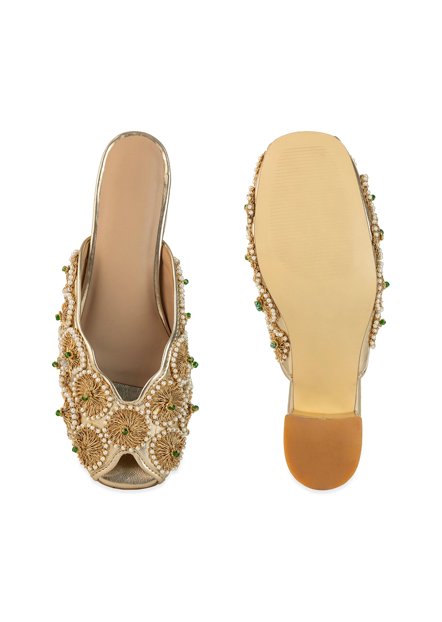 Step into elegance with gold mules featuring intricate floral embroidery crafted in shimmering gold threads and highlighted with delicate green bead accents that add a refreshing pop of color. Set... More Product Details