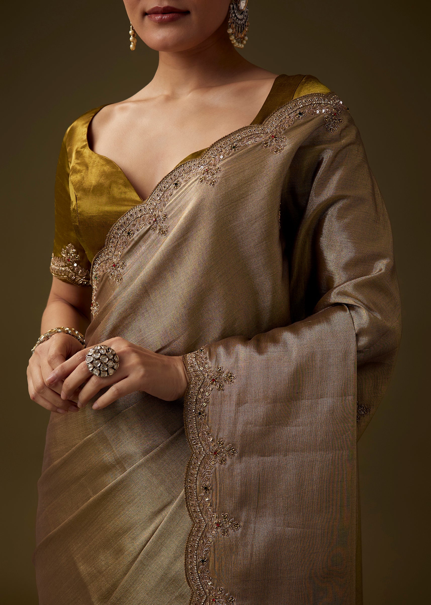 Crafted in elegant tissue silk, this saree features exquisite handwork with a scallop border and shimmering butti embroidery made using cut dana, sequins, beads, and detailed zardosi accents. Its antique... More Product Details