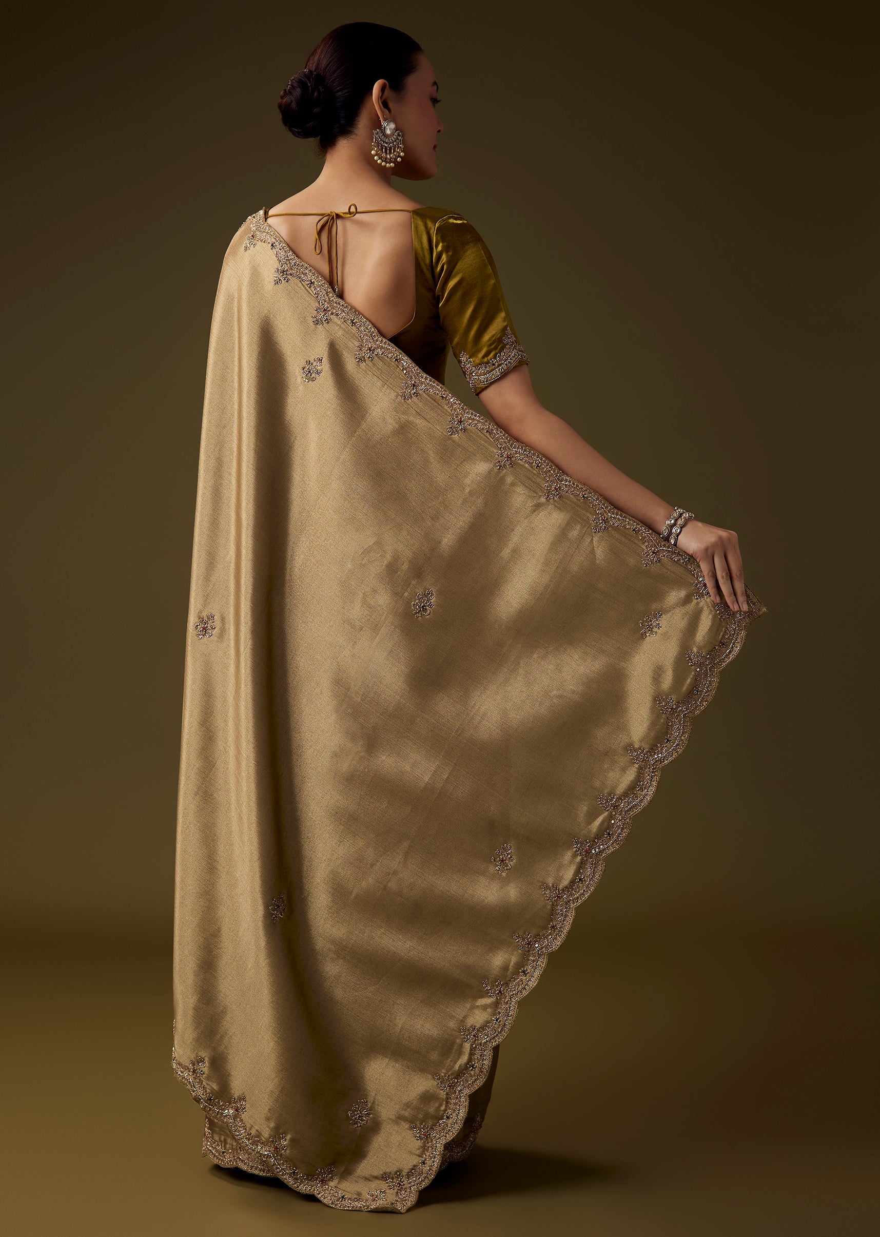 Crafted in elegant tissue silk, this saree features exquisite handwork with a scallop border and shimmering butti embroidery made using cut dana, sequins, beads, and detailed zardosi accents. Its antique gold finish adds a timeless regal charm, making it perfect for weddings, festive rituals, and evening celebrations. The set includes one saree and one unstitched blouse fabric, allowing for graceful custom styling. Awarded as the Most Trusted Brand, we're delivering styles you love, just as promised.