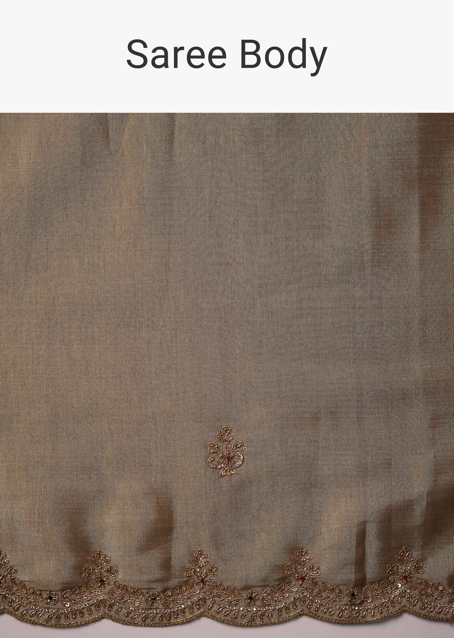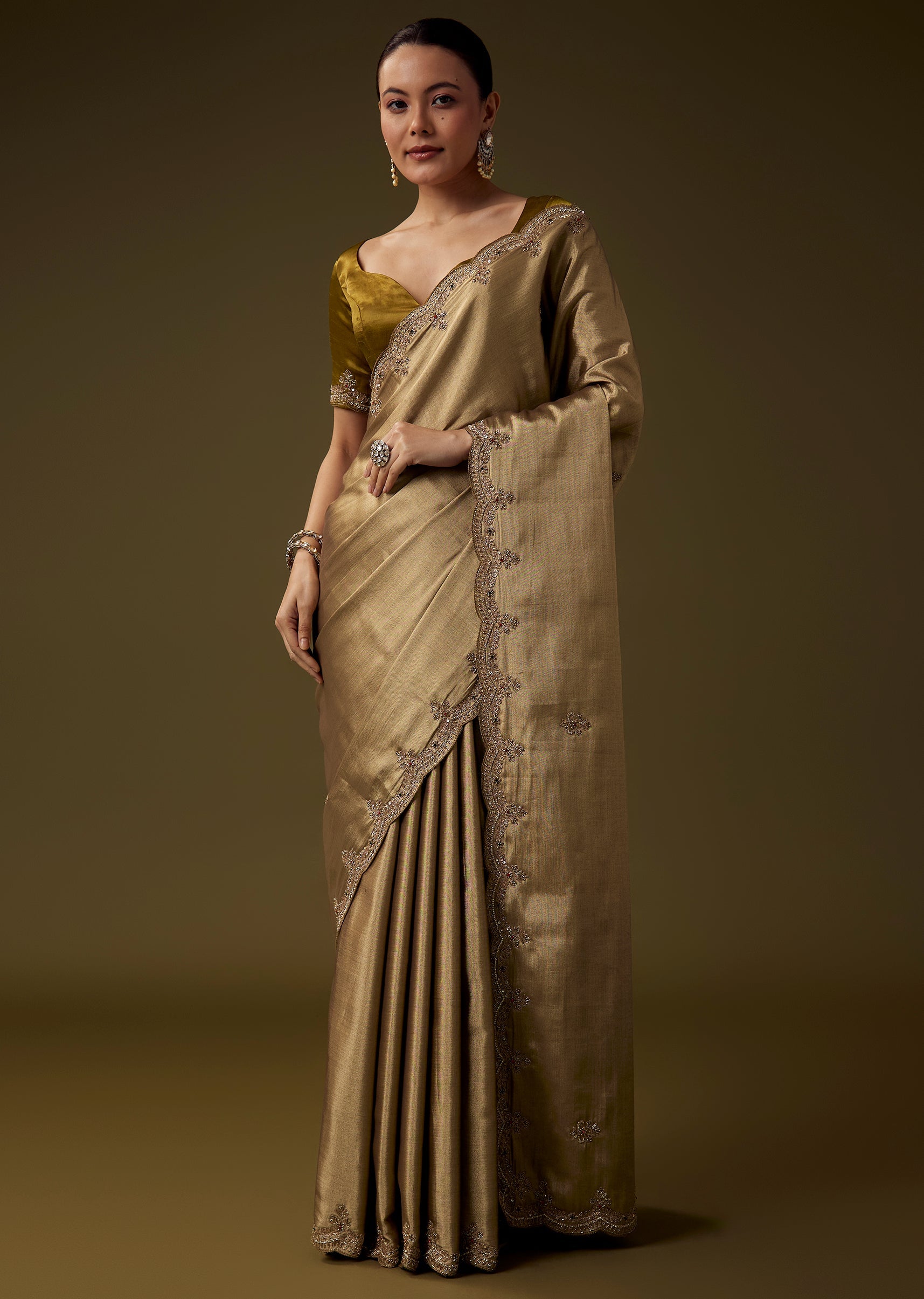 Crafted in elegant tissue silk, this saree features exquisite handwork with a scallop border and shimmering butti embroidery made using cut dana, sequins, beads, and detailed zardosi accents. Its antique gold finish adds a timeless regal charm, making it perfect for weddings, festive rituals, and evening celebrations. The set includes one saree and one unstitched blouse fabric, allowing for graceful custom styling. Awarded as the Most Trusted Brand, we're delivering styles you love, just as promised.