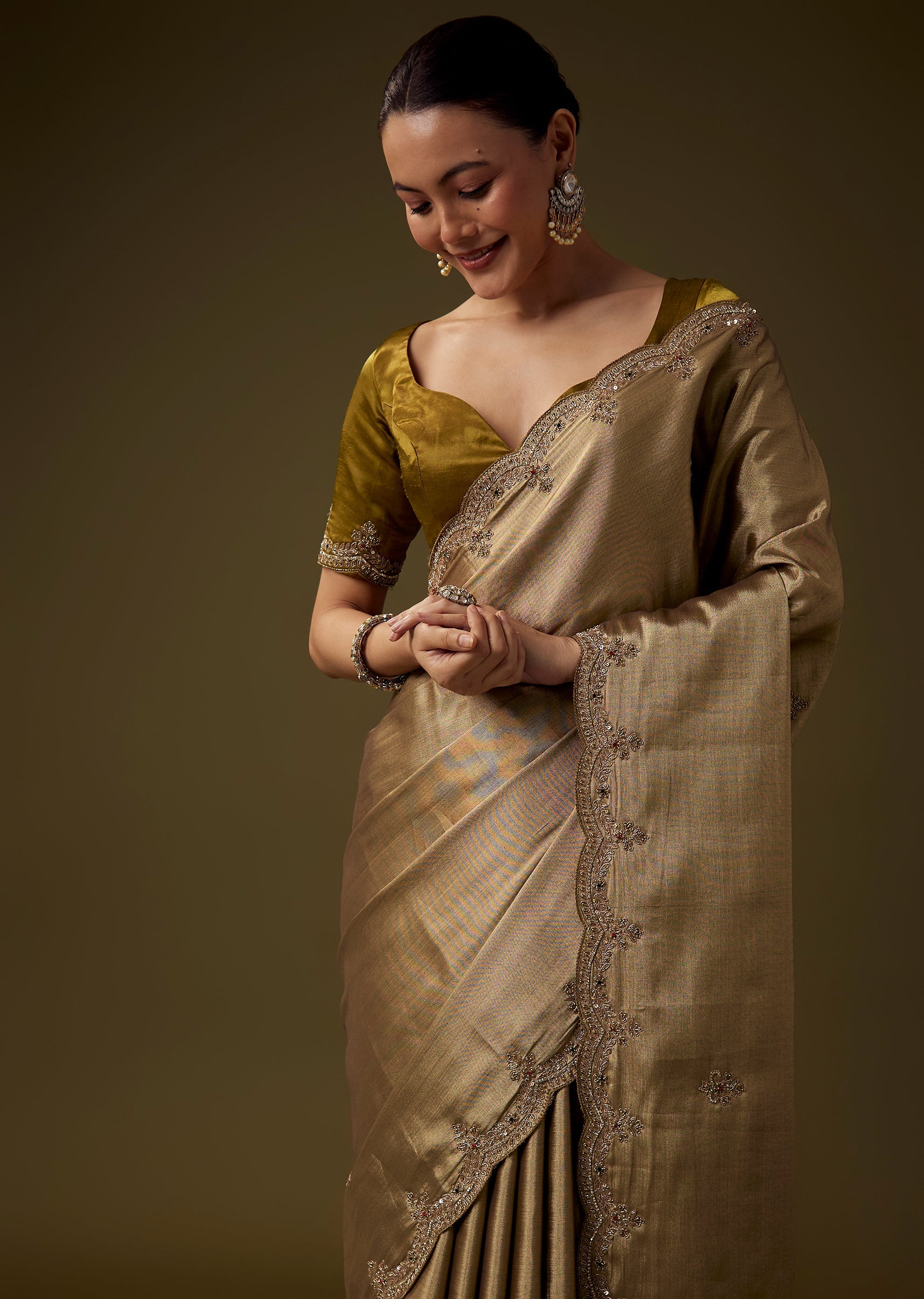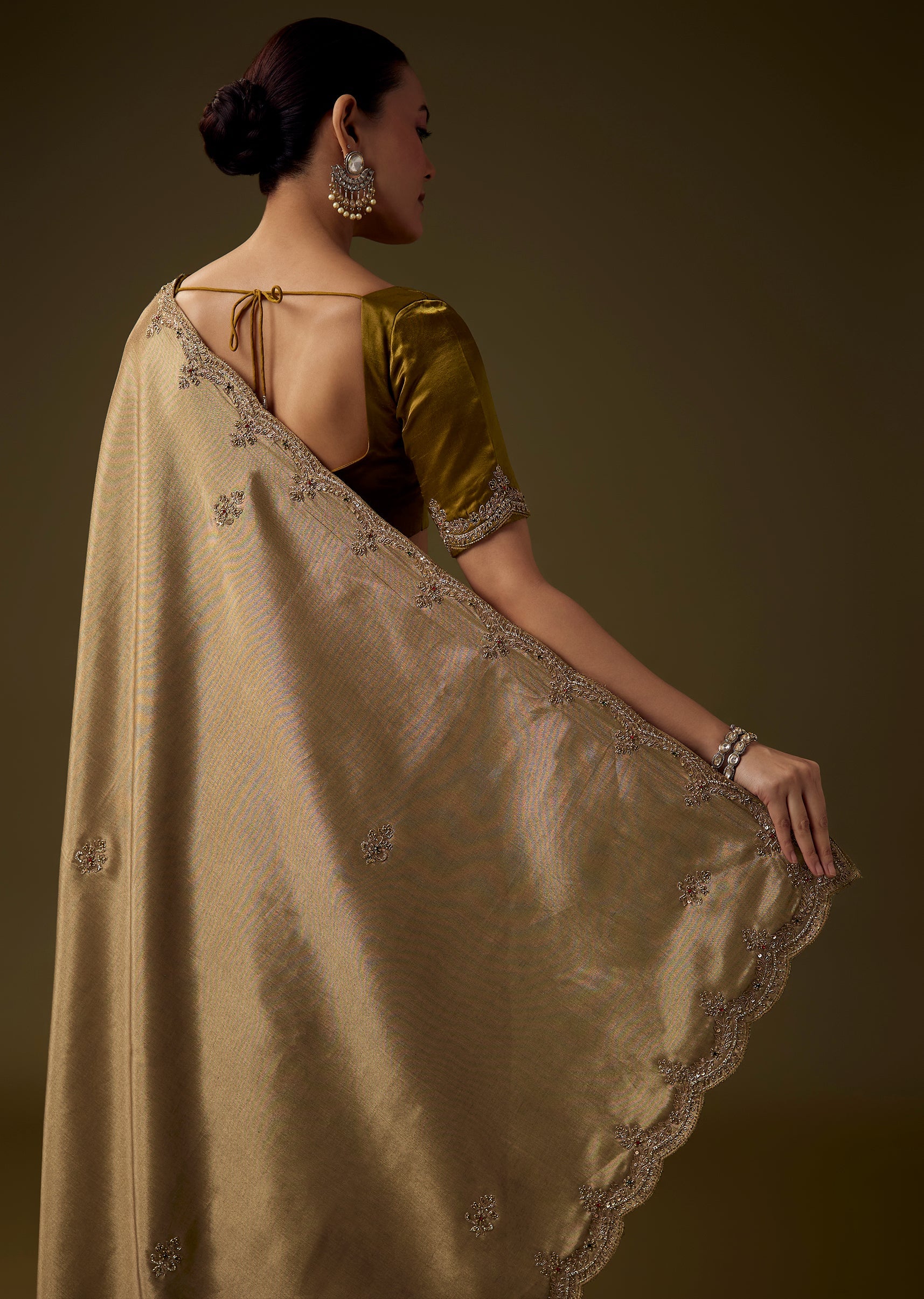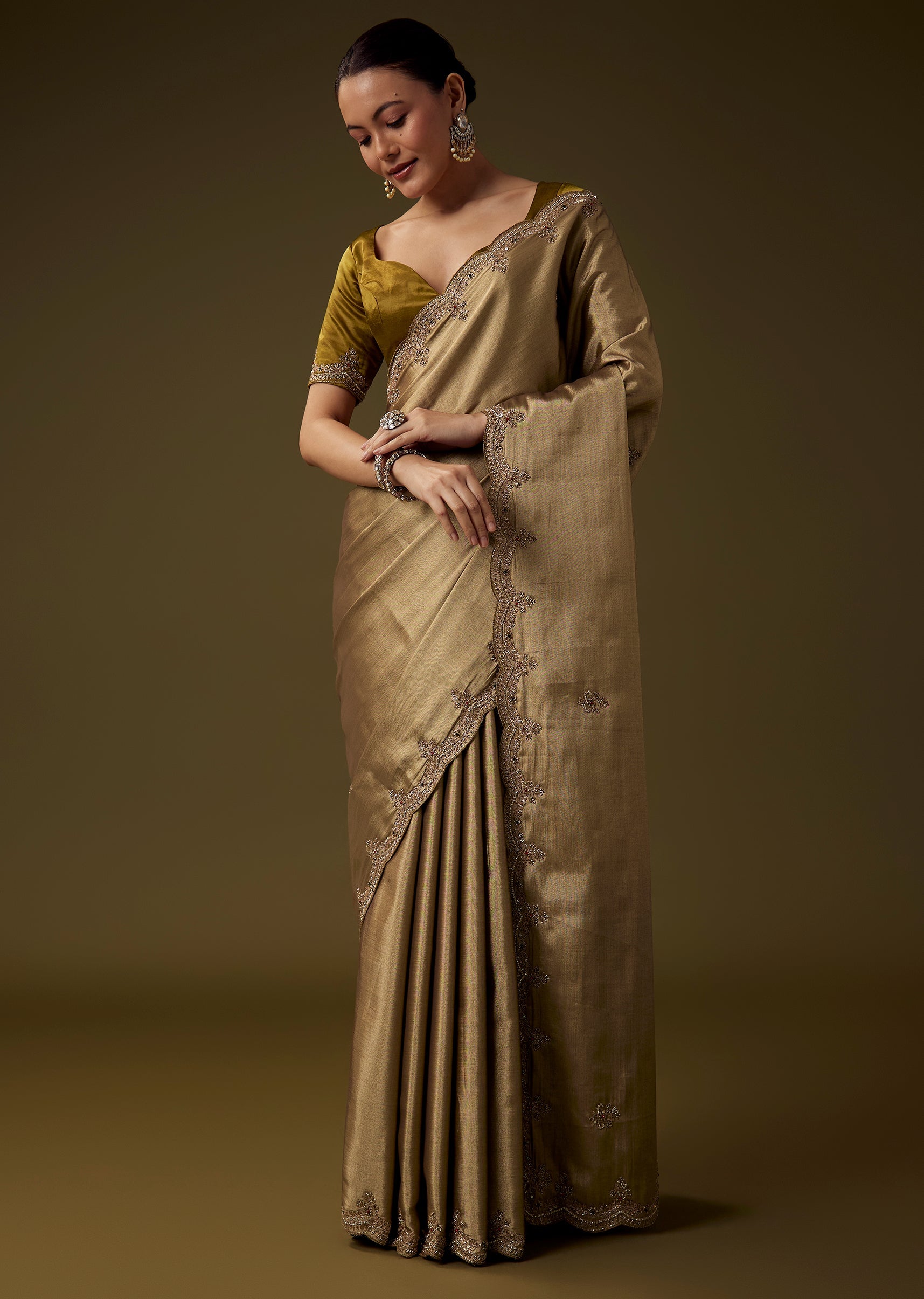 Enhance its rich golden glow with heritage gold jewelry, defined eyes, and a classic bun or soft waves.