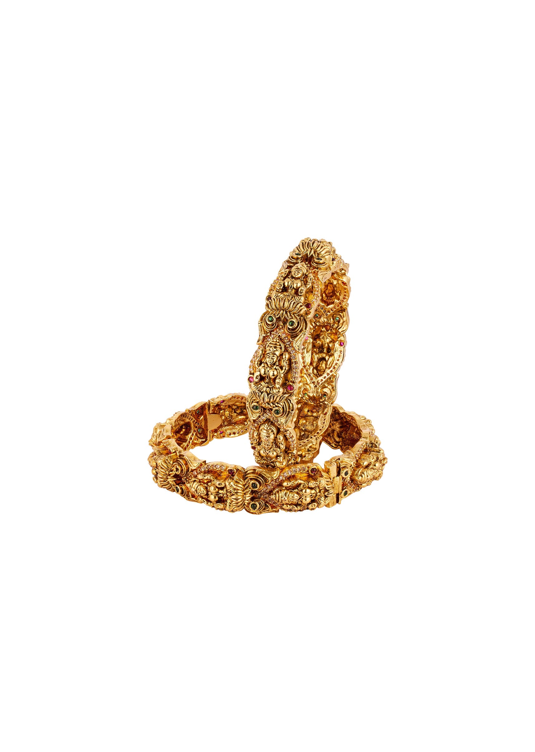 A striking bangle in a radiant gold finish featuring finely detailed temple motifs highlighted with green and pink simulated stones. The colourful accents create a lively and festive appeal, perfect... More Product Details