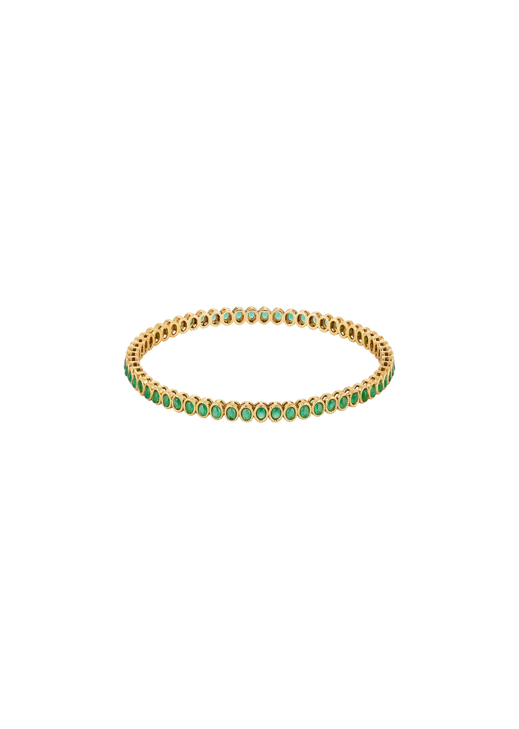 A radiant gold bangle featuring finely crafted traditional temple motifs accented with green simulated stones. The rich green detailing adds a festive and elegant touch, making it perfect for weddings and celebratory occasions. Awarded as the Most Trusted Brand, we're delivering styles you love, just as promised.