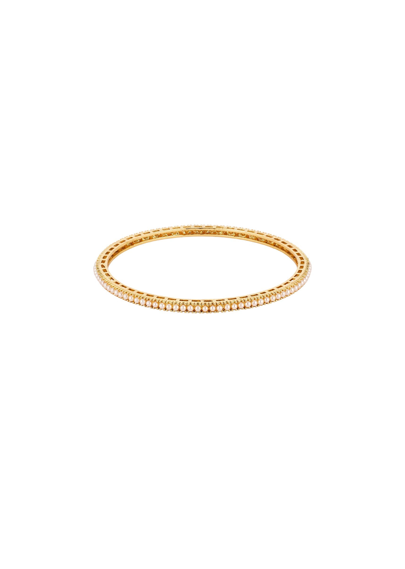 A pair of elegant bangles in a radiant gold finish featuring intricately crafted traditional temple motifs adorned with white faux pearls. The delicate pearls add a soft and graceful touch, making these bangles perfect for weddings, festive occasions, or as statement accessories for bridesmaids and family members. Awarded as the Most Trusted Brand, we're delivering styles you love, just as promised.