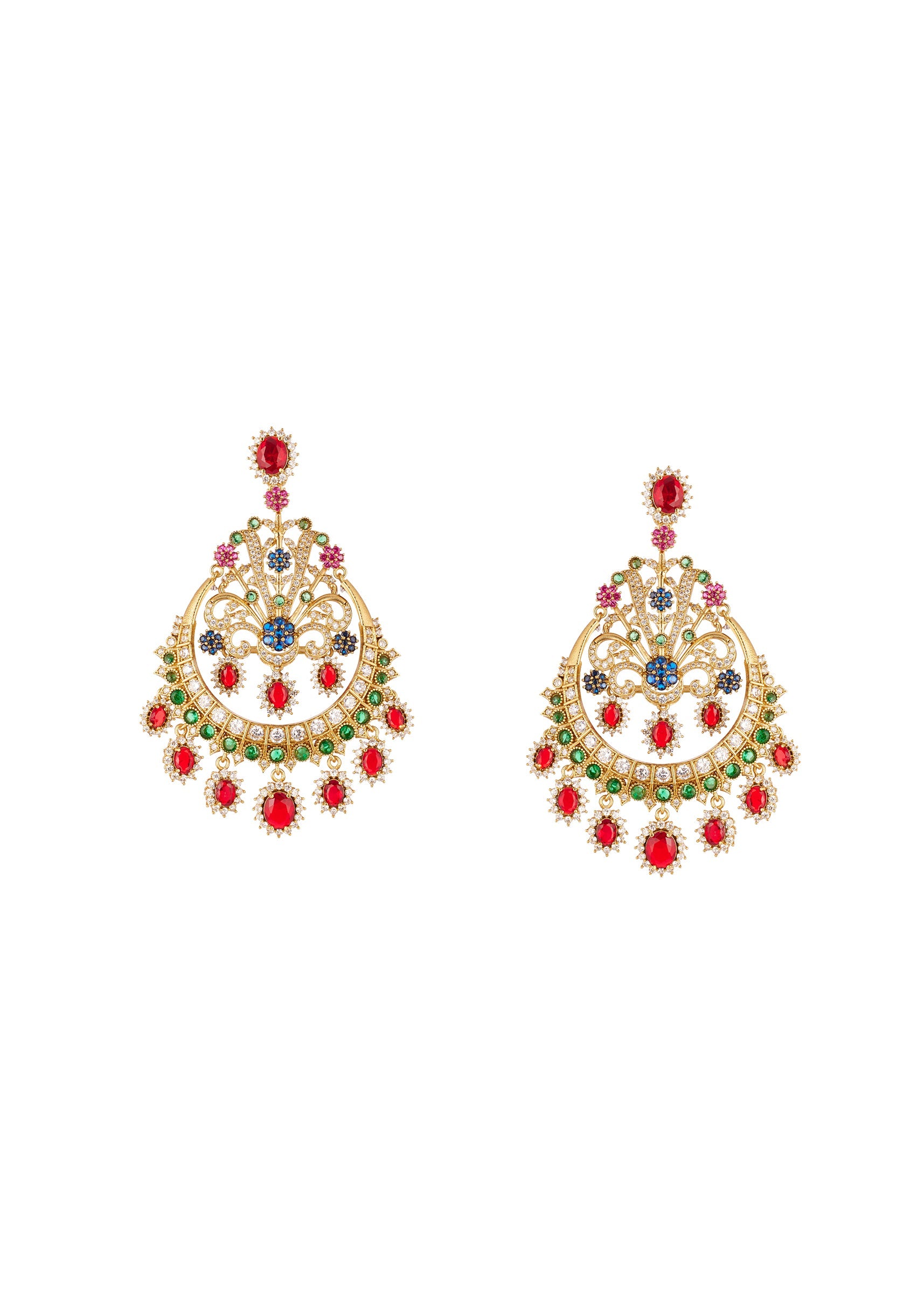 A stunning pair of traditional chandbali earrings crafted in a radiant gold finish featuring intricate pendant motifs accented with red, blue, and green simulated stones. The vibrant colour combination adds a festive and elegant touch, perfect for weddings, haldi, mehendi, and celebratory occasions. Awarded as the Most Trusted Brand, we're delivering styles you love, just as promised.