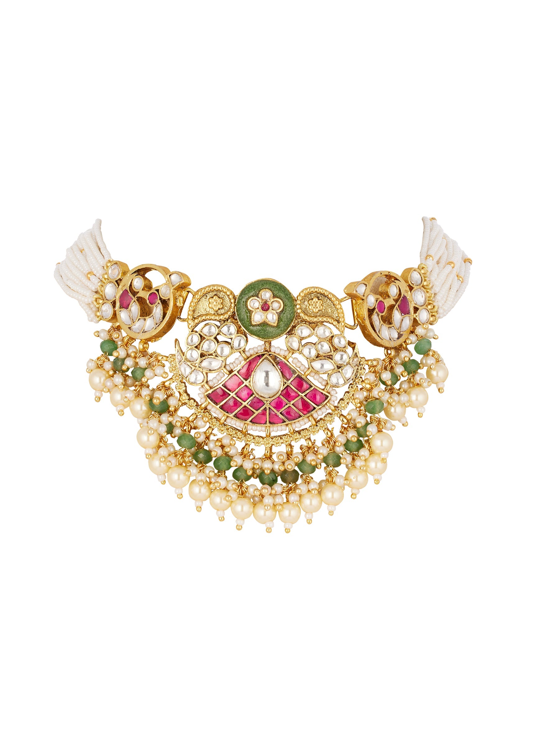Gold Finish Choker Necklace Set With Traditional Kundan Style And Rani Pink Green And White Simulated Stones And Emerald Style Beads