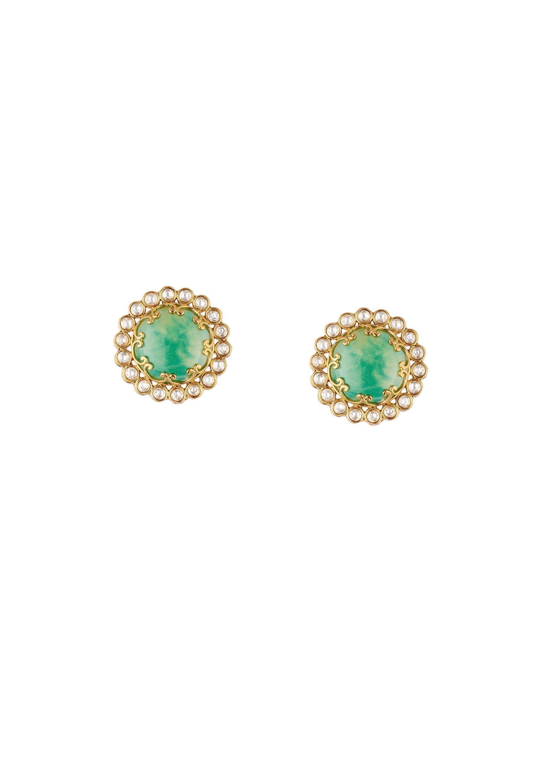 A traditional pair of circular stud earrings crafted in a rich gold finish, featuring a large green central stone surrounded by a polki style halo. The design highlights intricate detailing and classic festive charm, making it an elegant choice for weddings and celebrations. Awarded as the Most Trusted Brand, we're delivering styles you love, just as promised.