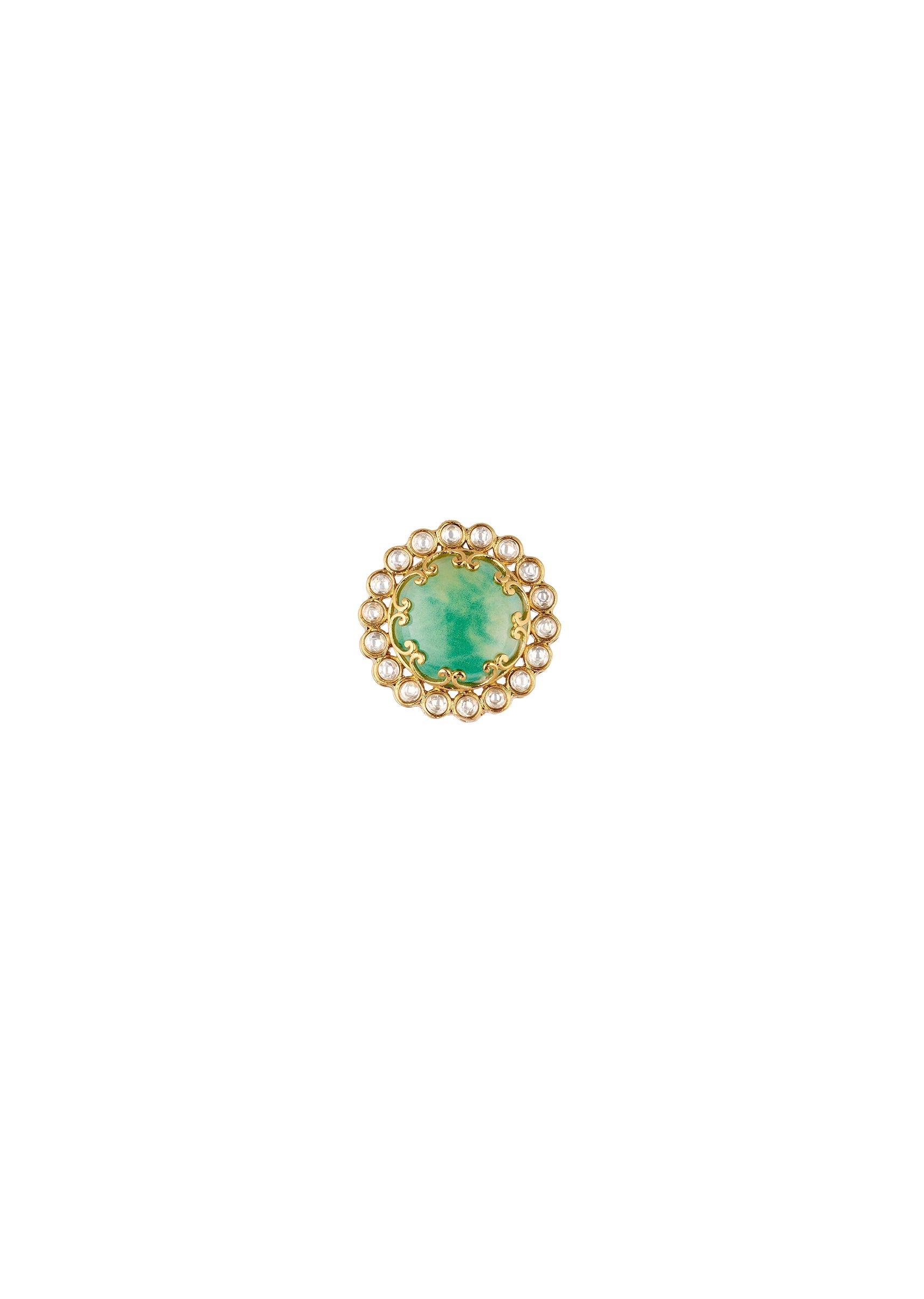 A traditional pair of circular stud earrings crafted in a rich gold finish, featuring a large green central stone surrounded by a polki style halo. The design highlights intricate detailing... More Product Details