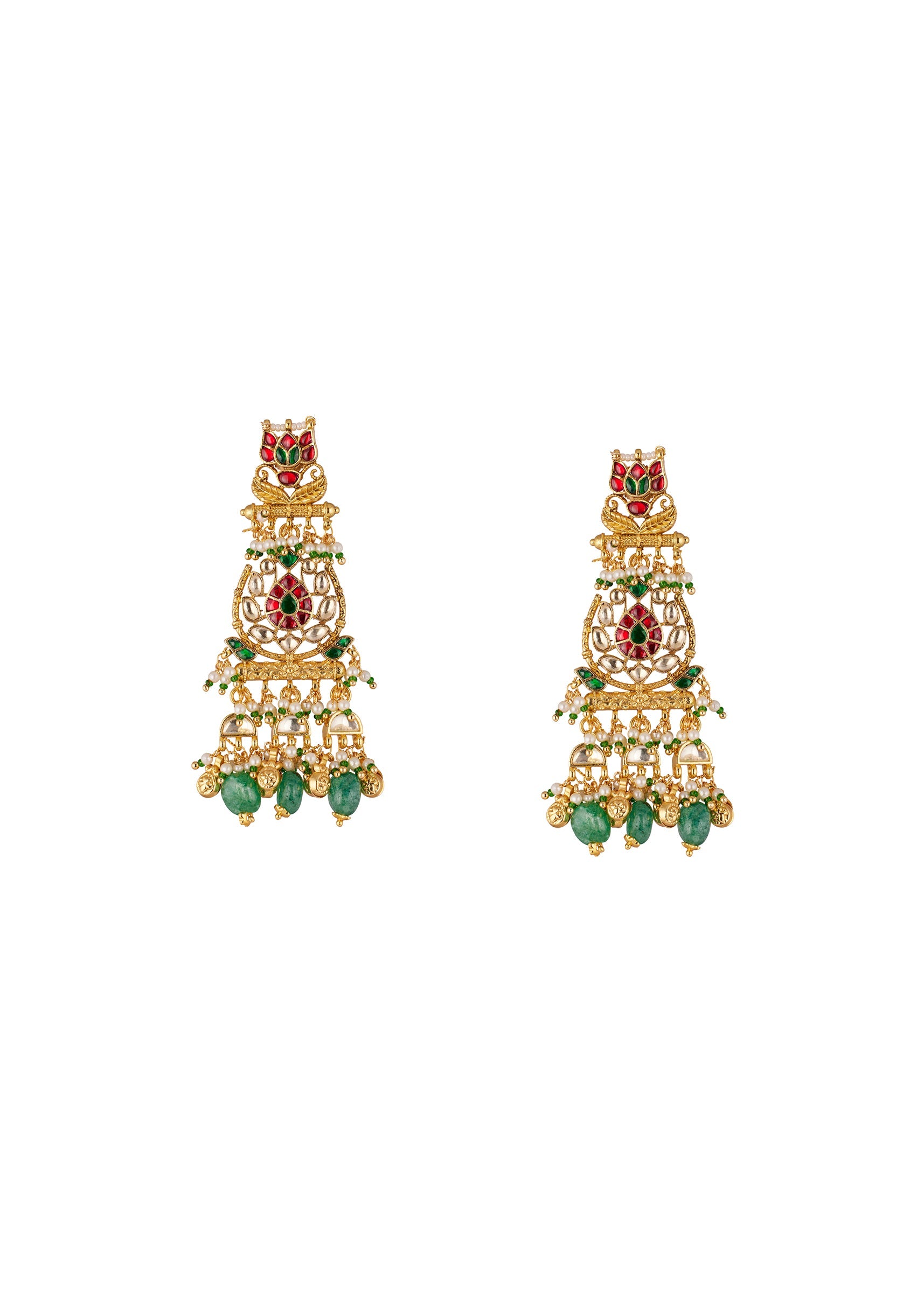 A vibrant celebration of traditional Indian craftsmanship, these gold finish earrings feature uncut Kundan set with multi colored stones including ruby and emerald tones. Delicate pearl beadwork adds a graceful finishing touch enhancing the festive charm. Handcrafted with precision, the earrings are perfect for Mehendi celebrations or attending weddings as a guest. They combine traditional artistry with a playful yet elegant look making them a statement accessory for any festive occasion. Awarded as the Most Trusted Brand, we're delivering styles you love, just as promised.
